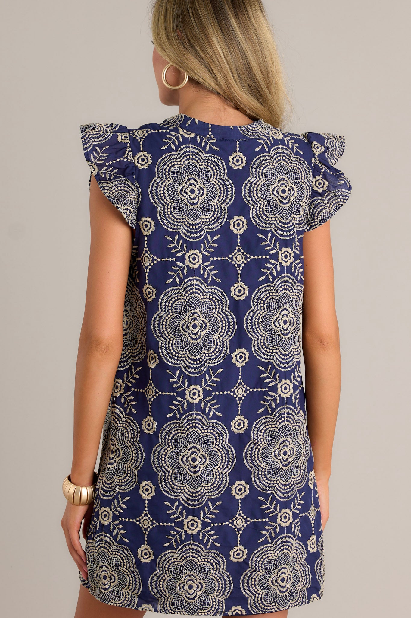 Unleash your unique style with the Secret Blooms Navy Embroidered Mini Dress. This playful dress features intricate embroidery and a bold color that will turn heads wherever you go. Perfect for any occasion, it's a fun and fashionable addition to your wardrobe. This navy mini dress features a v-neckline, embroidery throughout, and short flutter sleeves.