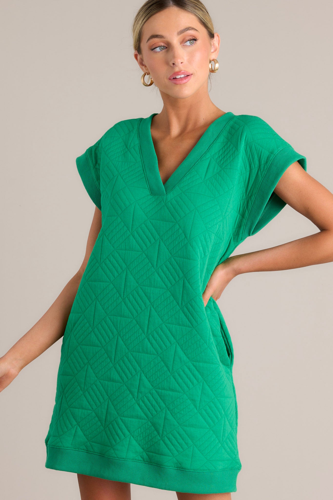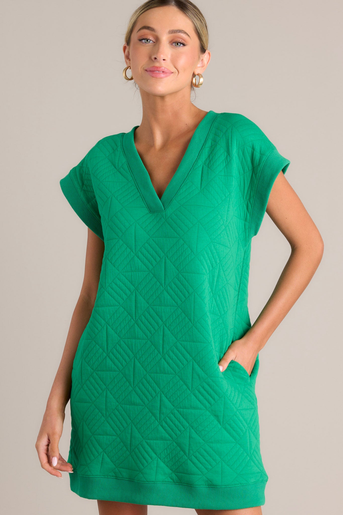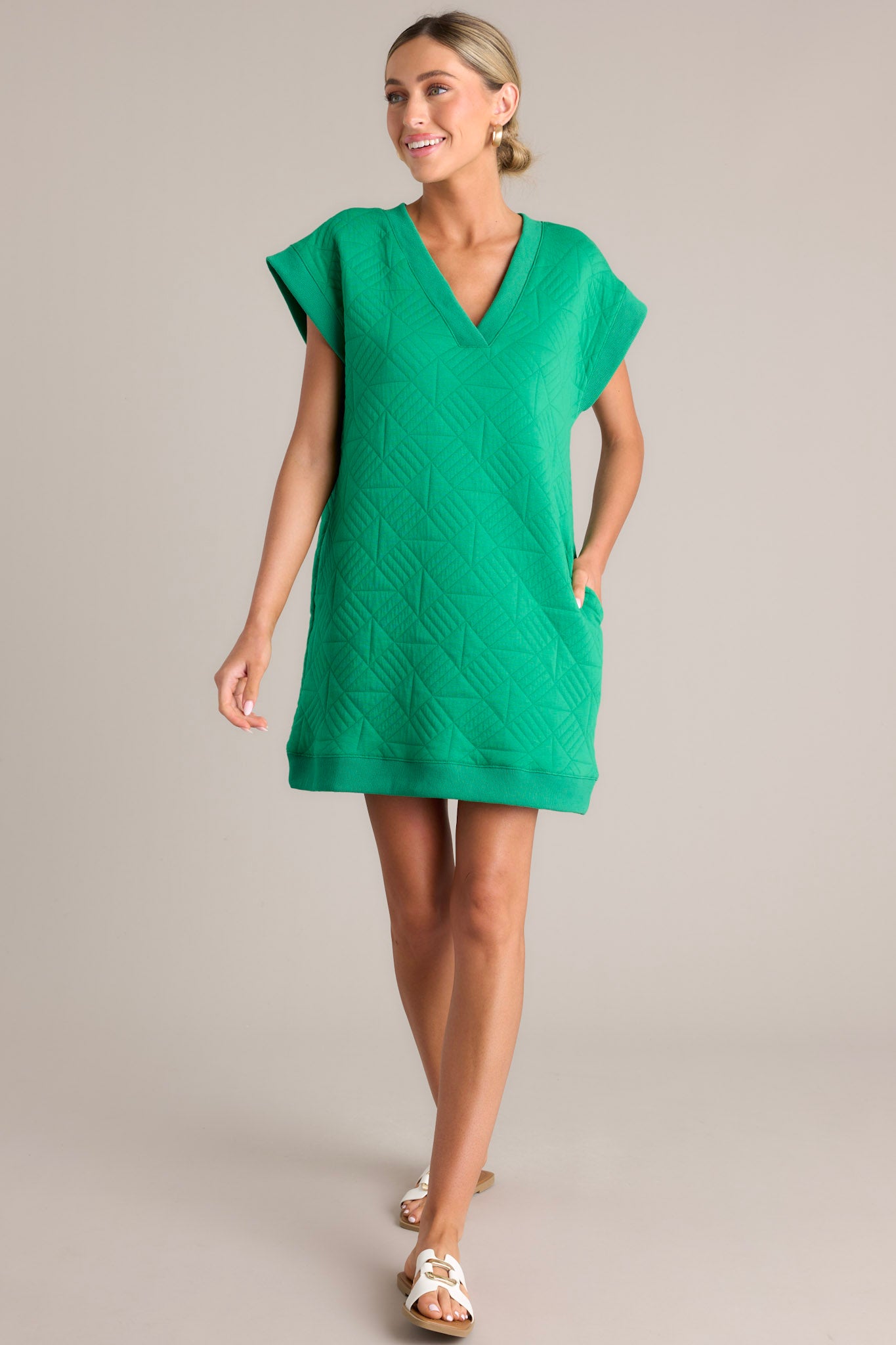 Get ready to turn heads with the Serene Shades Kelly Green Cap Sleeve Mini Dress. Featuring a gorgeous green color and flirty cap sleeves, this dress is perfect for any casual occasion. Feel confident and stylish with this mini dress that will make you stand out from the crowd. This kelly green mini dress features a v-neckline, a fully quilted fabric, functional hip pockets, and flattering cap sleeves.
