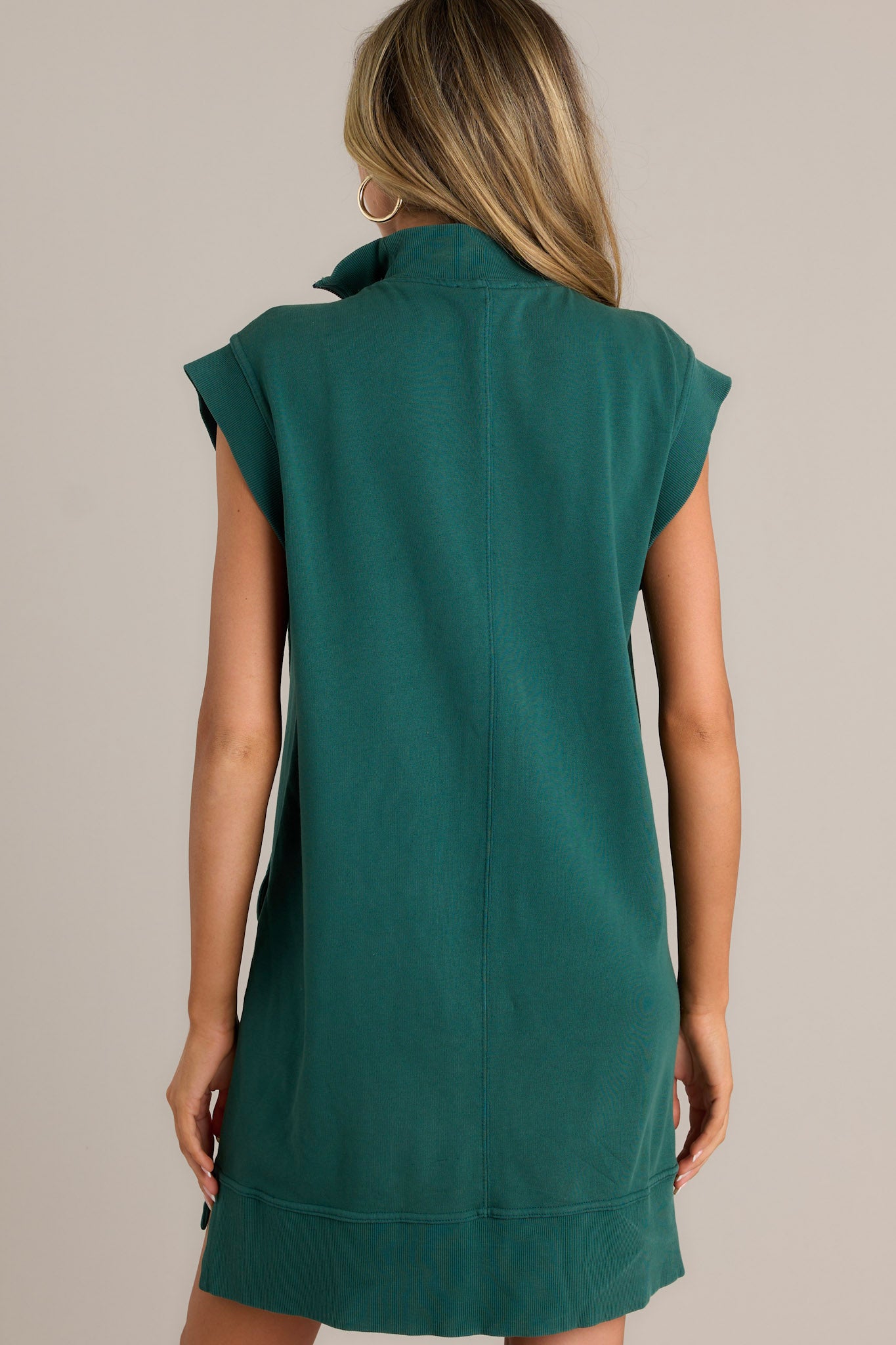 Elevate your style with the Shadowed Splendor Hunter Green Mini Dress. Made with green-colored fabric, this dress exudes a mysterious and edgy look. The mini length adds a touch of playfulness, perfect for a night out or a fun event. Unleash your inner fashionista with this uniquely stylish dress. This hunter green mini dress features a collared v-neckline, a functional zipper front, ribbed detailing, functional front pockets, a split hemline, a wide ribbed sleeves.
