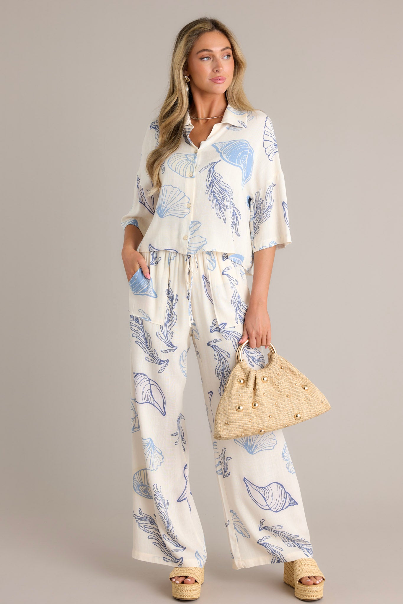 Shell-abrate your style with our Shoreline Seashell Blue Tropical Print Top. Featuring a playful seashell print, this top brings a touch of whimsy to any outfit. Perfect for a day at the beach or a casual day out, you'll be making waves with this top! This top features a collared neckline, a full button front, a seashell print on lightweight fabric, and a slightly cropped length.