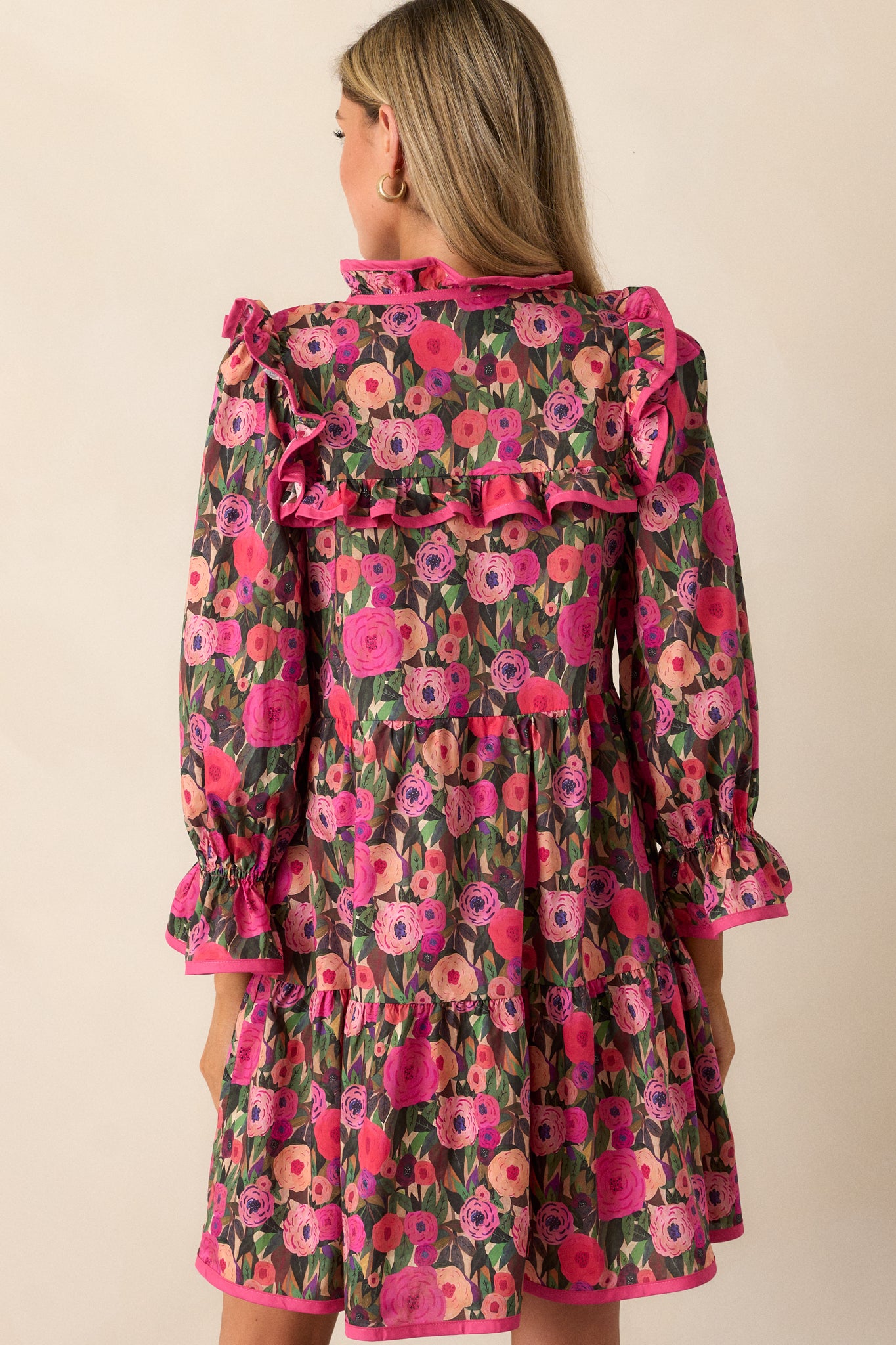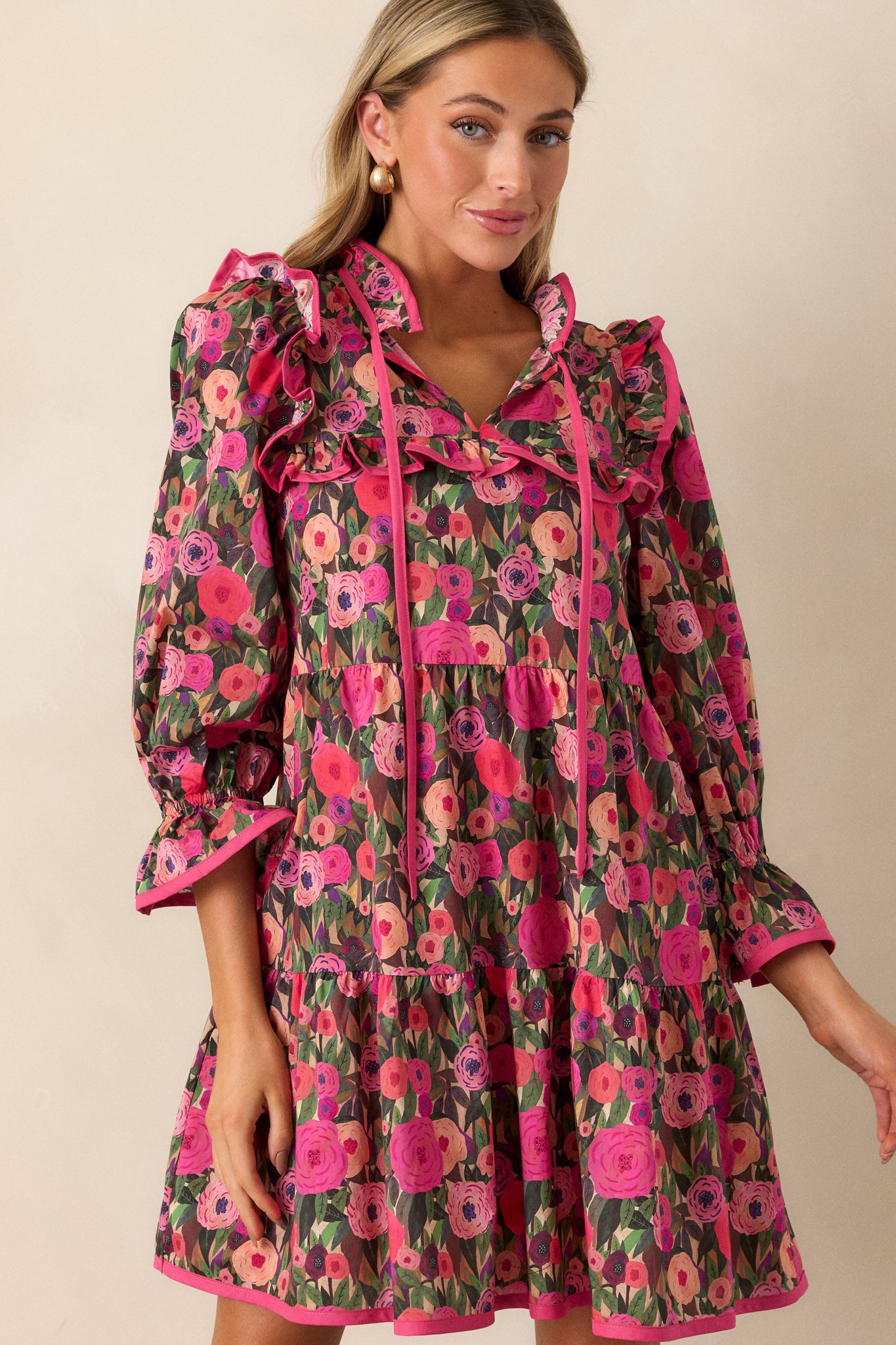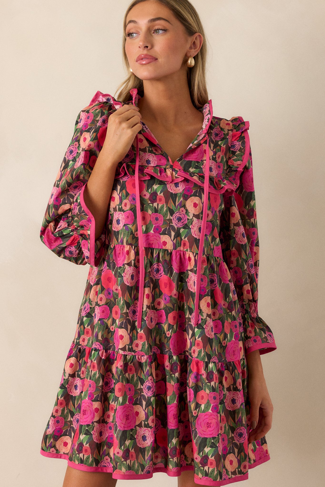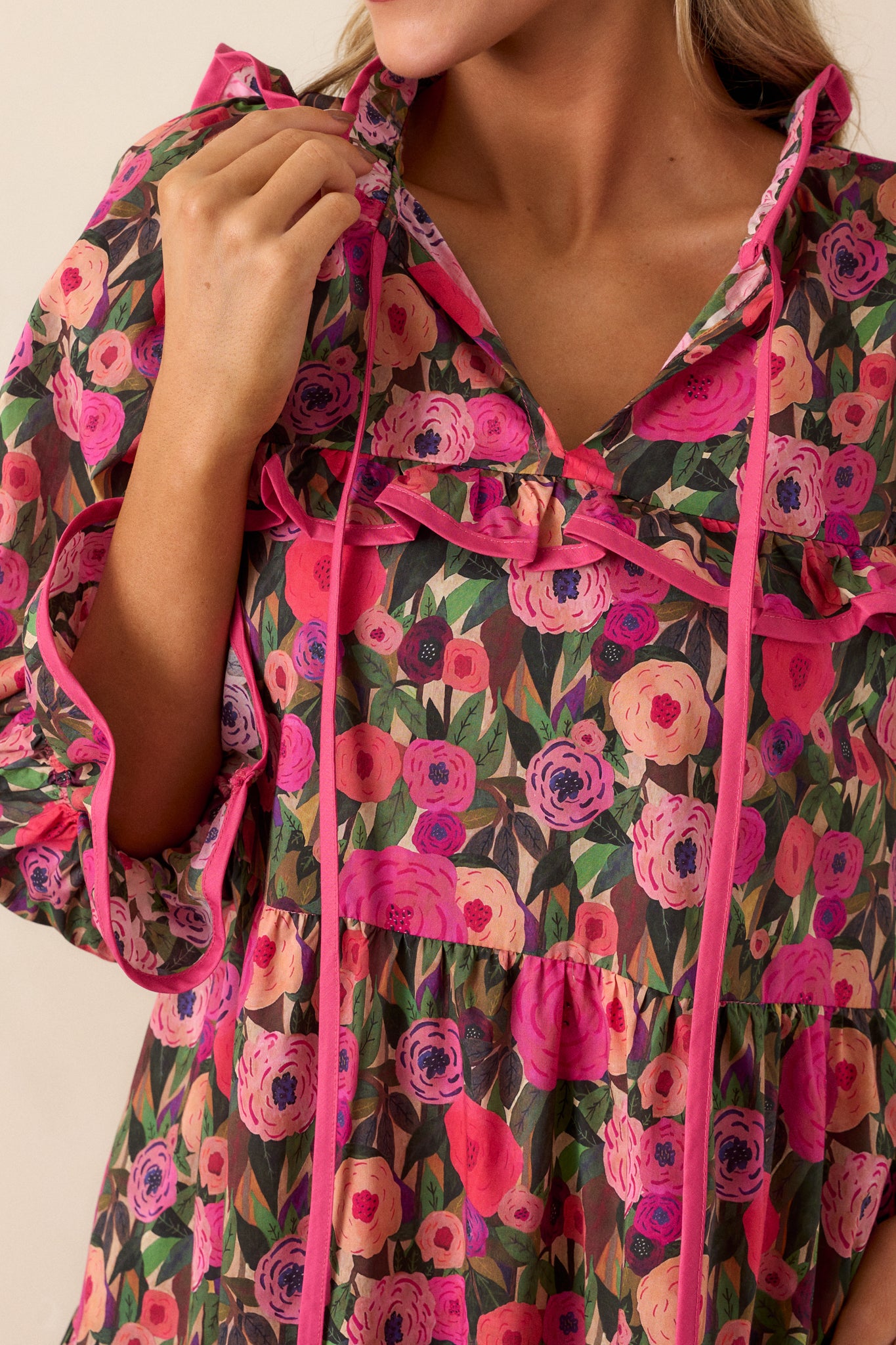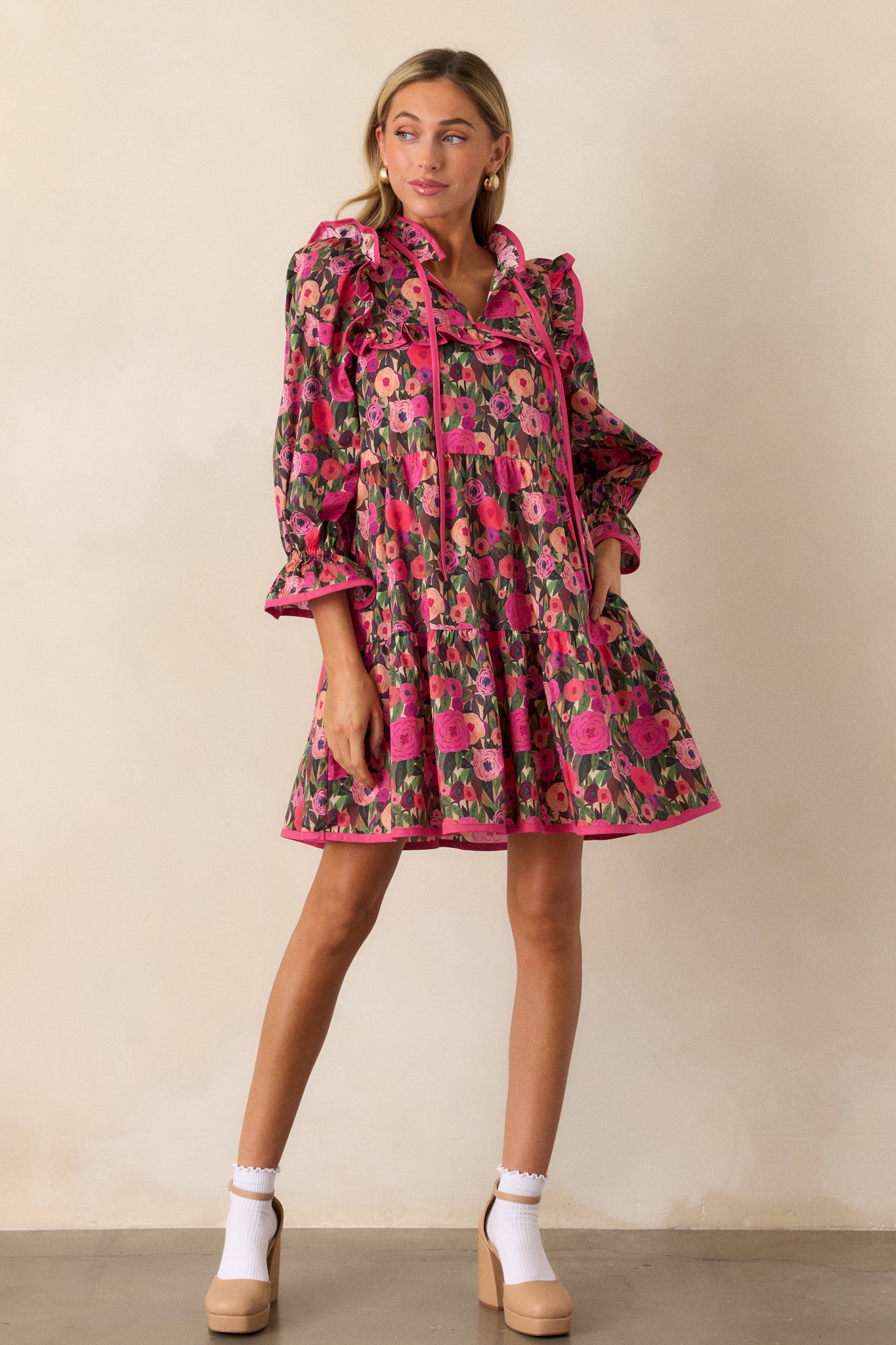 This Silken Breeze 100% Cotton Pink Floral Mini Dress offers both comfort and style. Made with soft and breathable cotton, this dress is perfect for any occasion. The delightful pink floral pattern adds a touch of femininity, making it a must-have for your wardrobe. Stay cool and chic all day long in this mini dress. This pink mini dress features a ruffled collar with a tie accent, a ruffled shoulder and yoke detail, a-line cut, functional hip pockets, a beautiful floral print, pink seams, and long sleeves with ruffle cuff detailing.