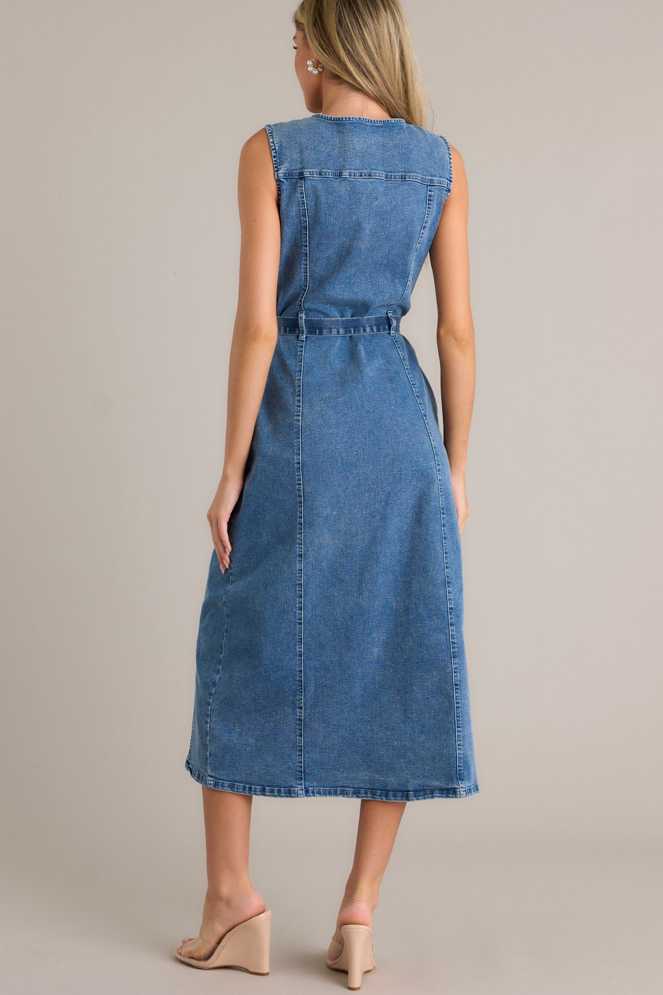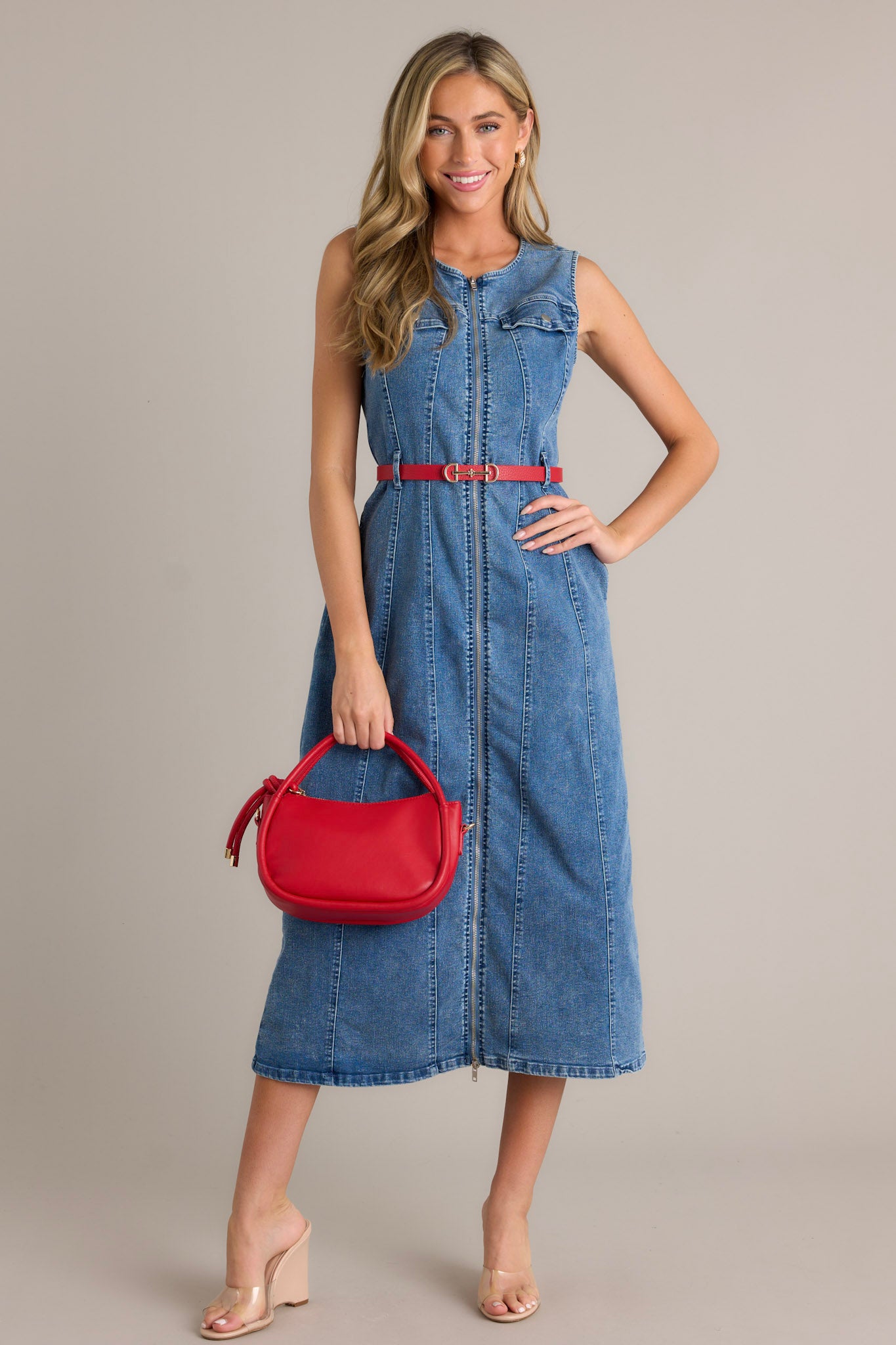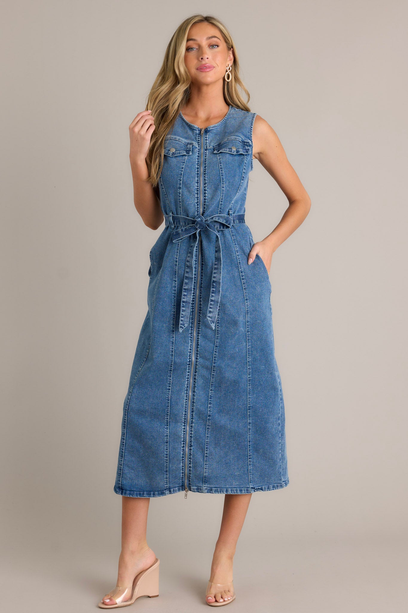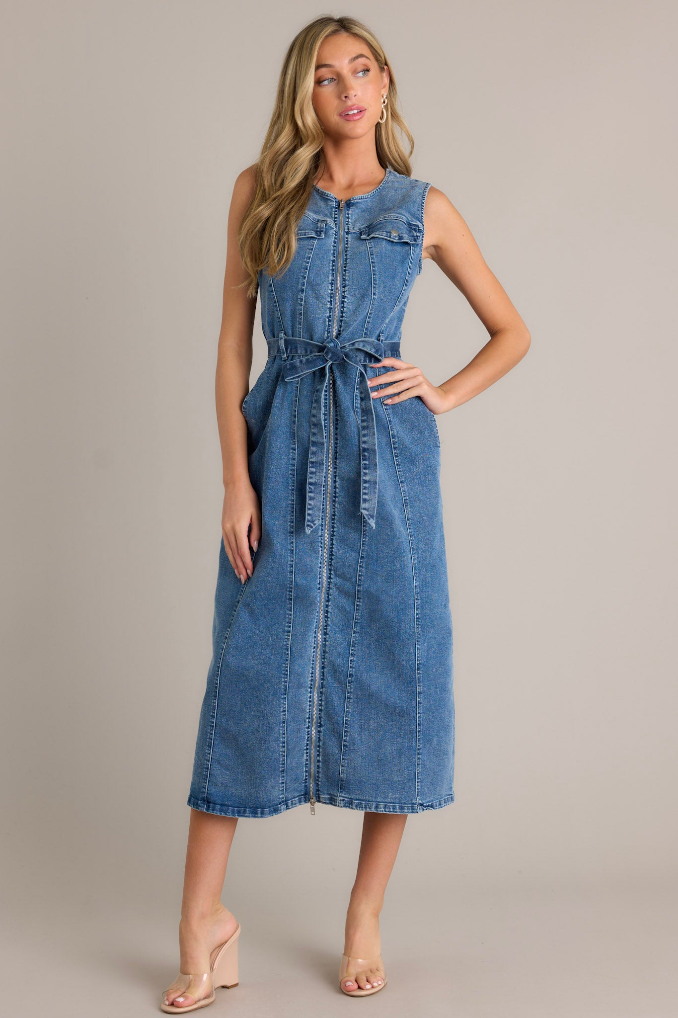 Rev up your wardrobe with the Simple Grace Denim Sleeveless Midi Dress. This dress is the perfect combination of edgy and feminine, featuring a timeless denim design and a flattering midi length. Dare to stand out and turn heads in this bold dress that effortlessly exudes confidence and style. This denim dress features rounded neckline, a functional front zipper, faux chest pockets, functional hip pockets, a self-tie denim drawstring belt and a sleeveless design.