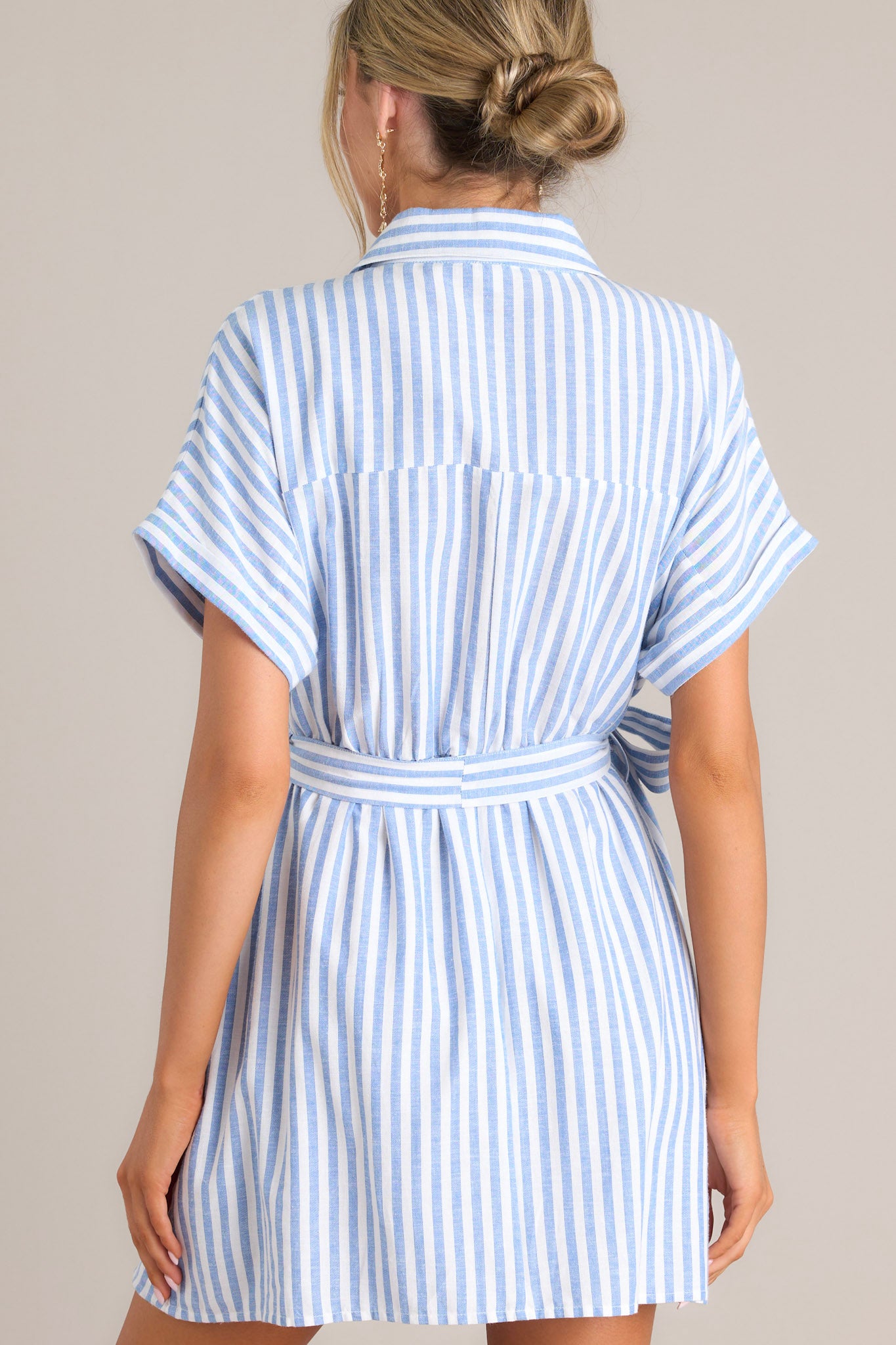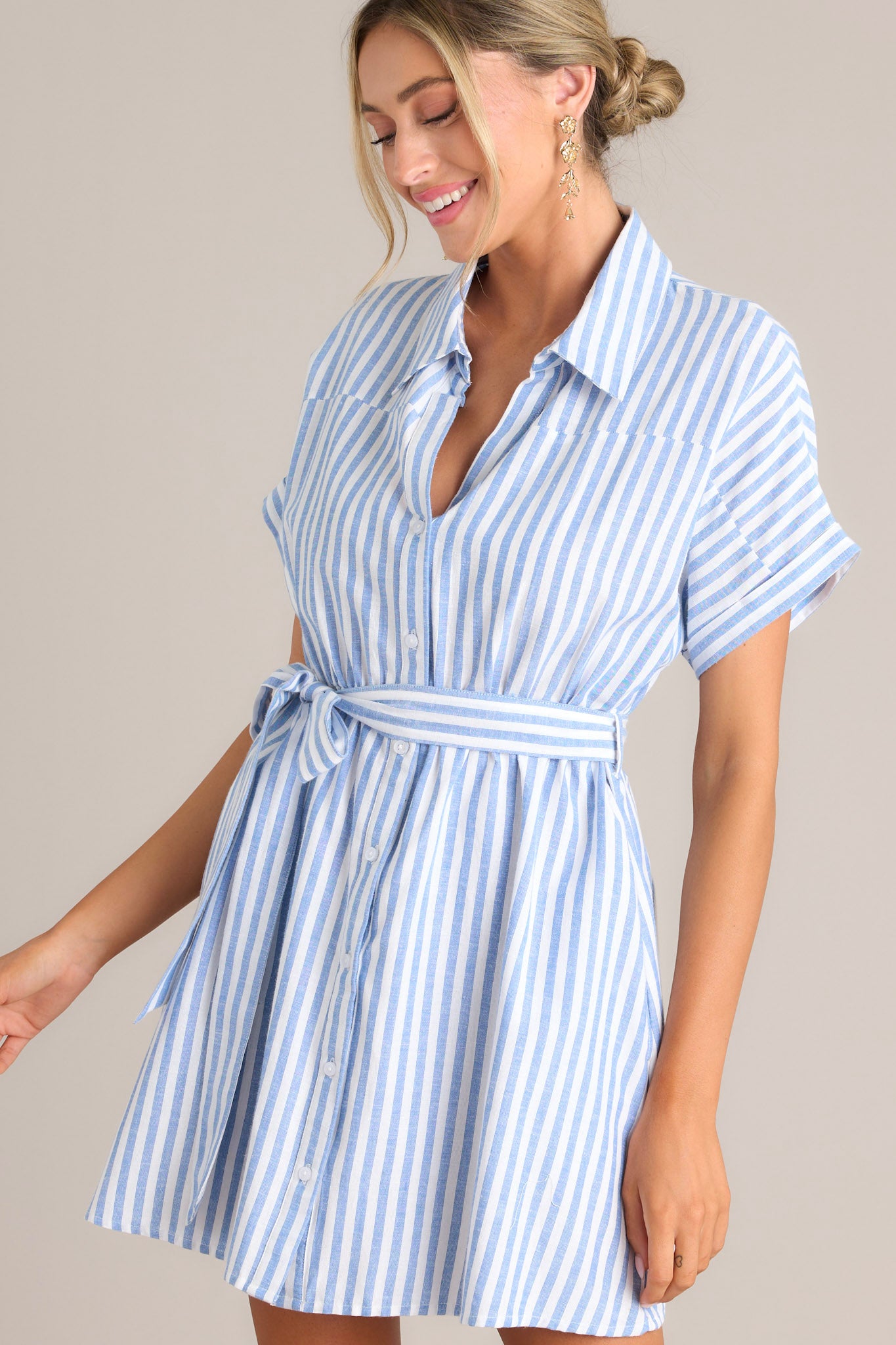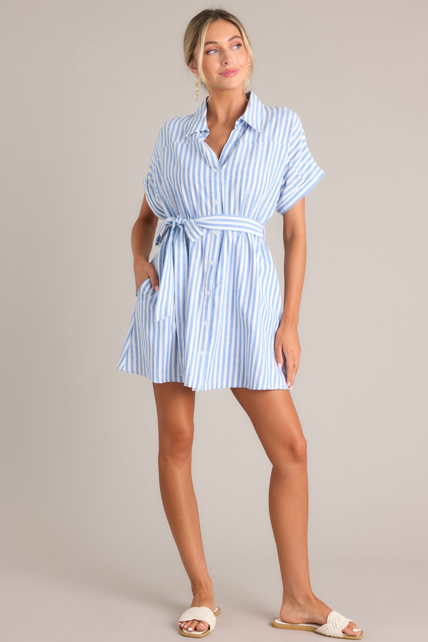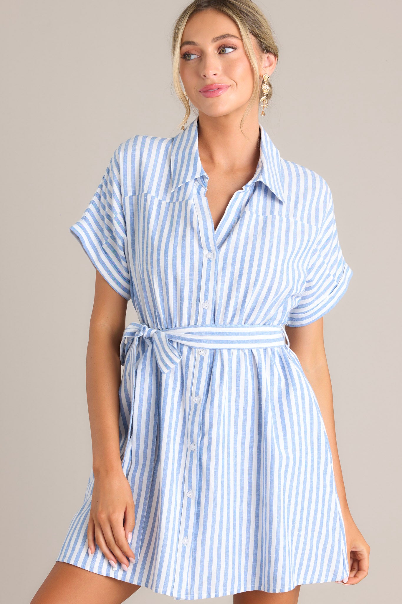 Introducing the Simple Moments Blue & White Stripe Button Front Mini Dress - the perfect combo of style and comfort! With its button front and mini length, this dress is both chic and practical. Get ready to turn heads with this playful addition to your wardrobe! This dress features a collared v-neckline, a full button front, an elastic waistband, a self-tie belt, functional pockets, and folded sleeves.