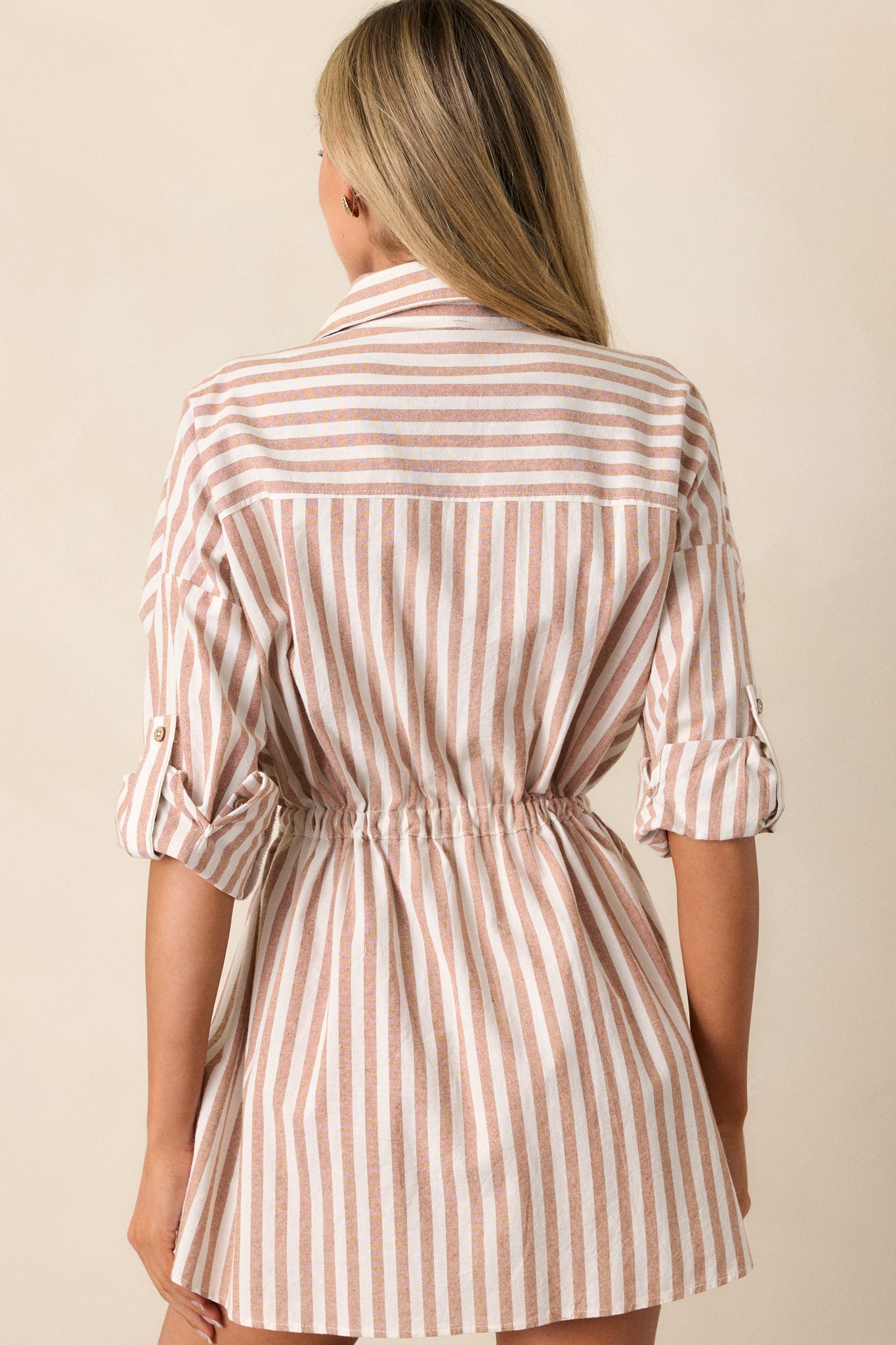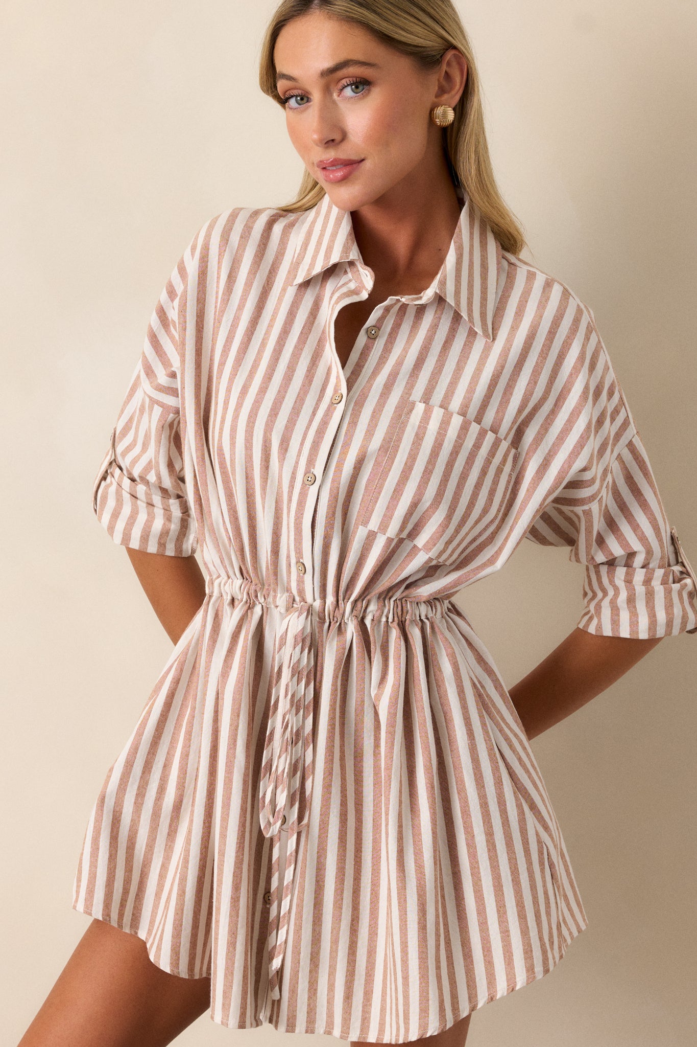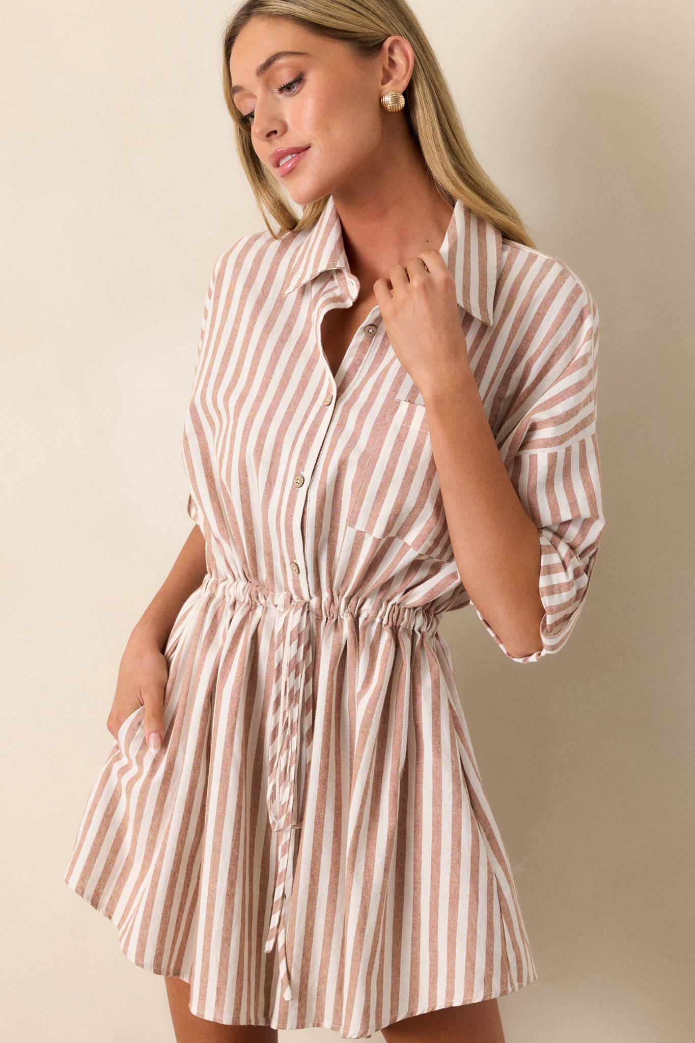 Indulge in the understated elegance of the Simple Pleasures Camel Brown Stripe Mini Dress. This versatile dress features a sleek stripe pattern and a beautiful camel brown shade that can take you from day to night with ease. The perfect combination of style and comfort, this dress will be your go-to for any occasion. This stripe mini dress features a collared neckline, a full button front, a breast pocket, a self-tie drawstring waist, functional hip pockets, and button cuffed sleeves.