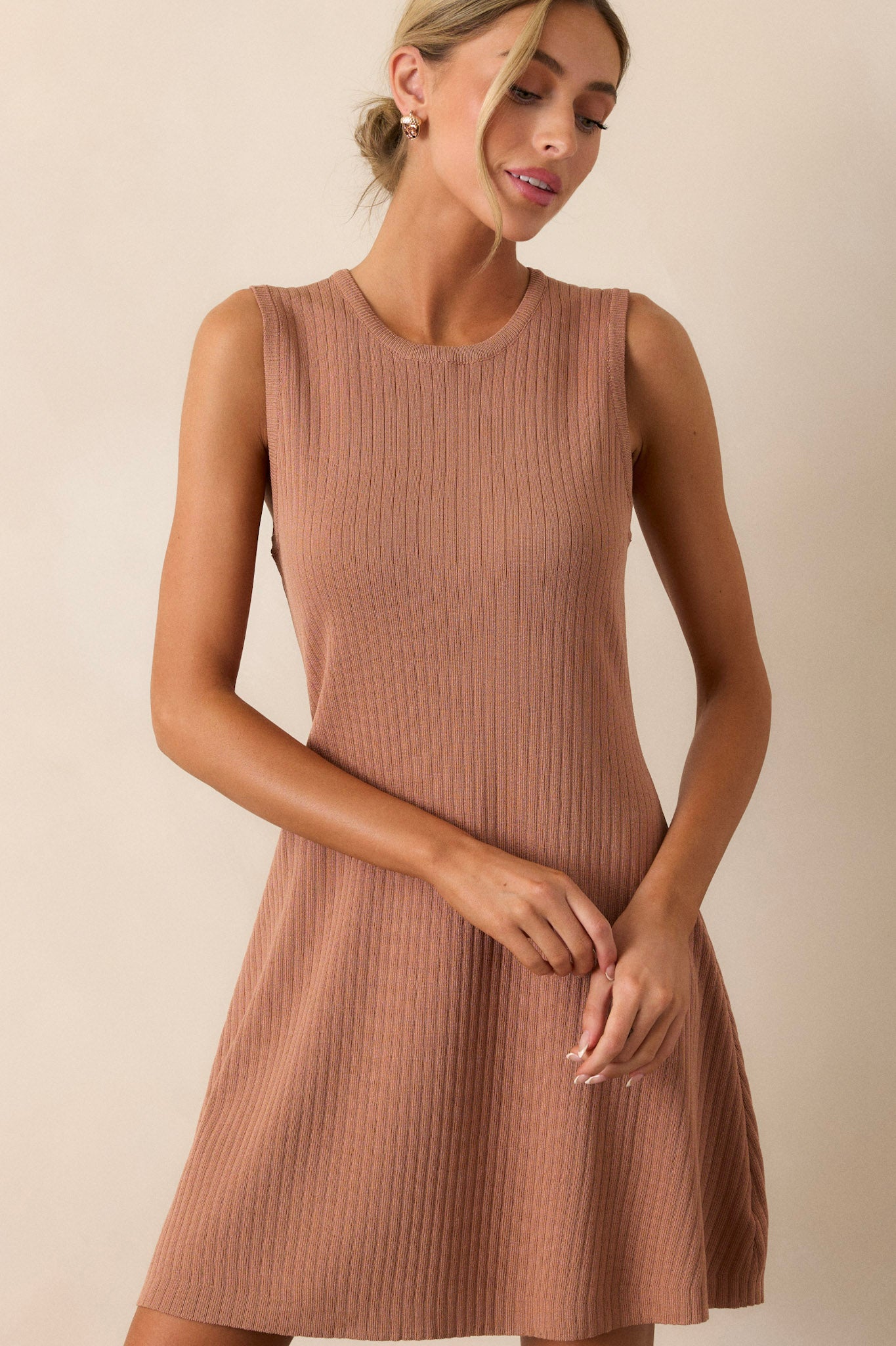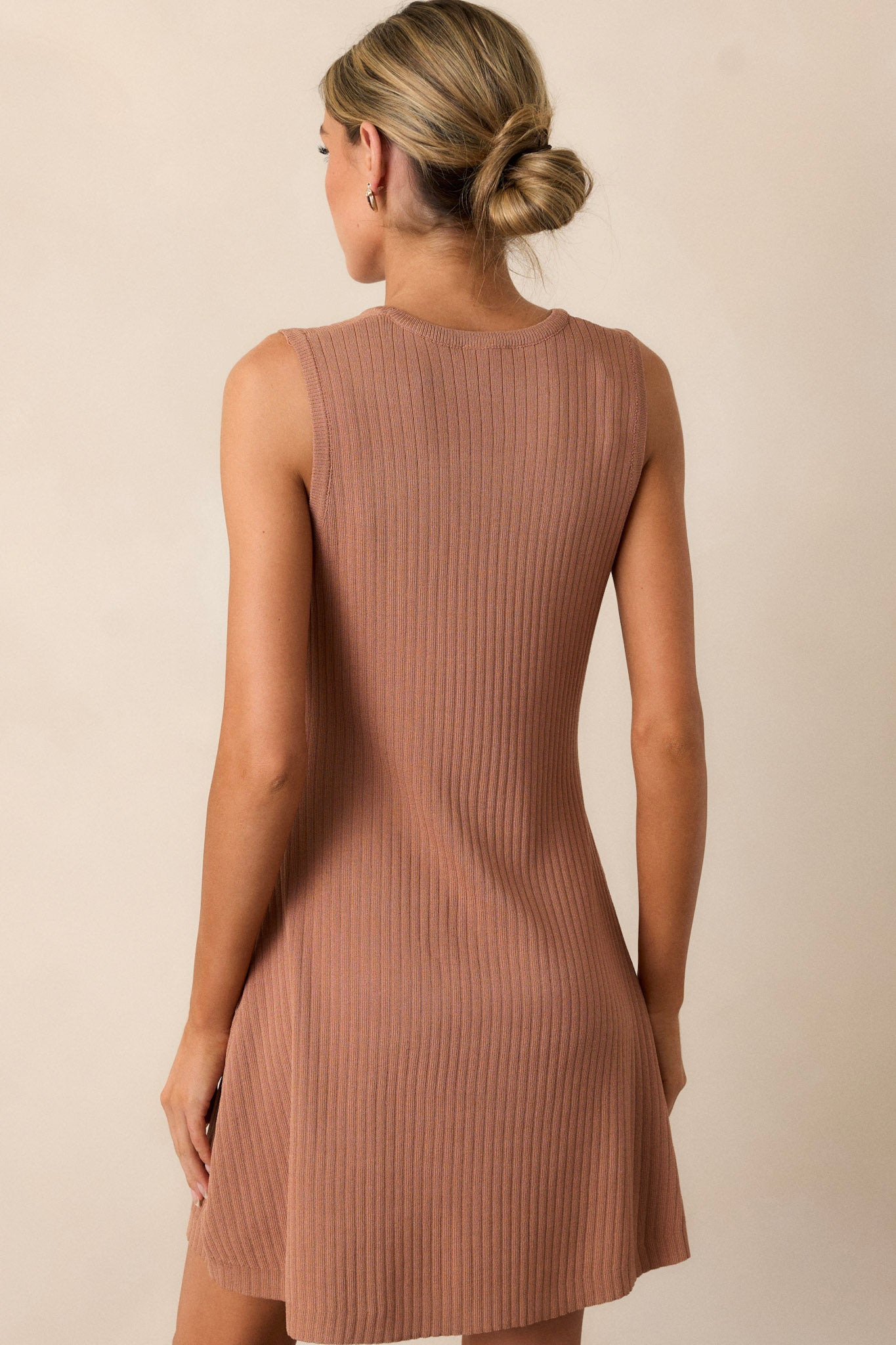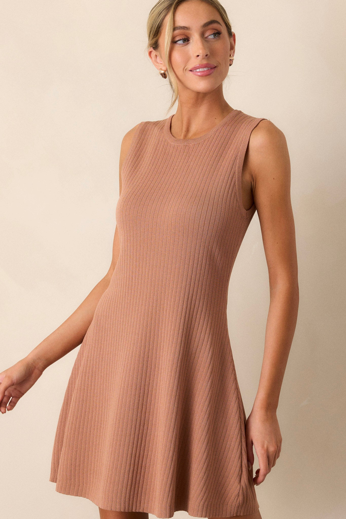 Elevate your casual style with our Simple Vibes Camel Brown Ribbed Knit Mini Dress. Made with soft, ribbed knit fabric, this dress hugs your curves for a comfortable and flattering fit. The camel brown hue offers a versatile look that can easily be dressed up or down. Perfect for adding a touch of effortless style to any occasion. This camel brown features a rounded neckline, a ribbed material, a fit and flare look and a sleeveless design.