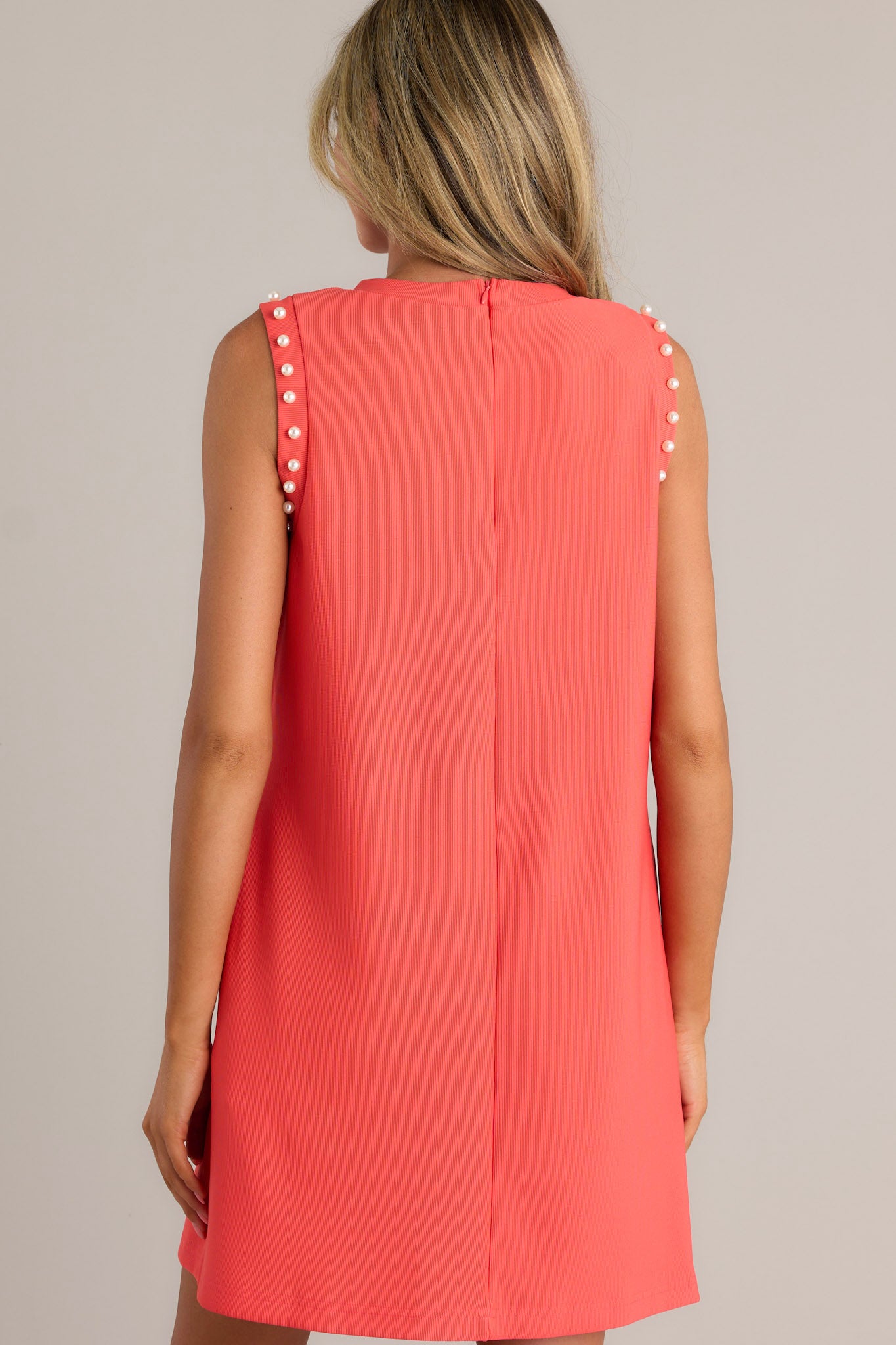Unleash your inner fashionista with the Simply The Best Tomato Red Sleeveless Mini Dress. Its sleek design and comfortable fit make it perfect for any occasion. Whether you're dressing up or dressing down, this dress will have you looking and feeling your best. So go ahead, rock this dress with confidence and style! This red mini dress features a faux pearl embellished crew neckline, a discrete zipper, a ribbed texture, functional hip pockets, and a faux pearl embellished sleeveless design.