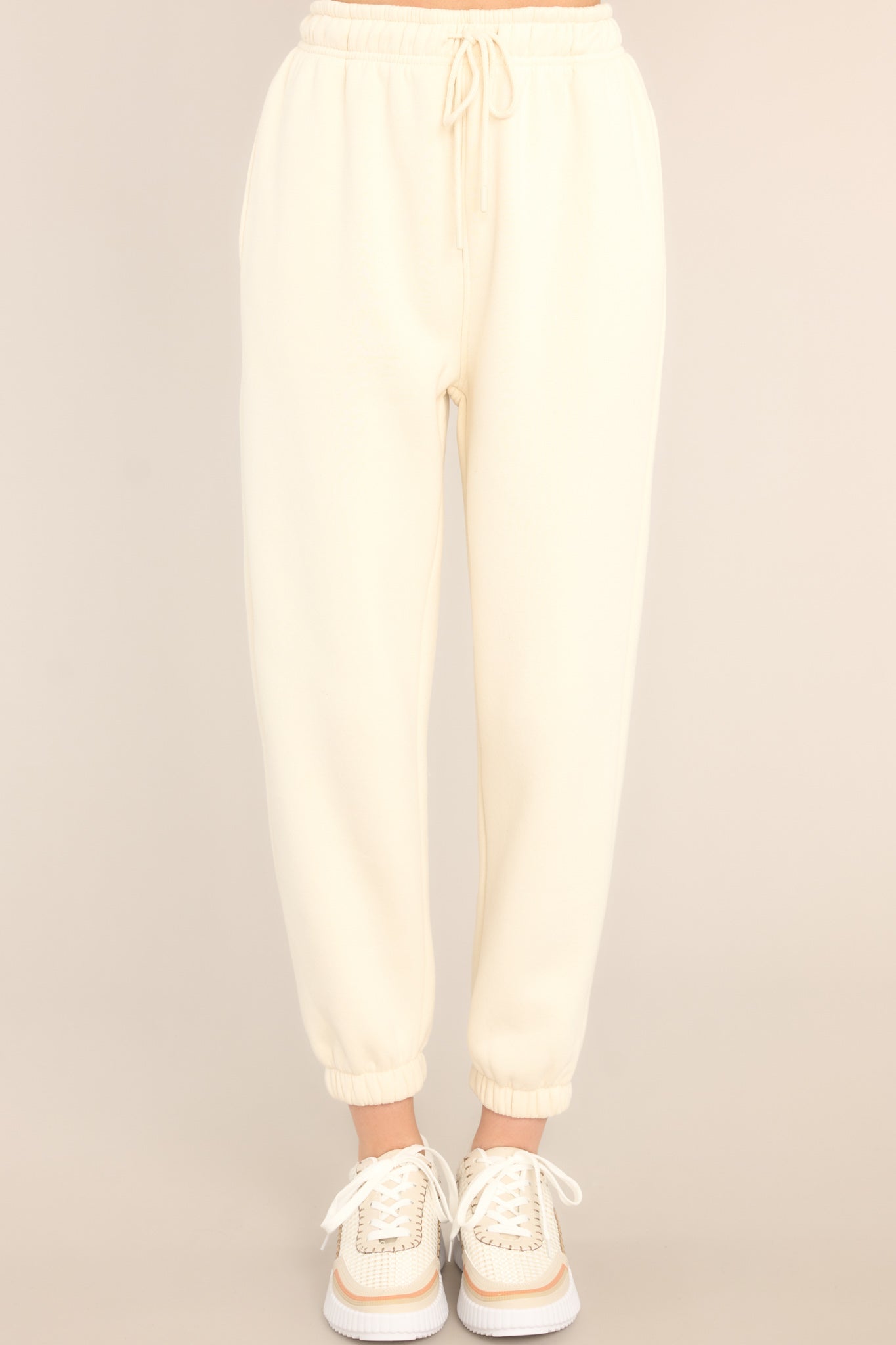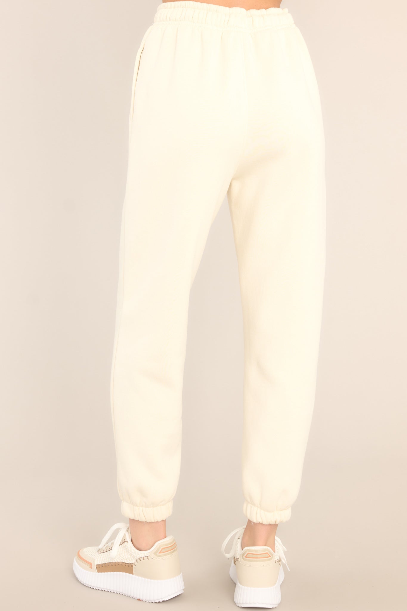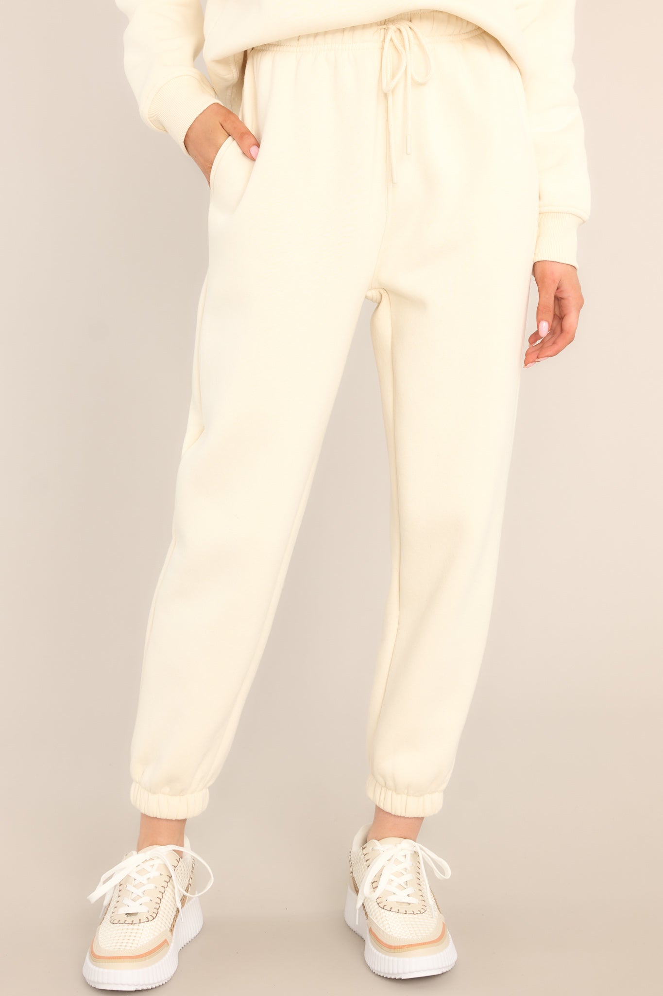 These pearled ivory joggers feature a self-tie drawstring waist, pockets, and cuffed elastic ankles. Perfect for lounging or running errands, these joggers provide effortless elegance and sophistication to your wardrobe.