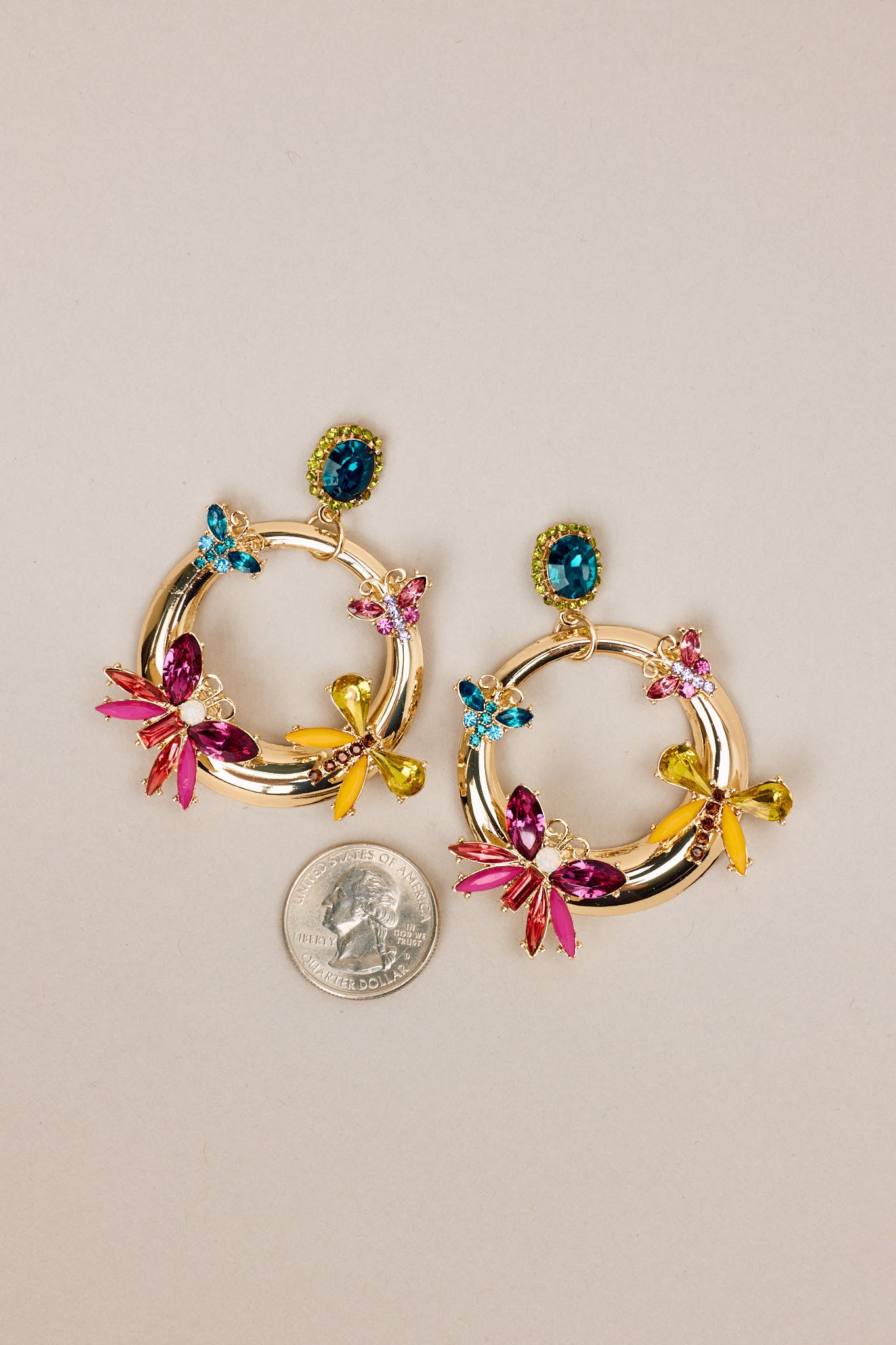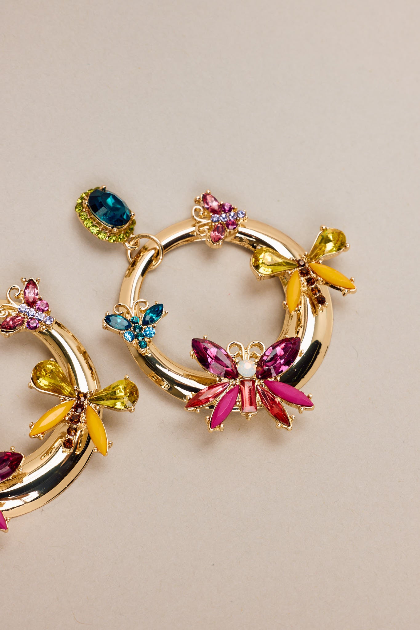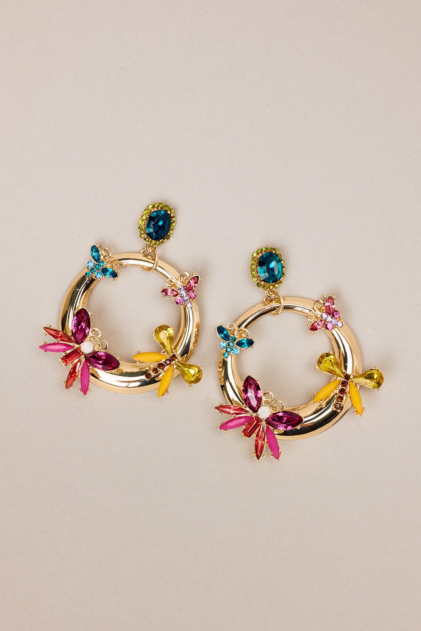 Get ready to flutter with these playful and chic So Radiant Gold & Multicolor Rhinestone Butterfly Earrings. With a touch of sparkle and a burst of color from the rhinestones, these earrings will add a touch of whimsy to any outfit. Perfect for those who love to make a statement! These earrings feature gold hardware, a rhinestone stud connected to a hoop design, colored butterfly shaped rhinestone details, and secure post backings.