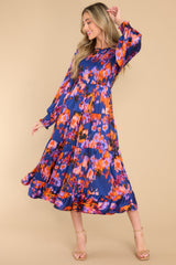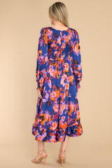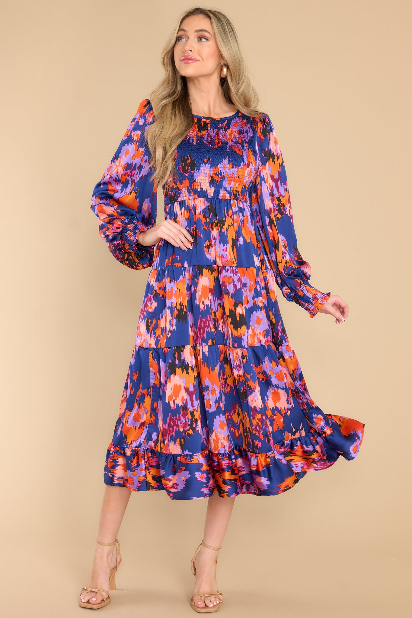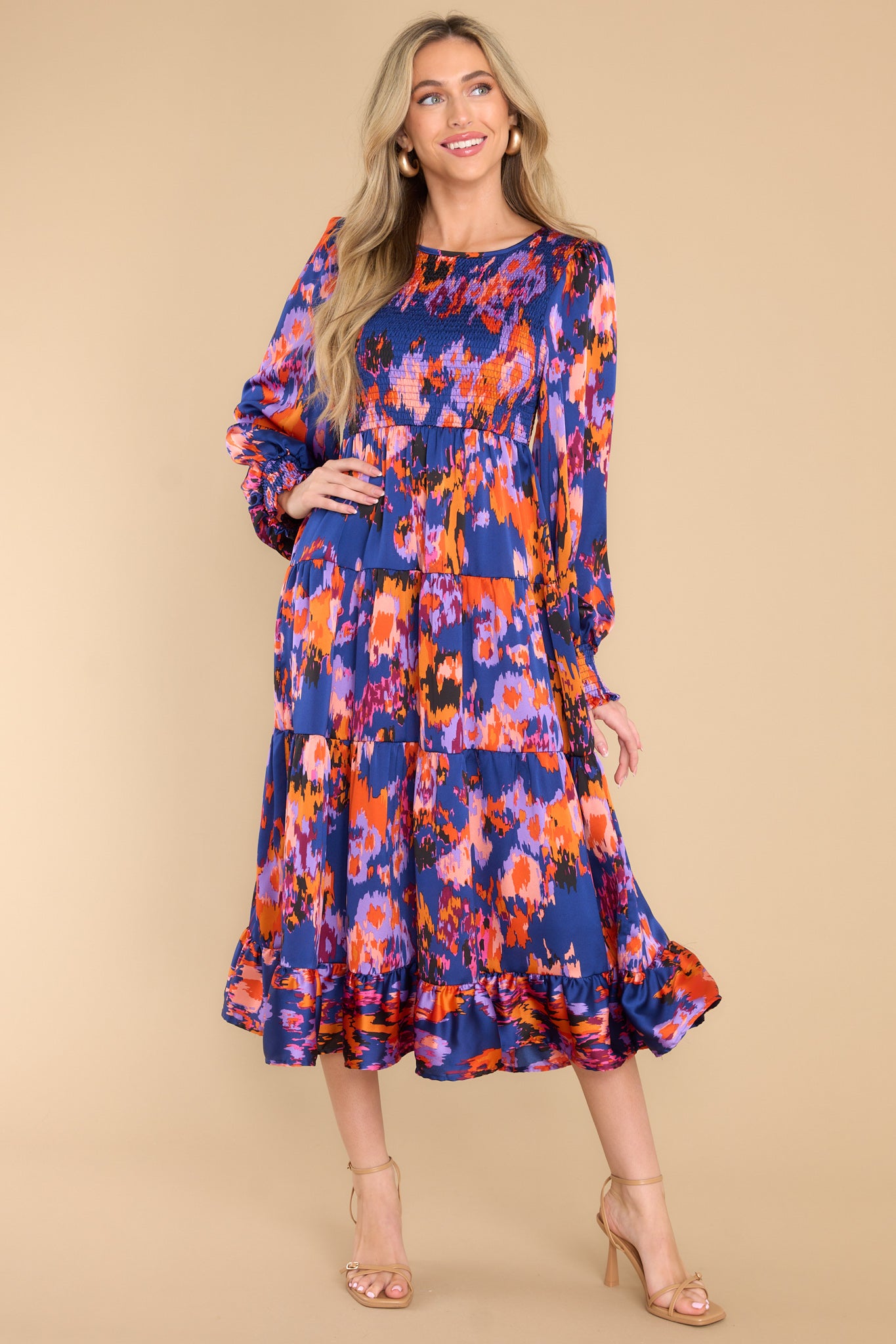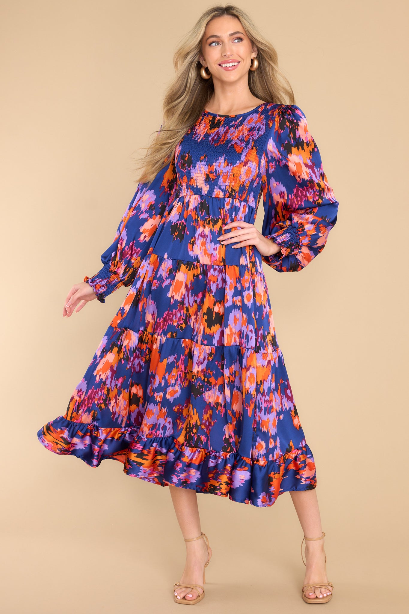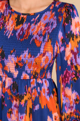 Feel so suddenly fabulous in this navy midi dress! With an eye-catching print, this dress is sure to turn heads wherever you go. Perfect for a night out or a special event, this dress will make you feel like the belle of the ball. Keep them guessing while feeling like a million bucks! This dress features a crew neckline, a keyhole closure in the back, a fully smocked bodice, a tiered design, smocked sleeves, and an abstract print. Model is wearing a size small. • 100% Polyester • Hand Wash Cold • Unlined • Imported