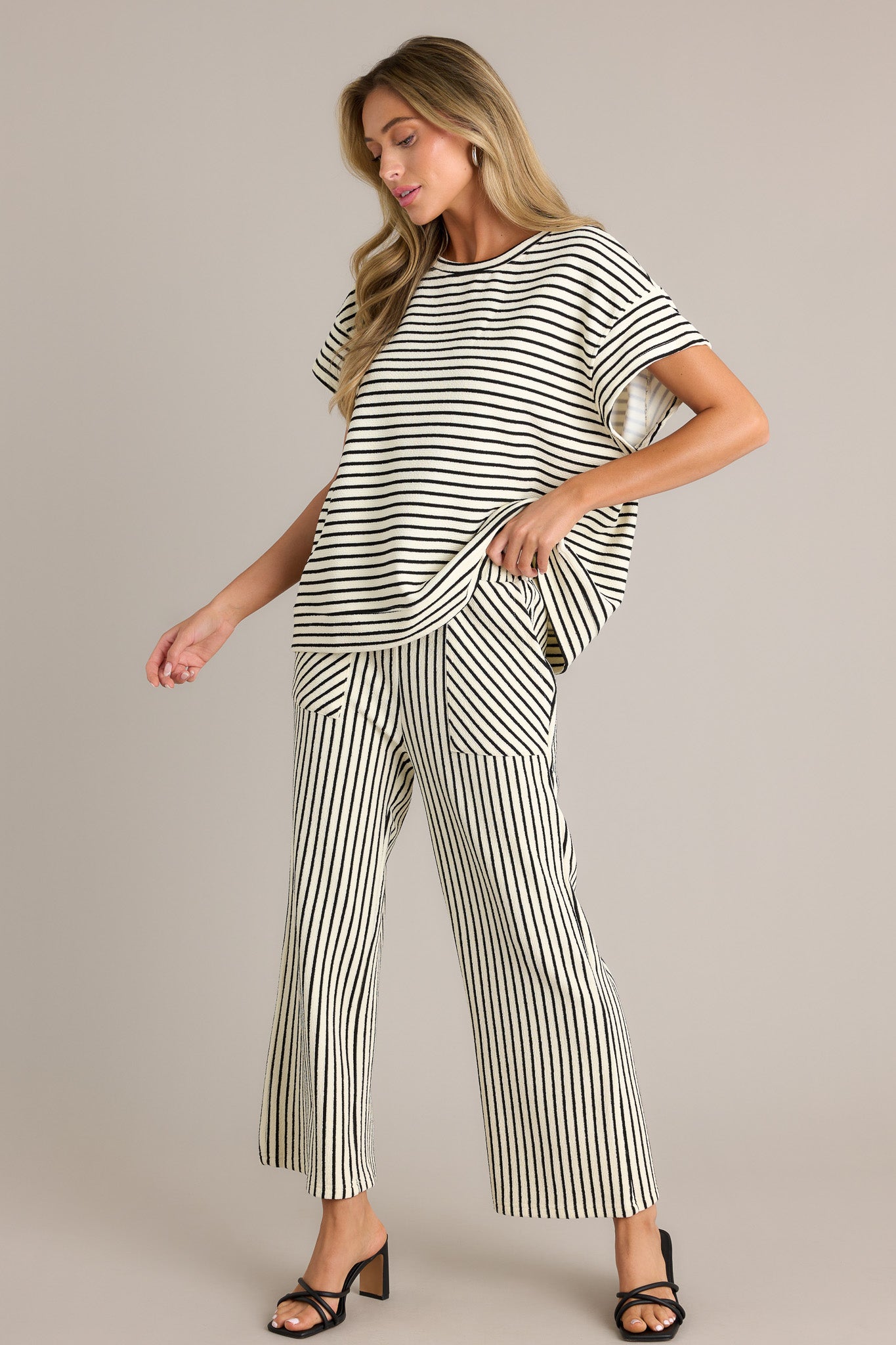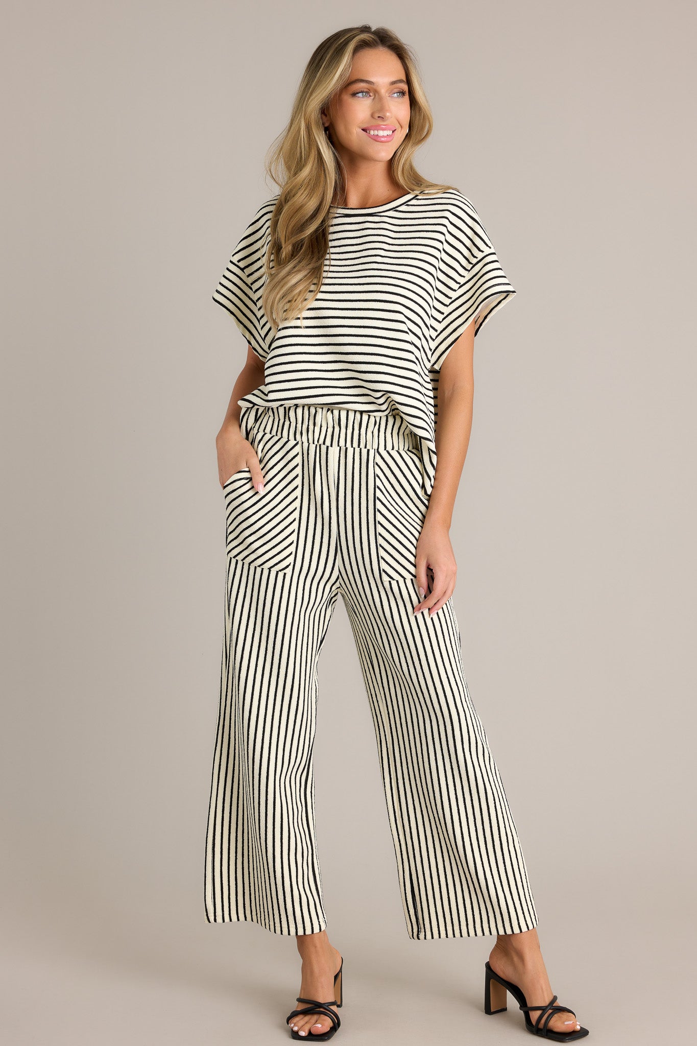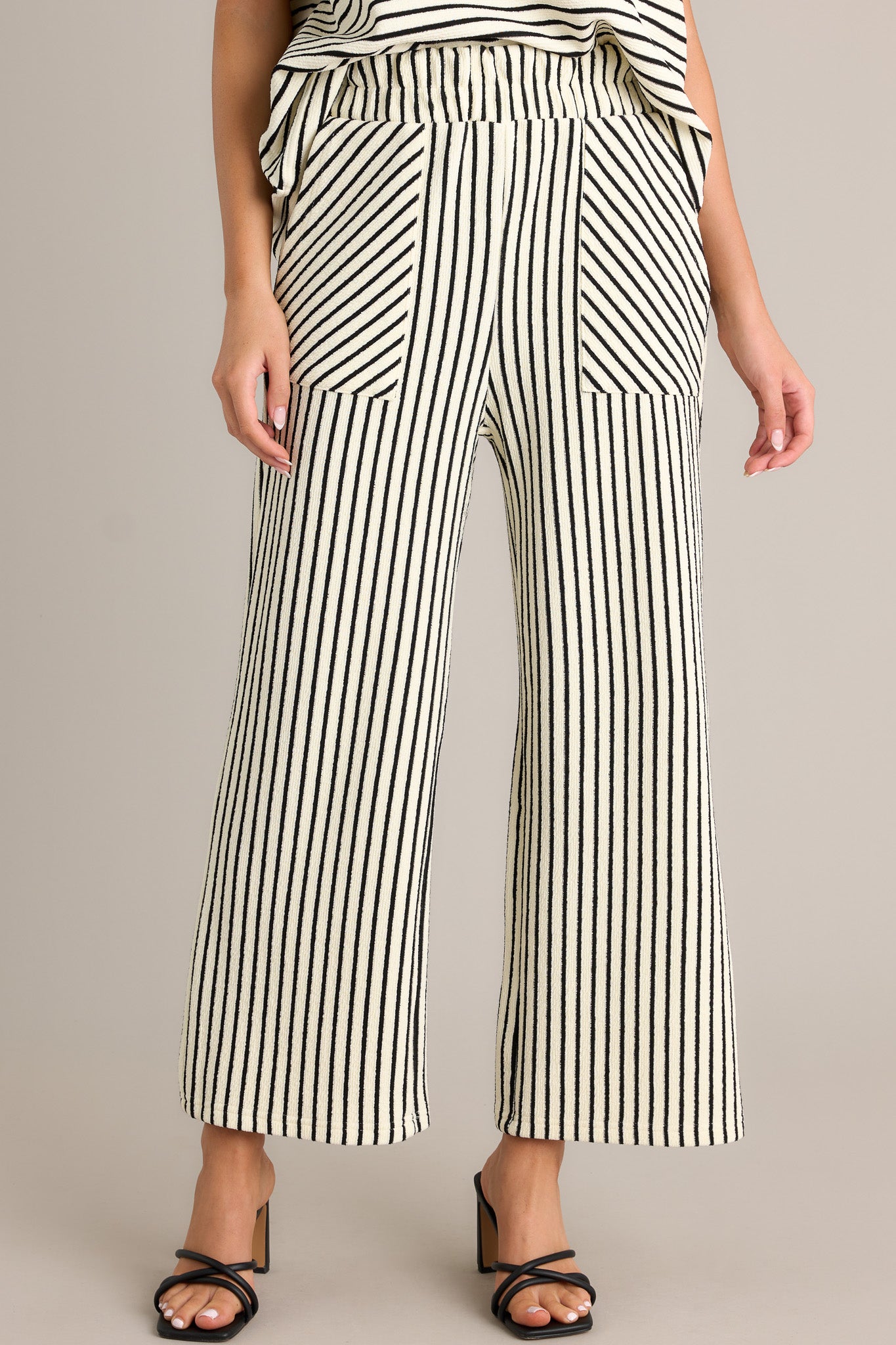Get ready to turn heads in our Something More Black Stripe Wide Leg Pants! These stylish pants feature a black and white stripe pattern, adding a touch of uniqueness to your wardrobe. With their wide leg design, you'll stay comfortable and stylish all day long. Take your outfit to the next level with Something More! These black stripe pants feature a high waisted design, a elastic waistband, a self-tie drawstring, functional hip pockets, and a wide leg.