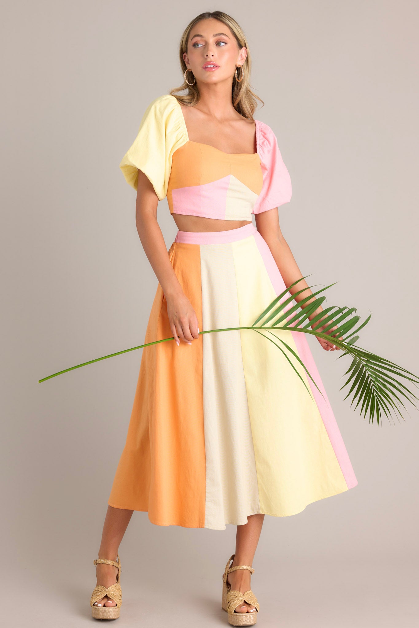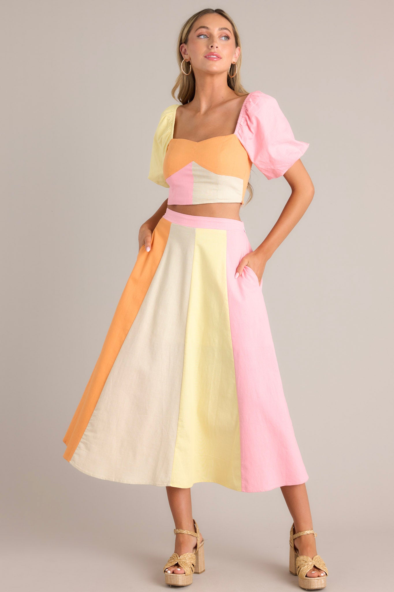 Add a burst of playful color to your wardrobe with our Sorbet Swirl Pastel Multi Crop Top! This quirky top features a fun and flirty crop design, perfect for showing off your unique style. With a swirl of pastel hues, it's sure to brighten up any outfit. This pastel crop top features a sweetheart neckline, a self-tie back feature, a fully smocked back, a discrete side zipper, and elastic cuffed short puff sleeves.