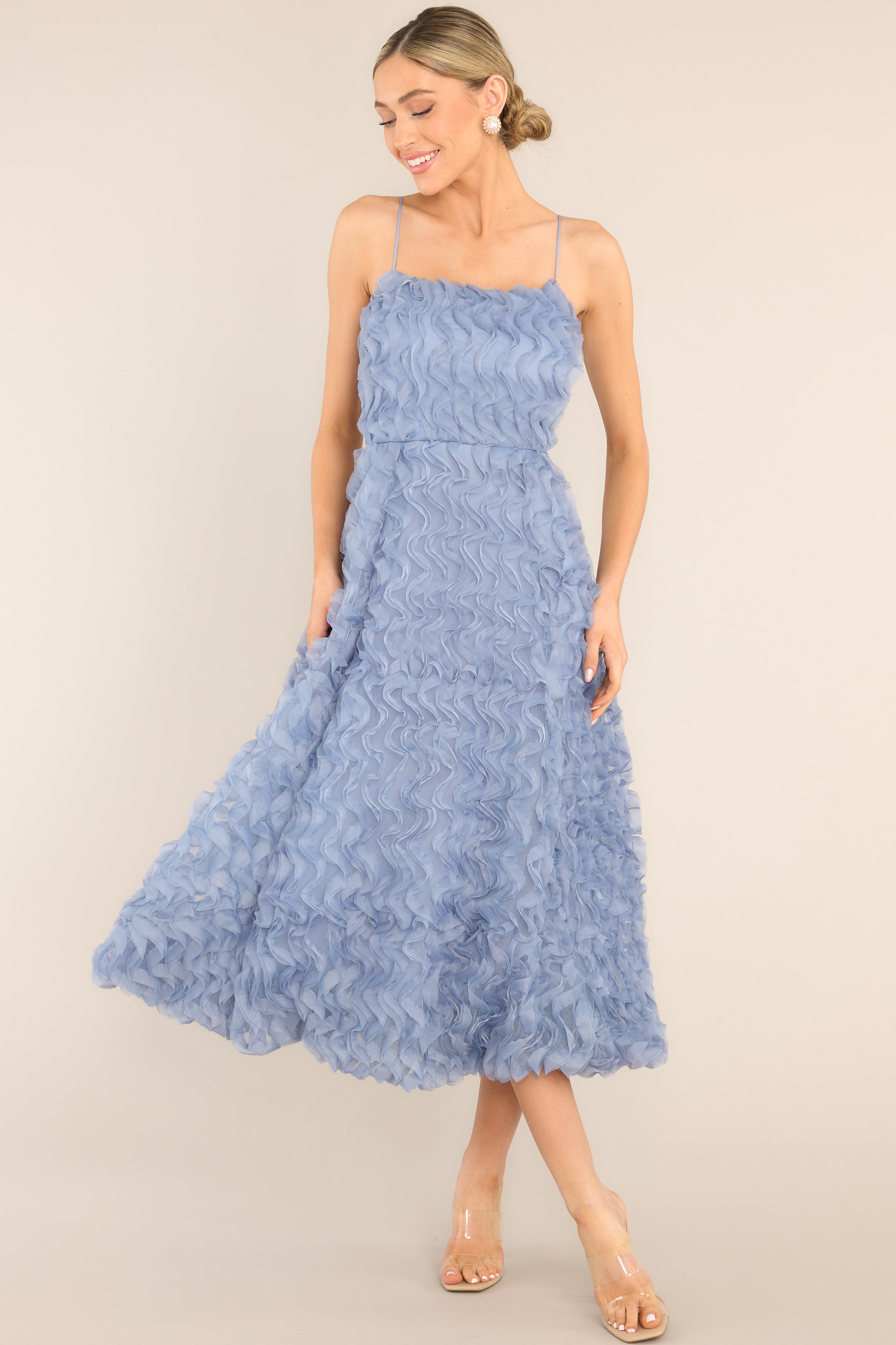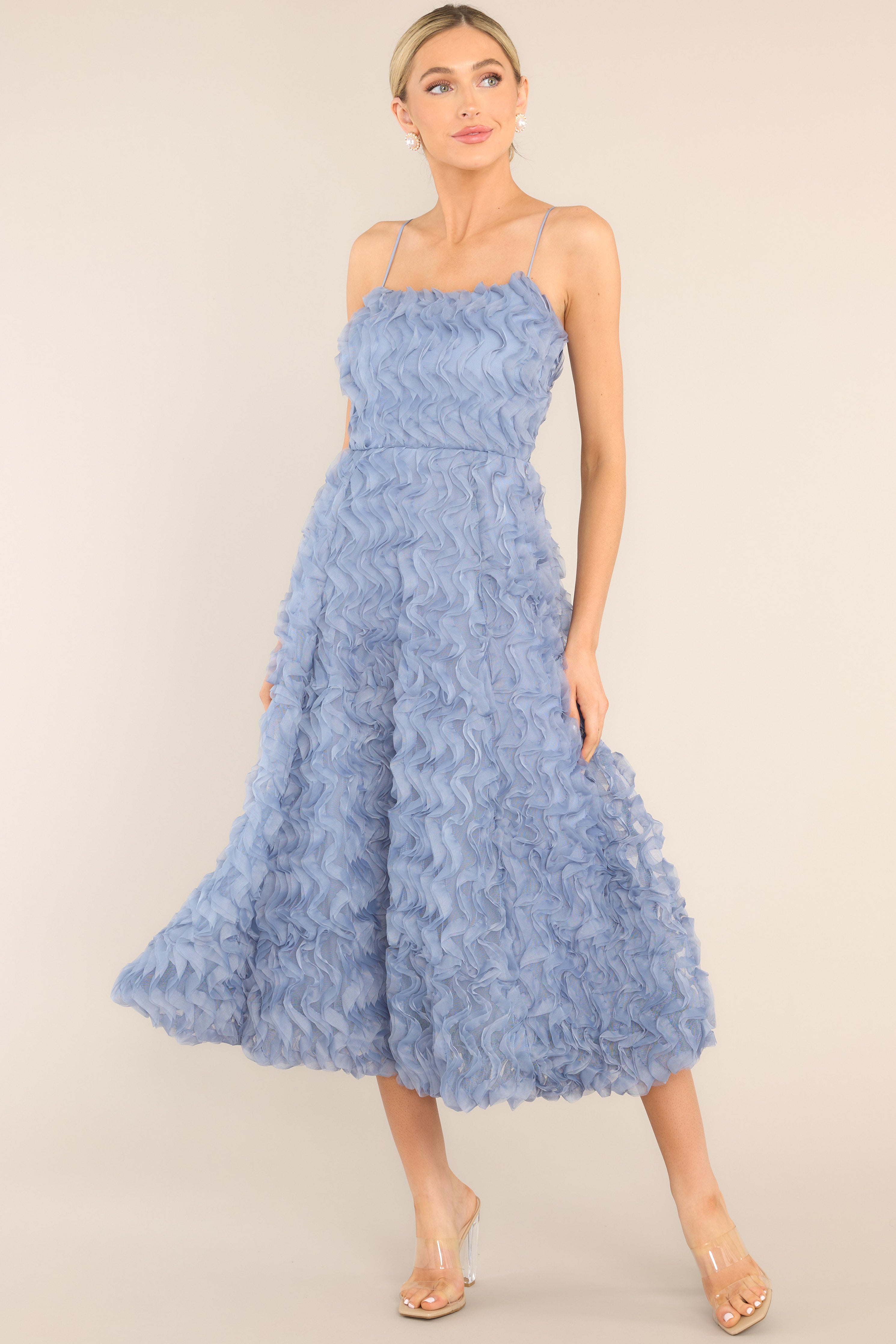 Get ready to wow in the Spectacular Magic Dusty Blue Midi Dress! This dress is perfect for any occasion, offering unbeatable style that will leave you feeling confident and fabulous. From its elegant design to its versatile fit, this dress is guaranteed to make you stand out! This dress features a rounded neckline, thin straps, a functional zipper down the back, and a wavy, ruffled overlay.
