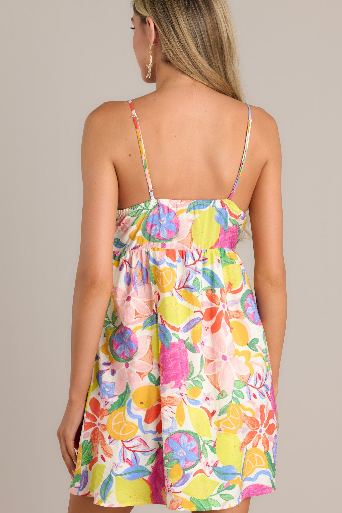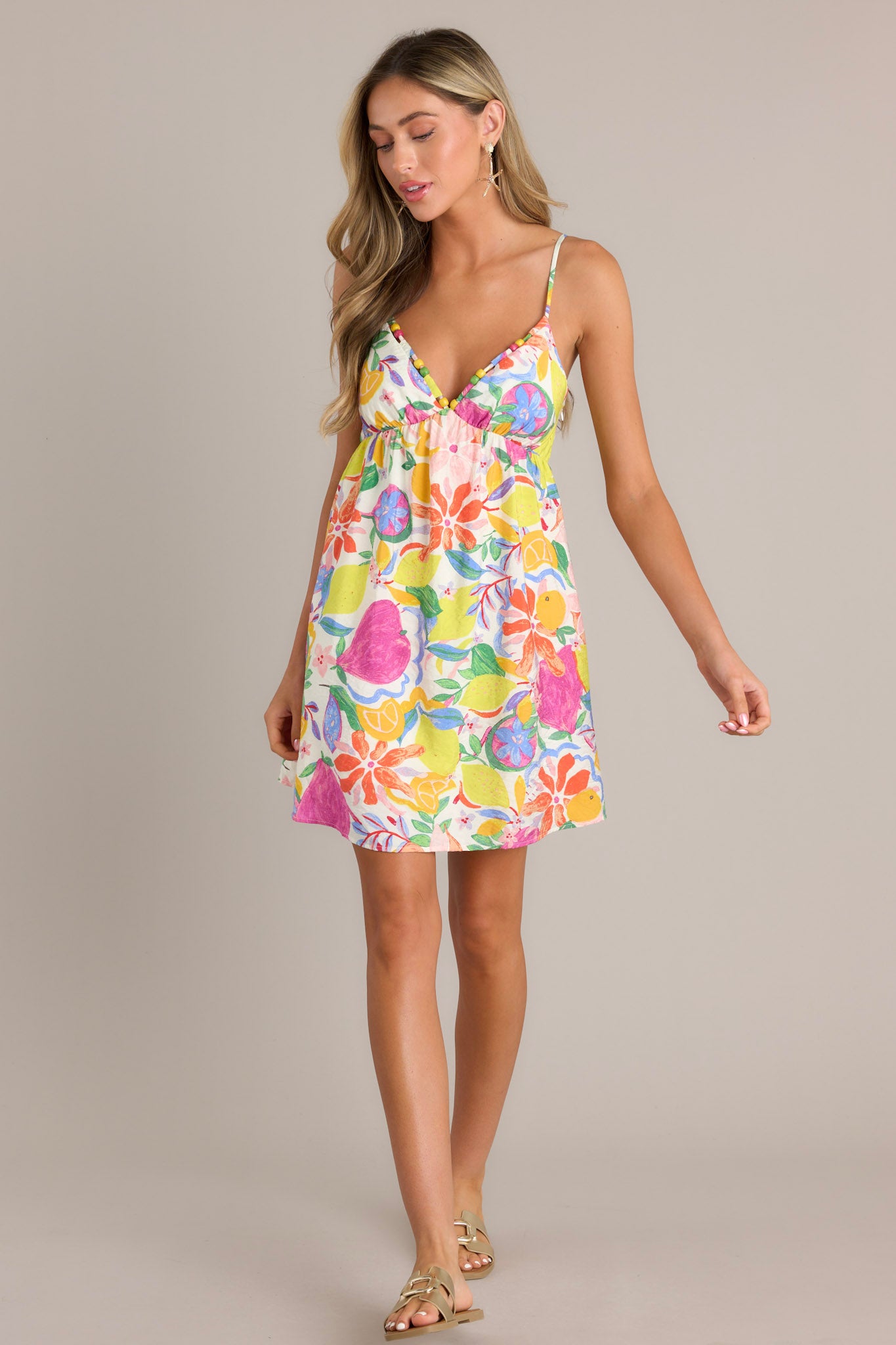 Flaunt your springtime spirit in our Spring Fling Ivory Multi Floral Mini Dress! This whimsical dress features a vibrant floral print, perfect for any outdoor event. With a playful and flirty vibe, this dress is sure to be a hit. Don't miss out on adding this must-have piece to your wardrobe! This floral mini dress features a beaded v-neckline, thin adjustable straps, a fitted lower bust, a discrete side zipper, and a unique & vibrant floral print.