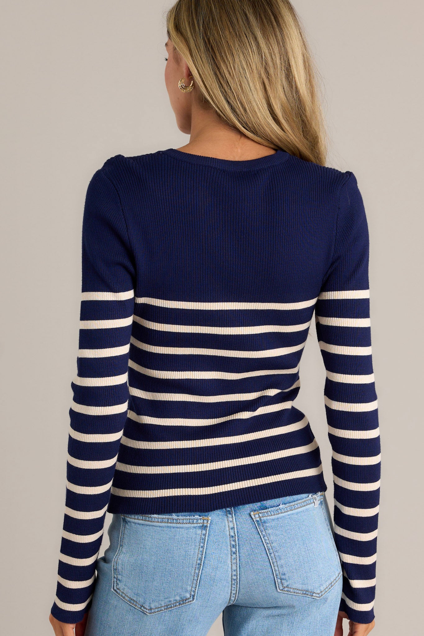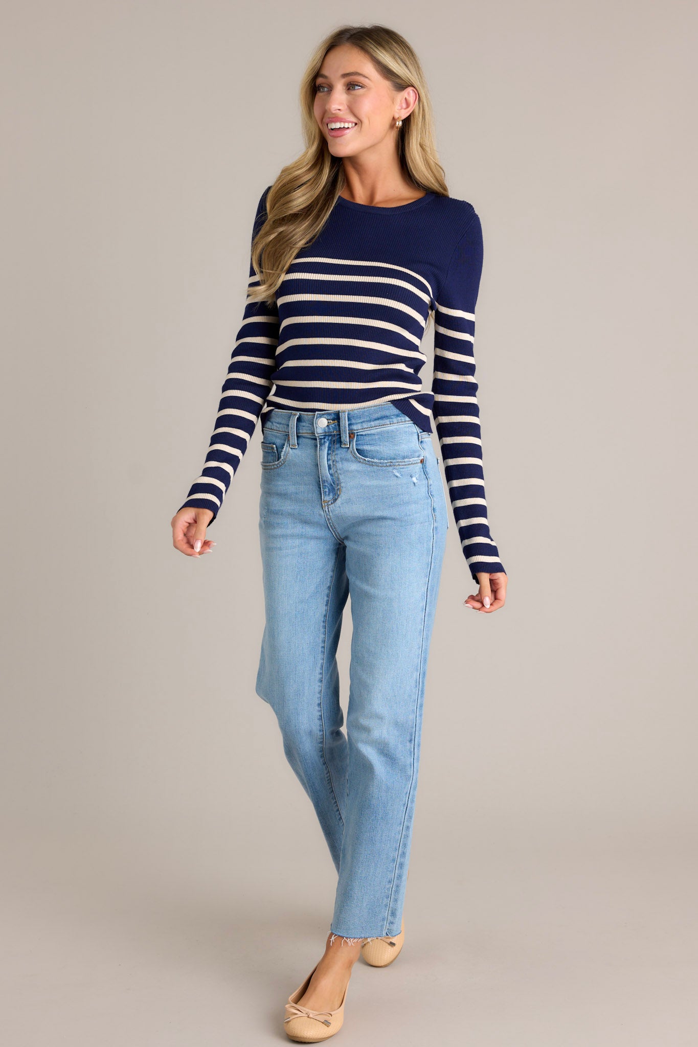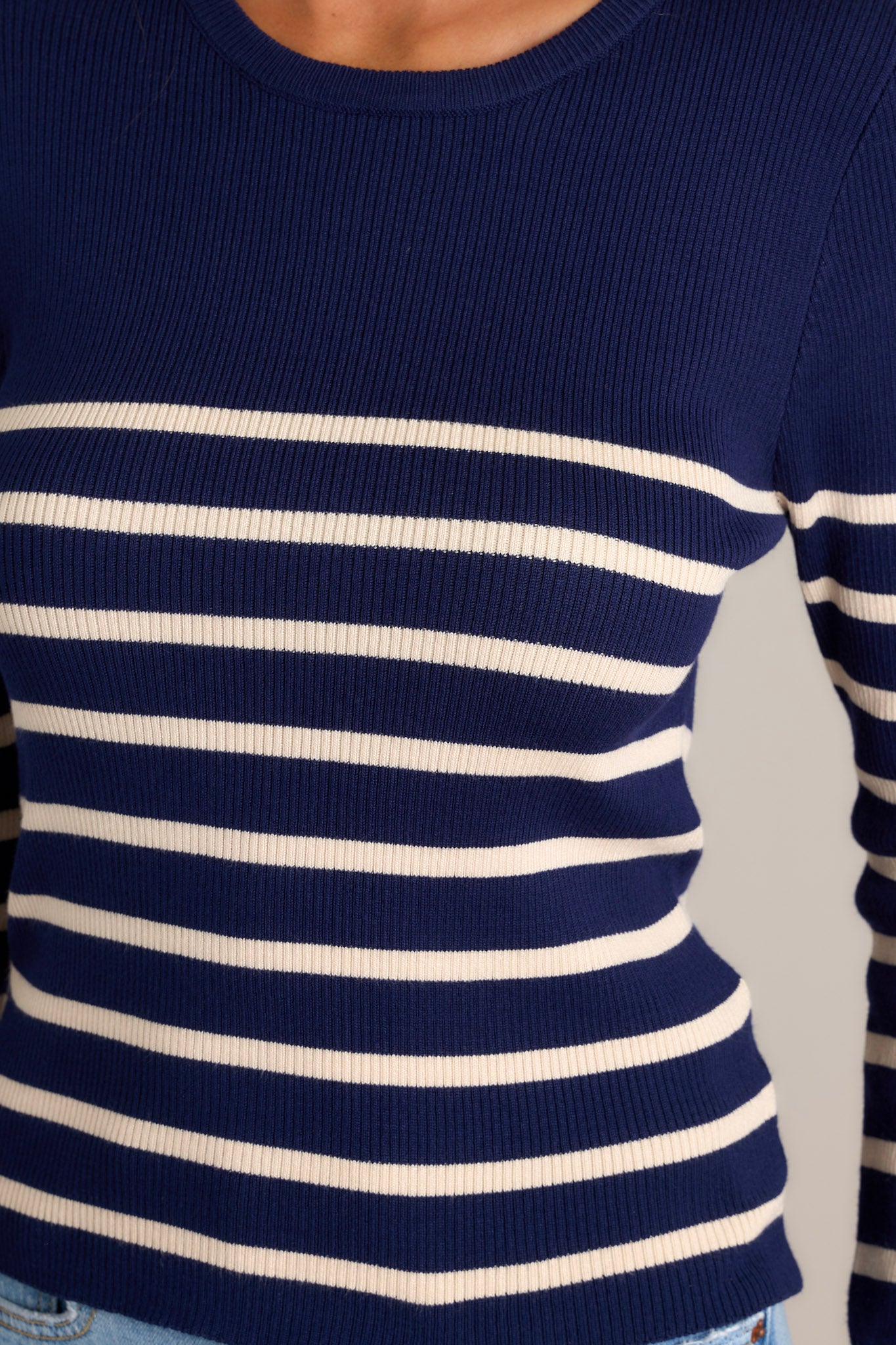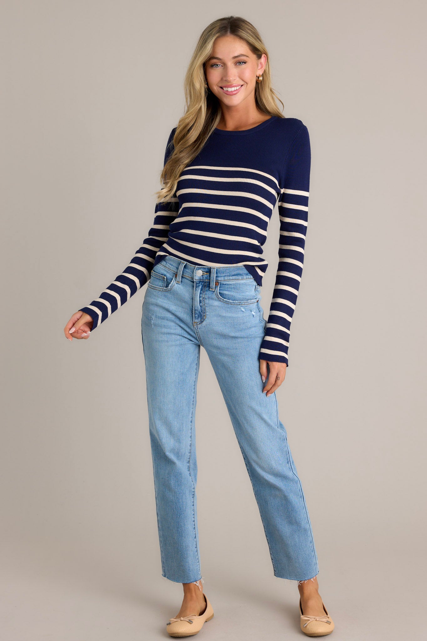 Unleash your inner fashion icon with our Staple Style Navy Stripe Long Sleeve Top! This trendy navy top features stylish beige stripes that will elevate any outfit. Keep it chic and versatile with this wardrobe staple. This beige stripe navy top features a crew neckline, a stretchy ribbed fabric, a striped pattern, and long sleeves.
