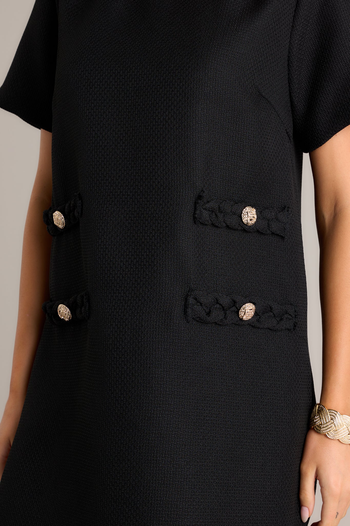 Stay true to your unique style with our Stay The Same Black Tweed Mini Dress. This dress features a classic black tweed pattern, a flattering mini cut, and a playful and fun vibe. With this dress, you'll stand out without compromising your personal style. This black mini dress features a braided crew neckline, gold accent buttons, faux hip pockets, a tweed material and short sleeves.