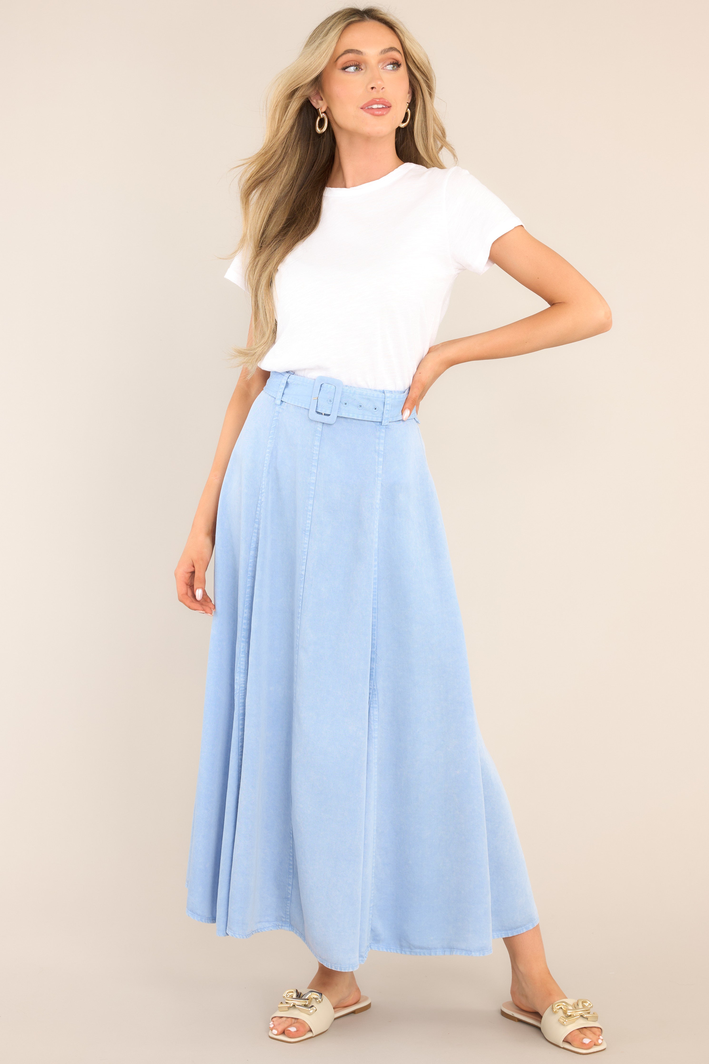 Take a twirl in our Stay True Chambray Maxi Skirt and keep it real! This skirt will keep you looking and feeling effortlessly chic. Made with a flowy fabric to keep you comfortable while looking stylish. Pair it with heels, sandals, or even sneakers! This skirt features a high waisted design, belt loops, a functional belt, a zipper with a hook closure in the back of the waist, and exposed seams.