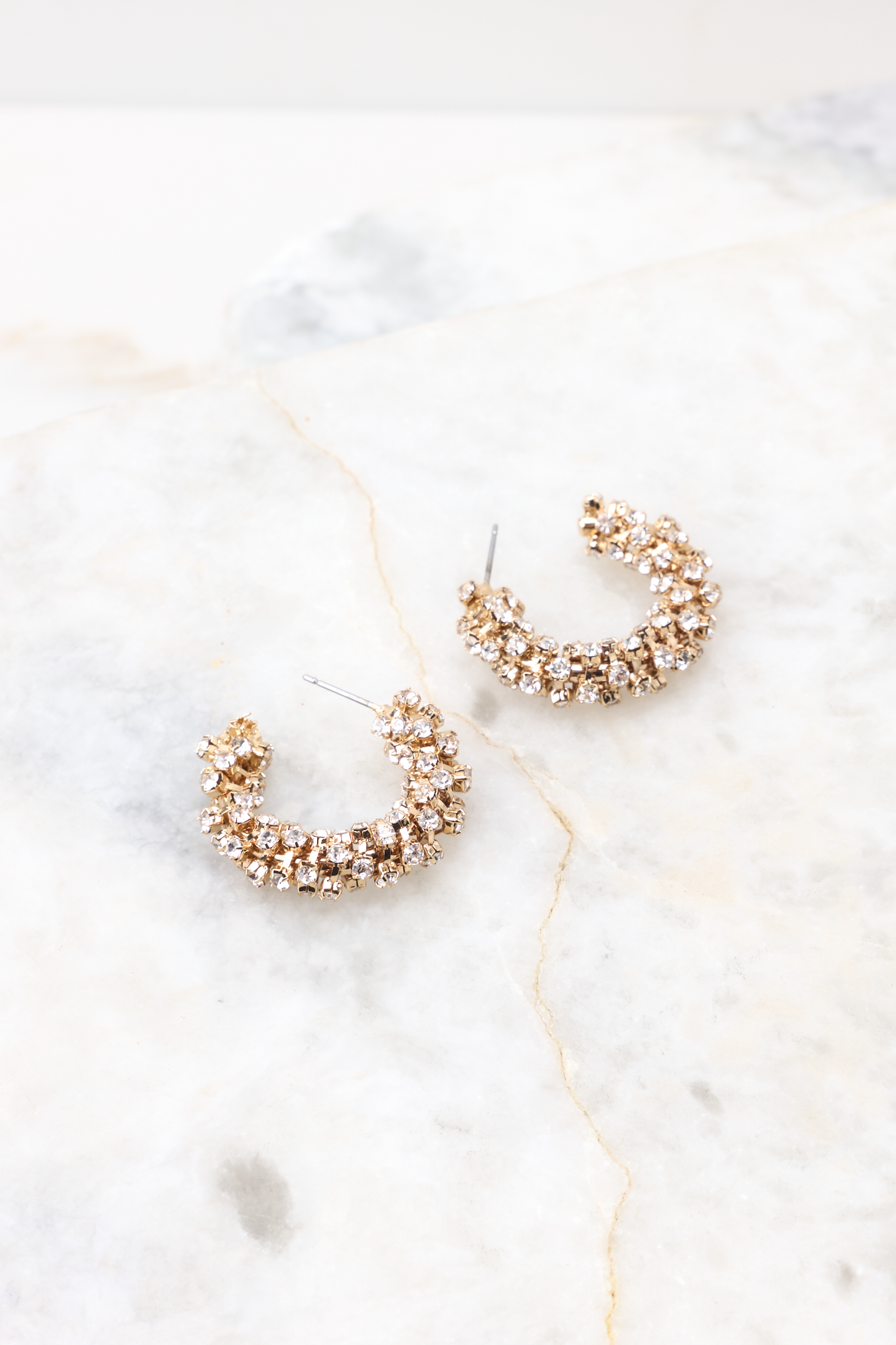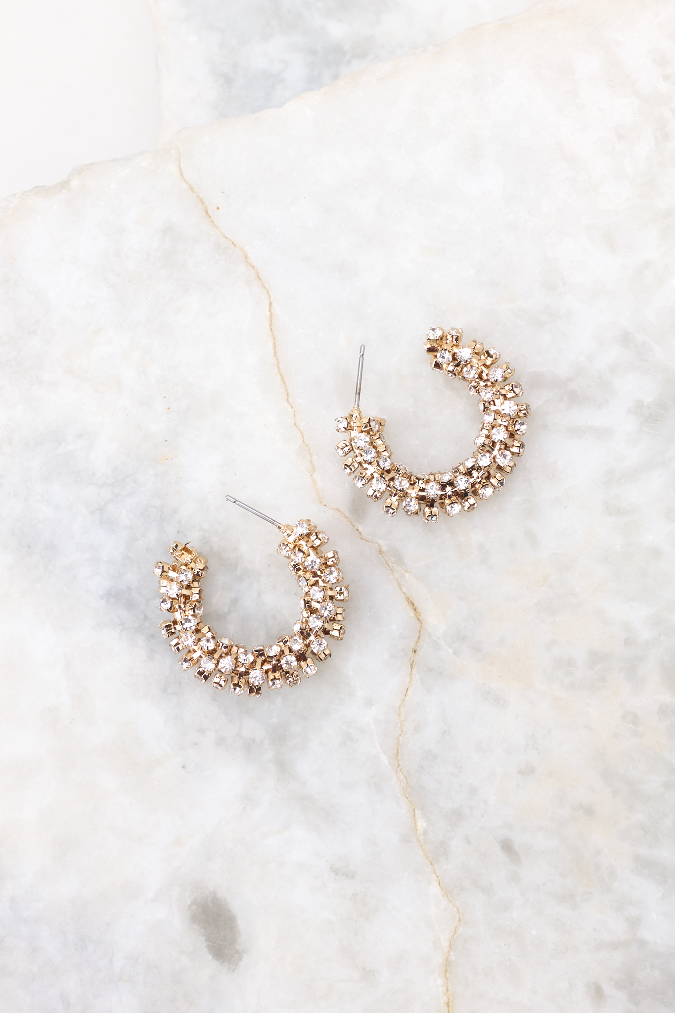 Show off your style with these shimmering show-stoppers! Still Thinking Gold Hoop Earrings are crafted with sparkly gold rhinestones in a classic hoop design. These earrings will make you sparkle and shine - like the queen bee you are! Earrings feature rhinestones all over, an open hoop design, and secure post-back fastenings. Earrings measure 1" in width. • Imported