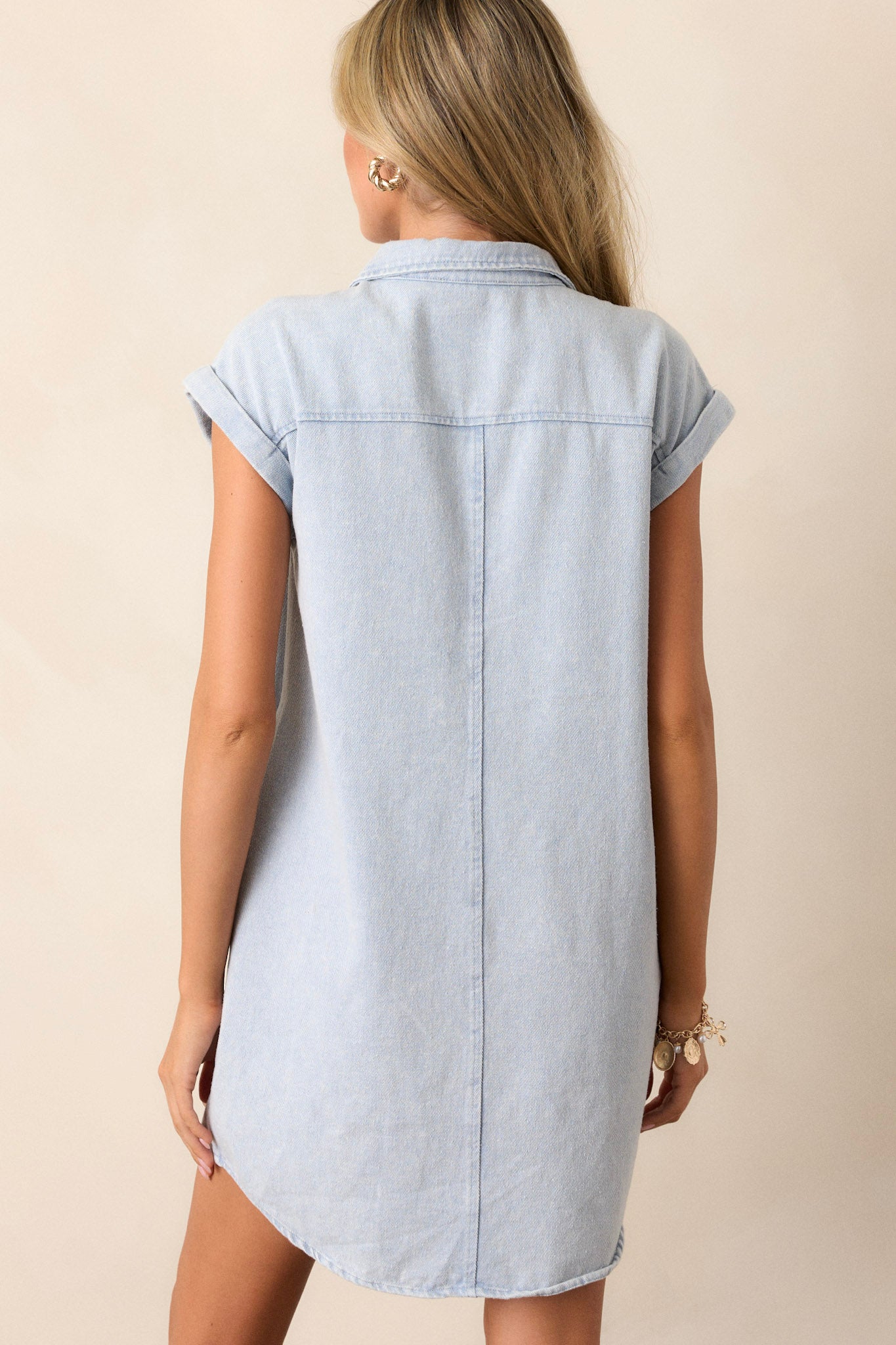 Get ready to turn heads in our Stop & Stare Light Denim Mini Dress! Made with high-quality denim, this dress is both trendy and comfortable. The eye-catching design and mini length will make you stand out in any crowd. Perfect for a night out or a casual day, this dress is a must-have in your wardrobe. This dress features a collared neckline, a full button front, functional breast & hip pockets, and folded short sleeves.