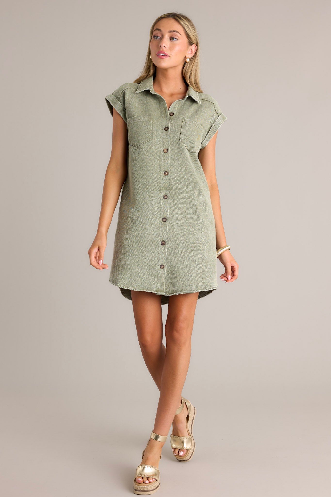 Stop & Stare Olive Green Denim Button Front Mini Dress