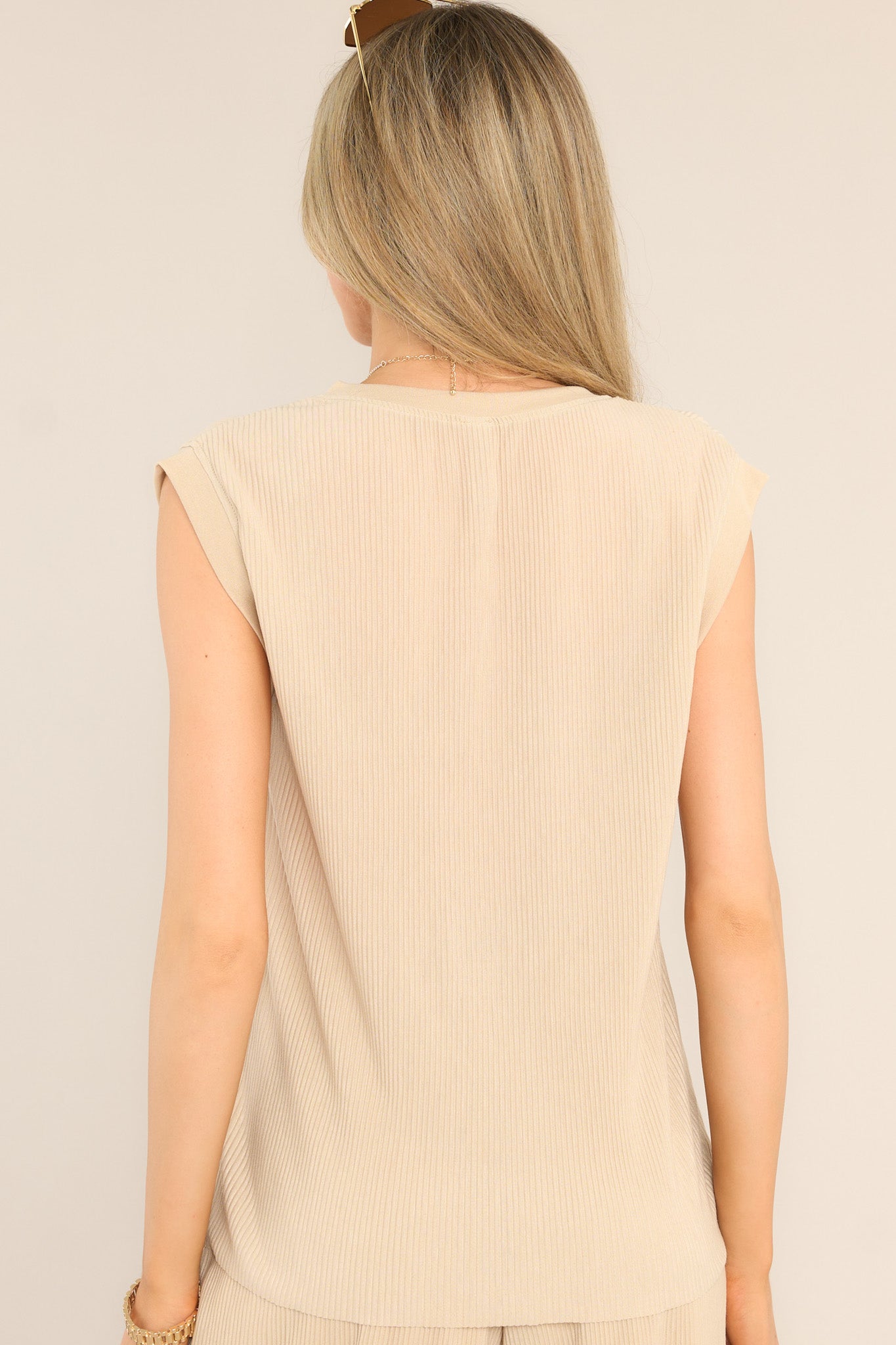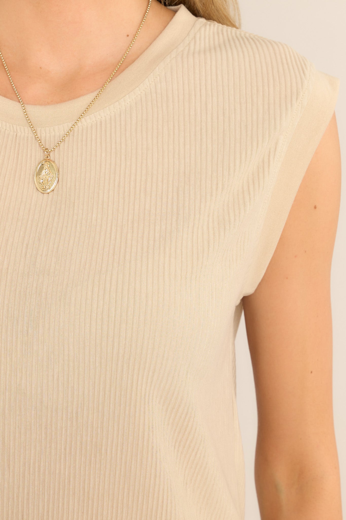 This natural tank top features a crew neckline, short cap sleeves and ribbed fabric throughout.