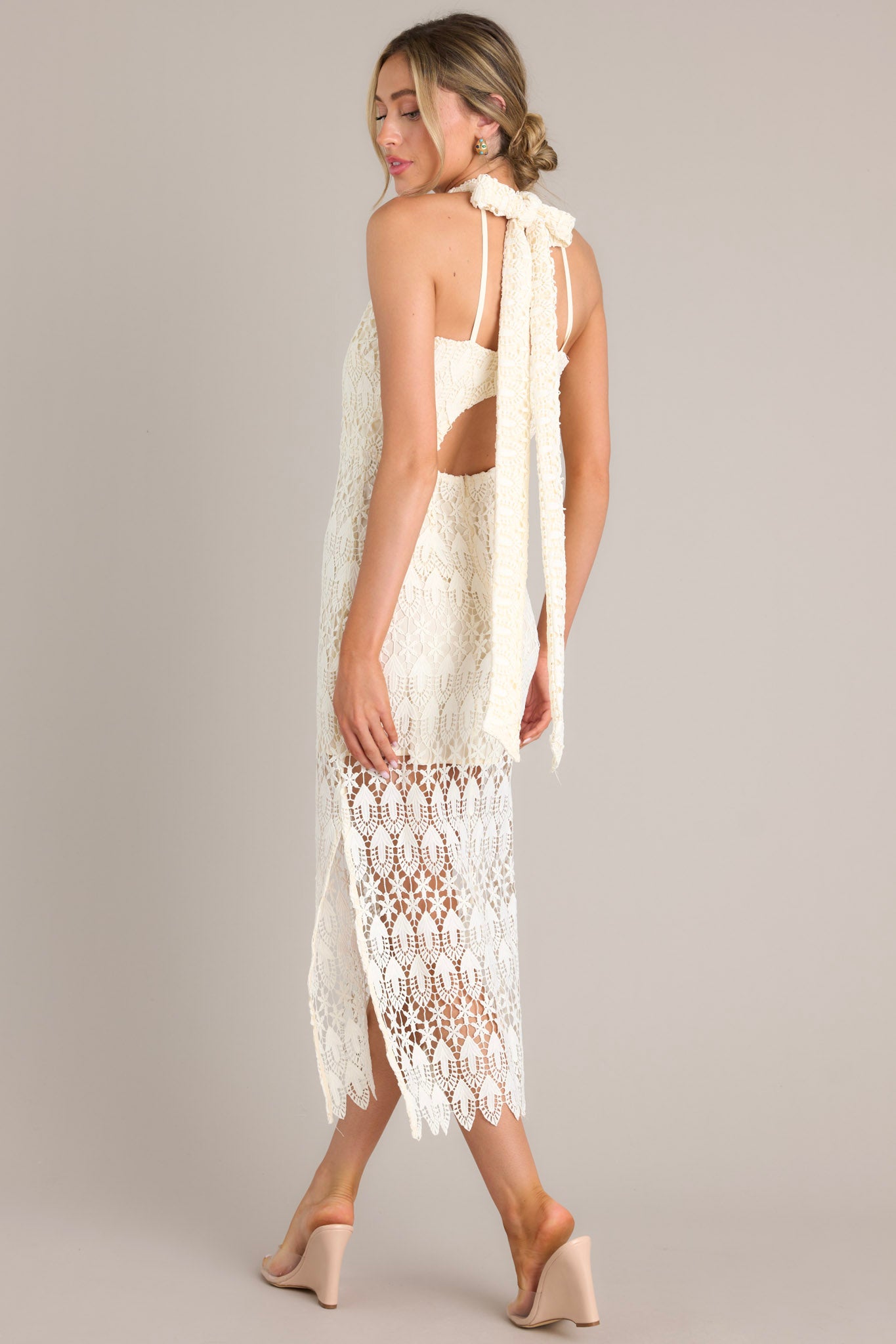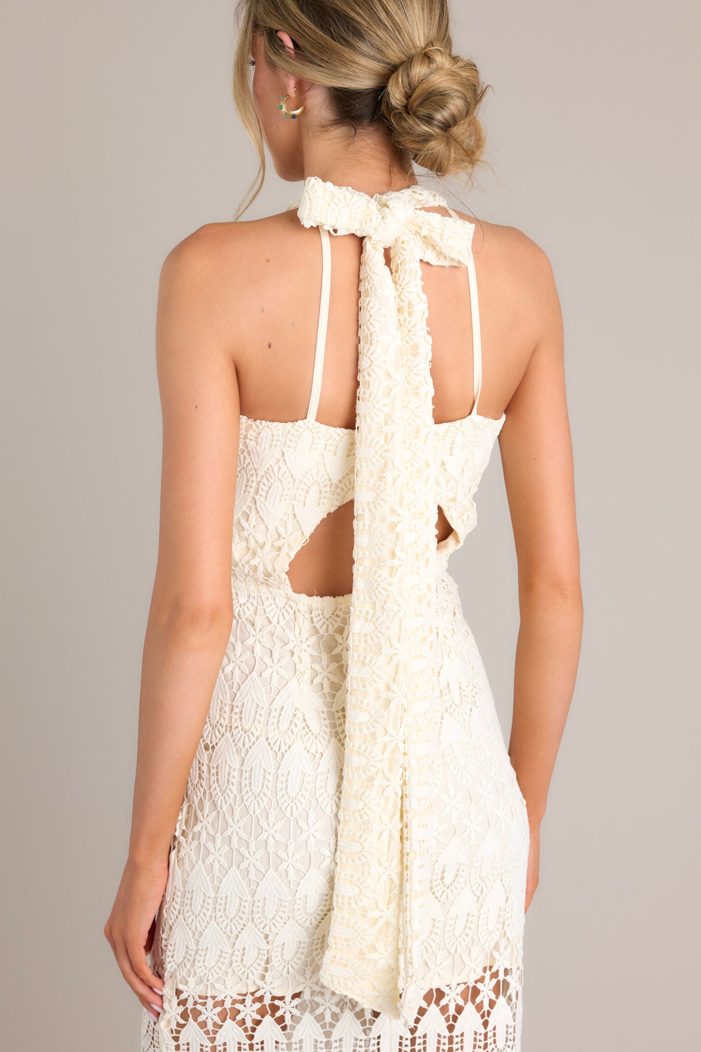 Be a showstopper in this gorgeous Stunning One Ivory Midi Dress! This beauty will make heads turn with its pretty sweet style and its stunning details, so you'll be ready to take on any special occasion in style! This ivory midi dress features a halter neckline with a self-tie in the back, a cutout detail in the back with hook and eye closures, a zipper up the back, and a lining that extends from the neckline to the upper thigh.