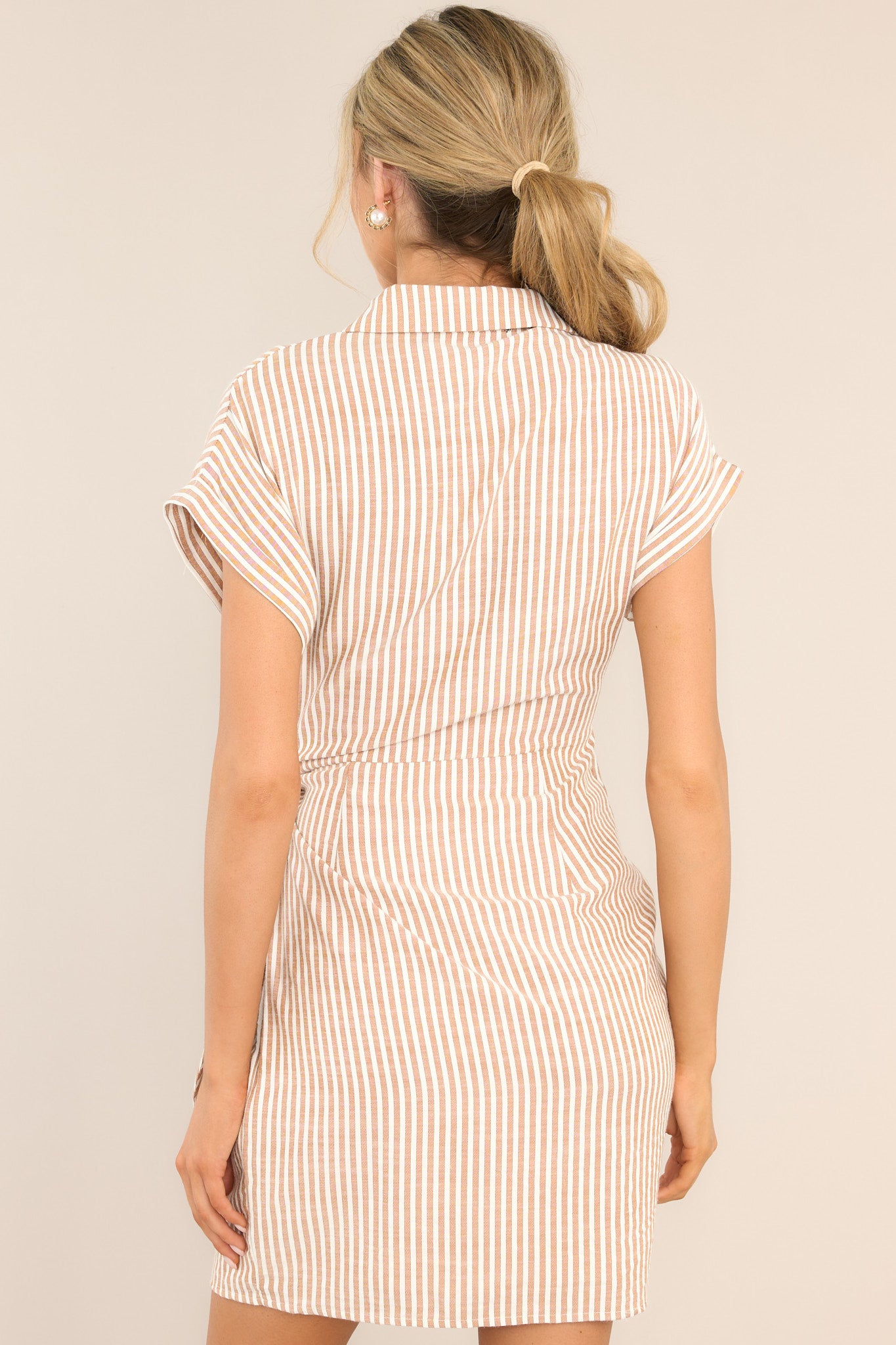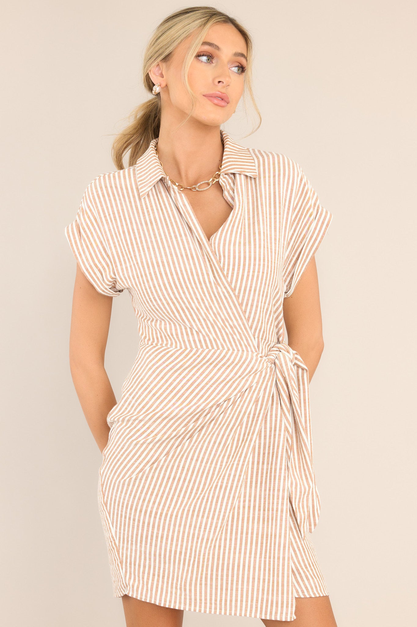 Become the ultimate fashionista with our Succeed Somehow Tan & White Striped Mini Dress. This dress stripes you up for success, with a playful and trendy design that's sure to turn heads. Don't miss out on this unique and stylish addition to your wardrobe! This wrap style dress features a collared v-neckline, a self-tie waist, and cuffed short sleeves.