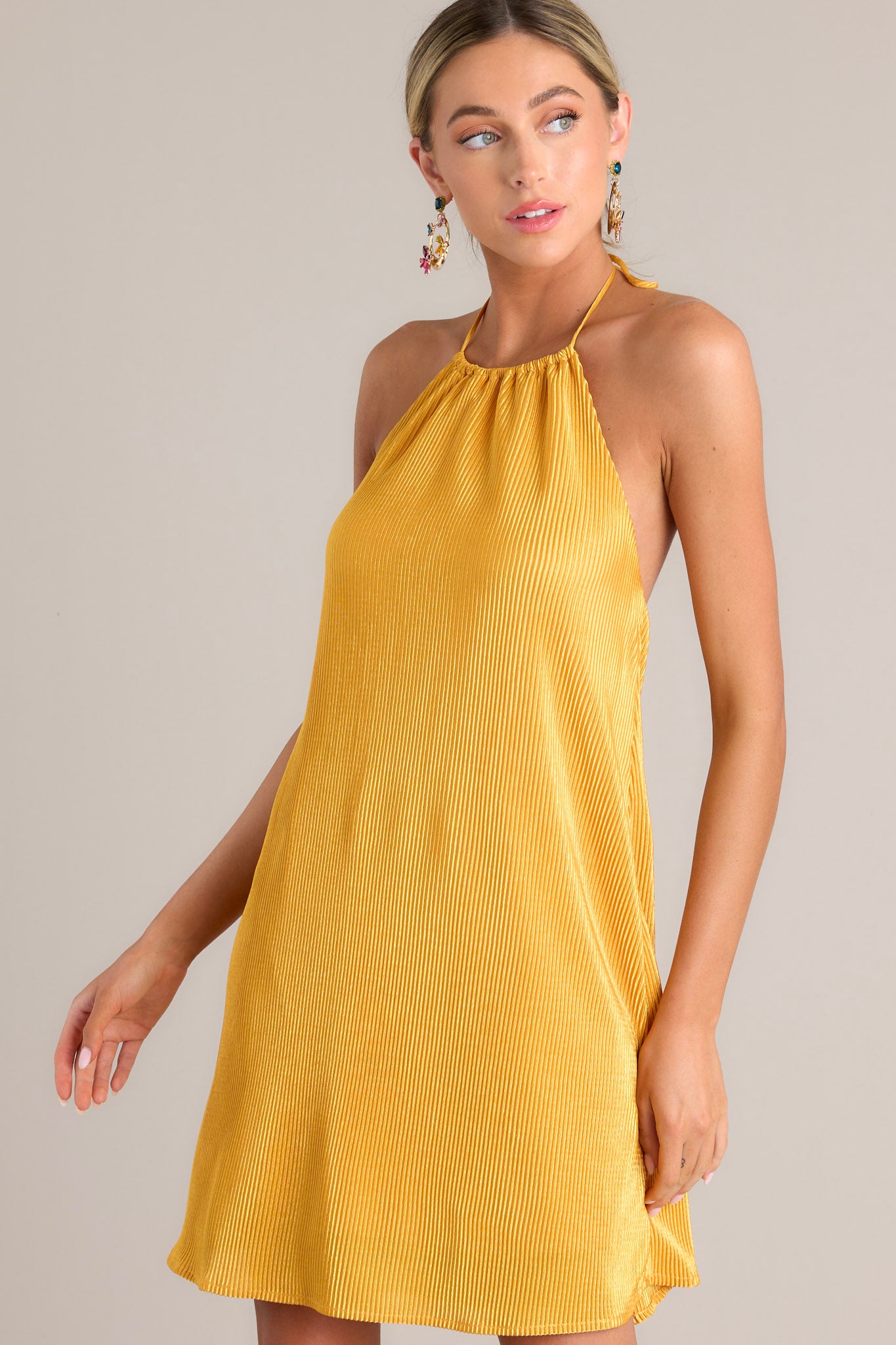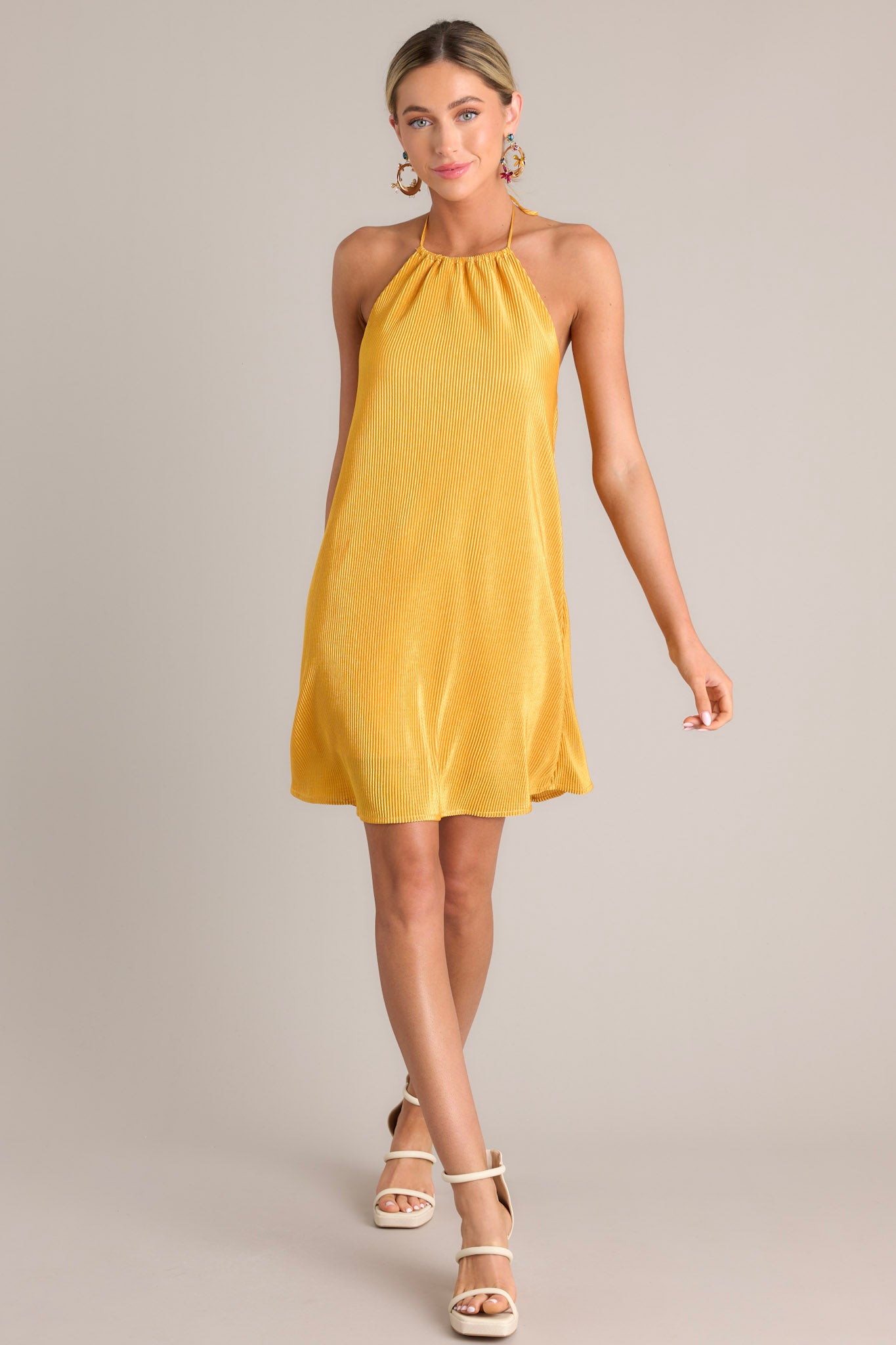 Get ready to shine in the Sunbeam Splendor Goldenrod Ribbed Halter Mini Dress. Its ribbed texture and halter neckline bring a touch of glamour, while the mini length adds a flirty touch. Perfect for a sunny day out or a night on the town! This goldenrod mini dress features a self-tie halter neckline, an elastic band in the back, and an all over ribbed texture.