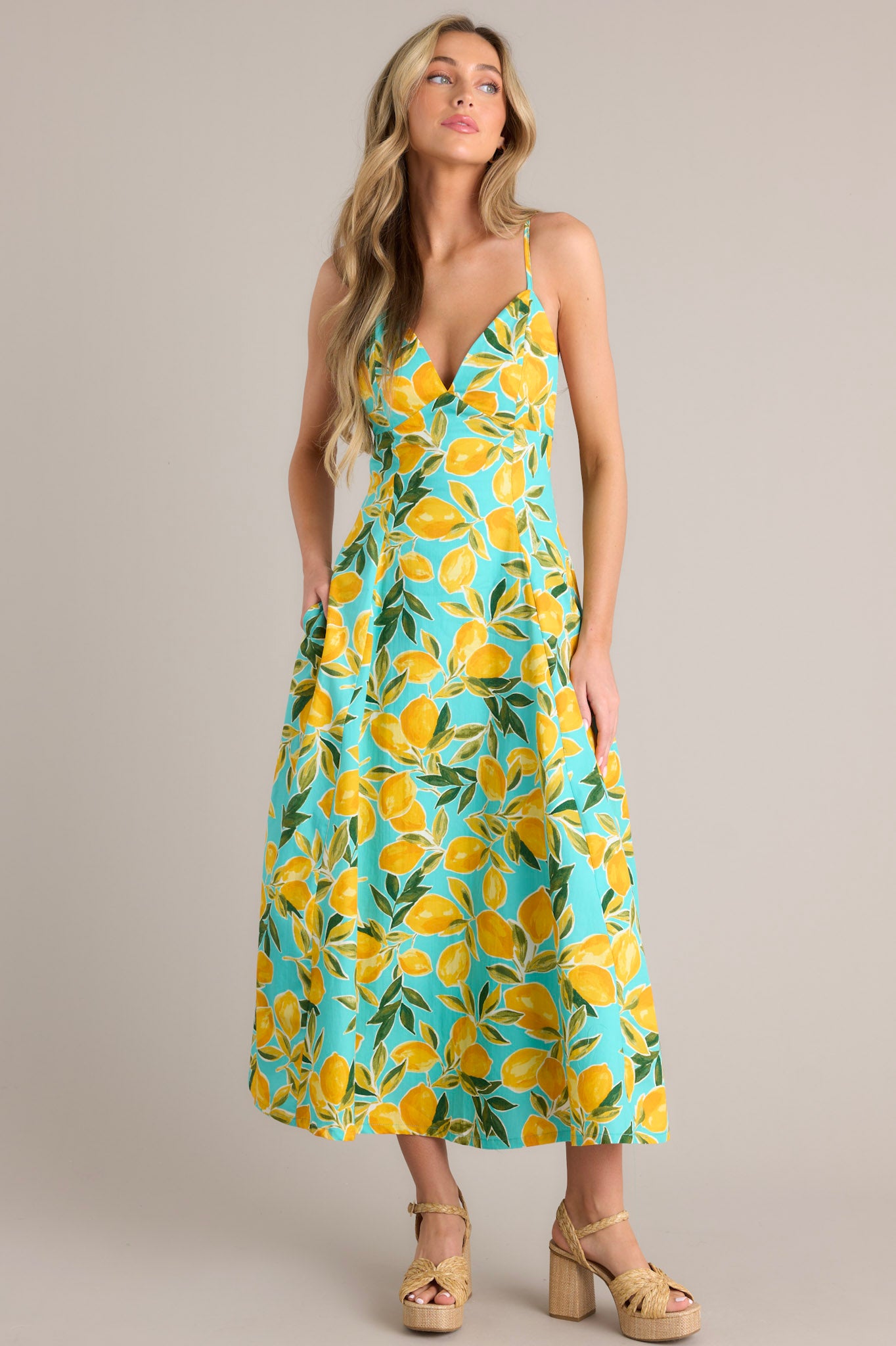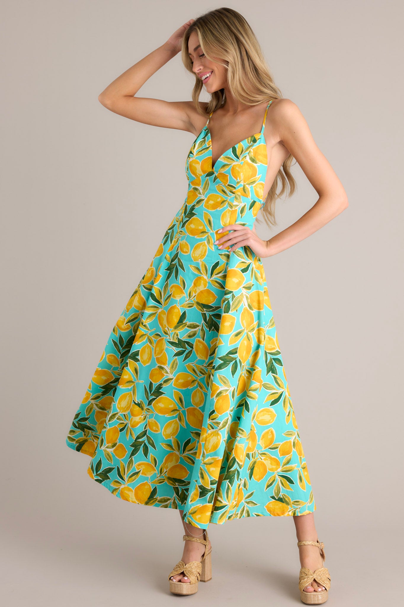 Sunshine Squeeze Aqua Lemon Print Midi Dress