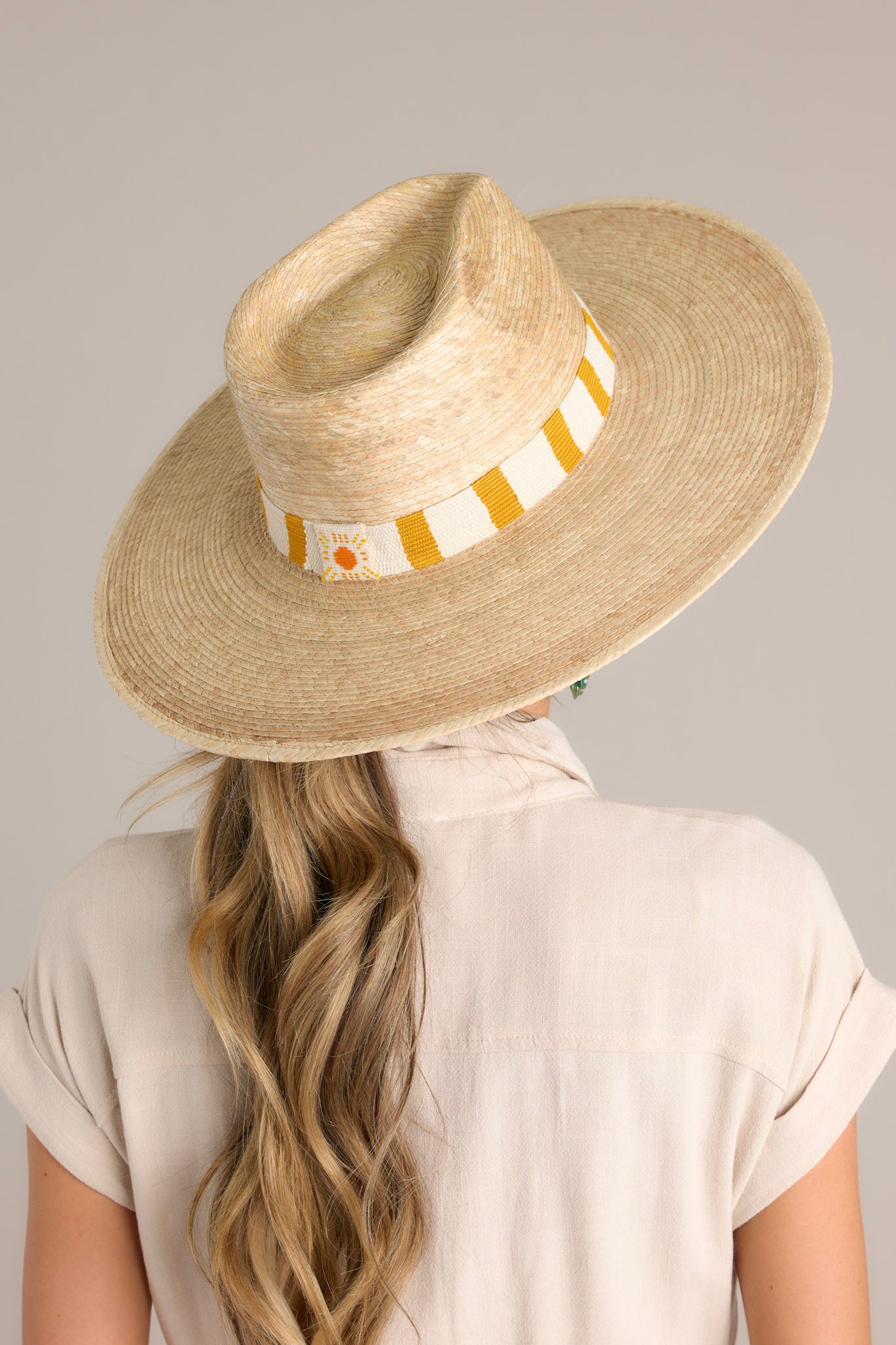 Introducing the must-have accessory for summer: the Sunshine Tienda Carmen Palm Hat. With its playful palm structure and lightweight design, this hat is perfect for any sunny day. Keep cool and stylish while protecting your skin from harmful rays. Don't be caught without it (or a Pina Colada)! The Carmen Palm Hat features a cotton woven band with mustard yellow and white stripes, and is handmade with palm fronds.
