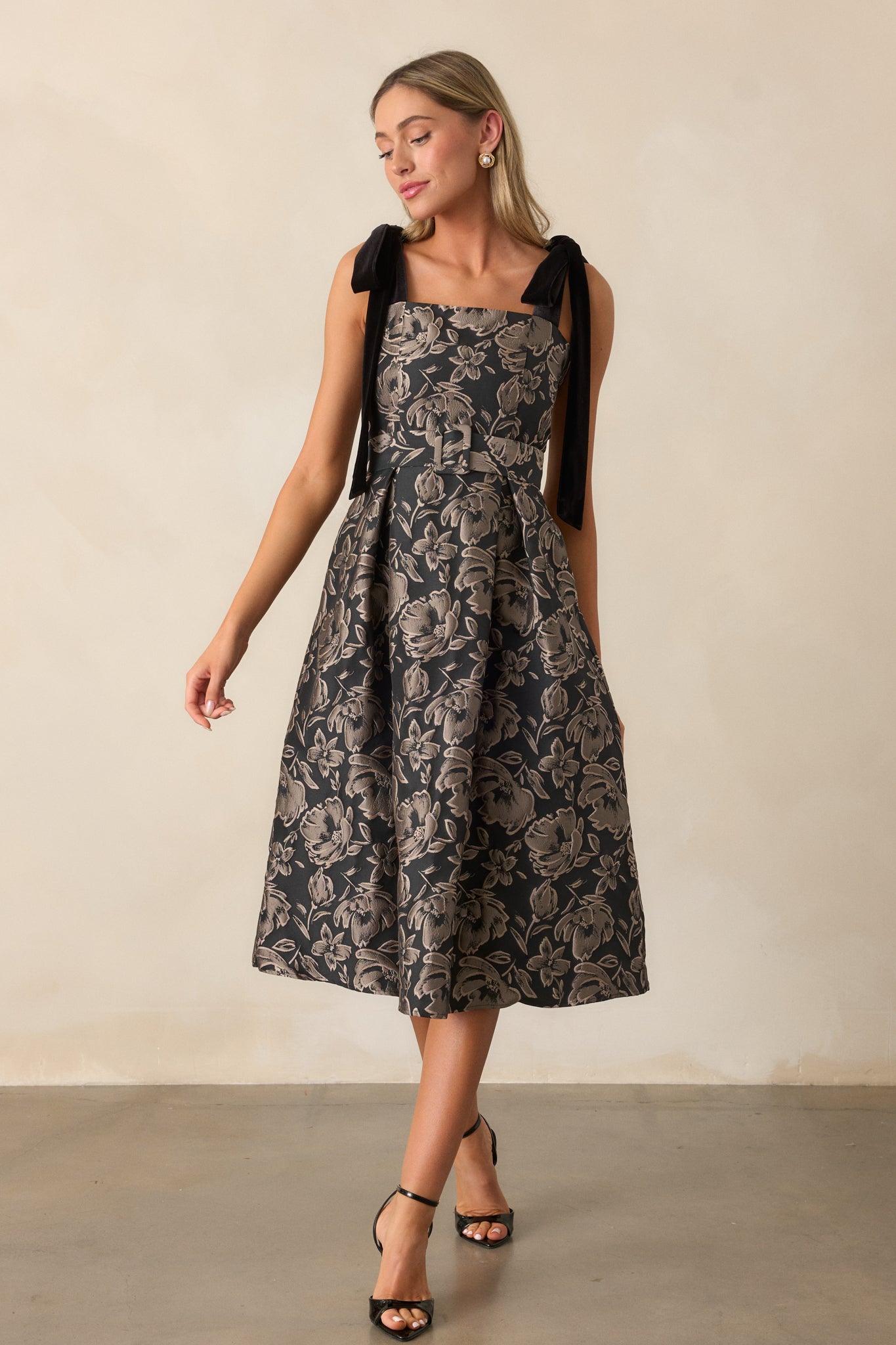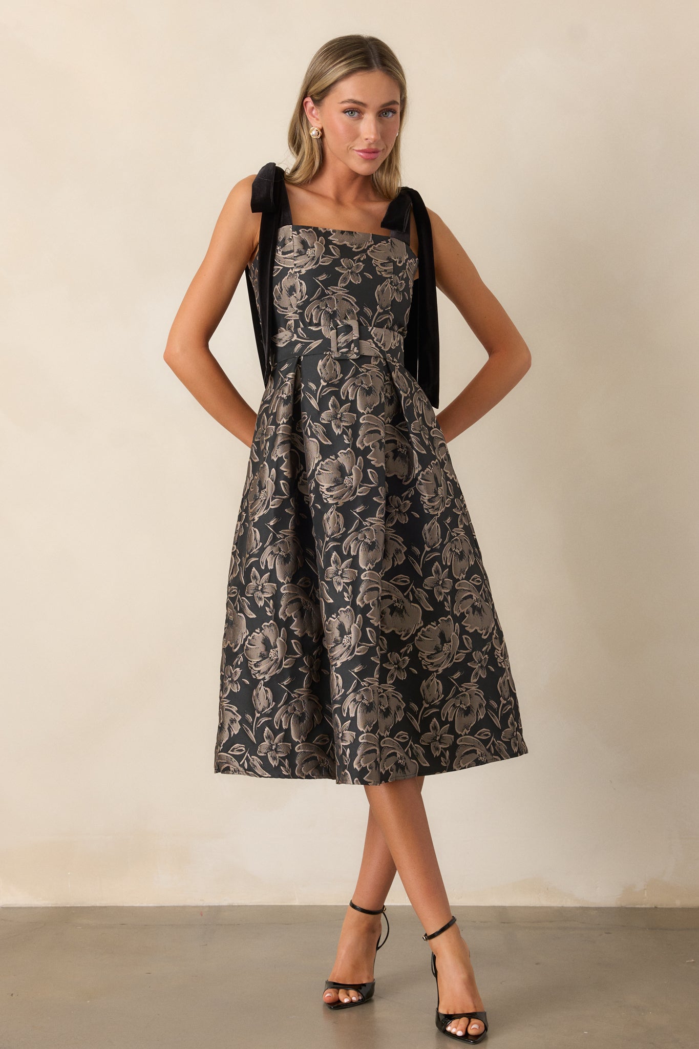 Get ready to turn heads in our Sweet Disposition Black Floral Jacquard Midi Dress! This fancy midi dress is the perfect mix of elegance and style, with its beautiful floral jacquard pattern. You'll feel confident and chic in this dress for any special occasion. This black dress features a square neckline, jacquard fabric, discrete back zipper, and self-tie velvet bow shoulder straps.