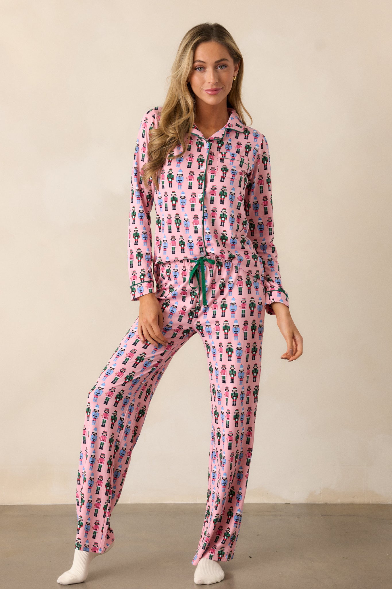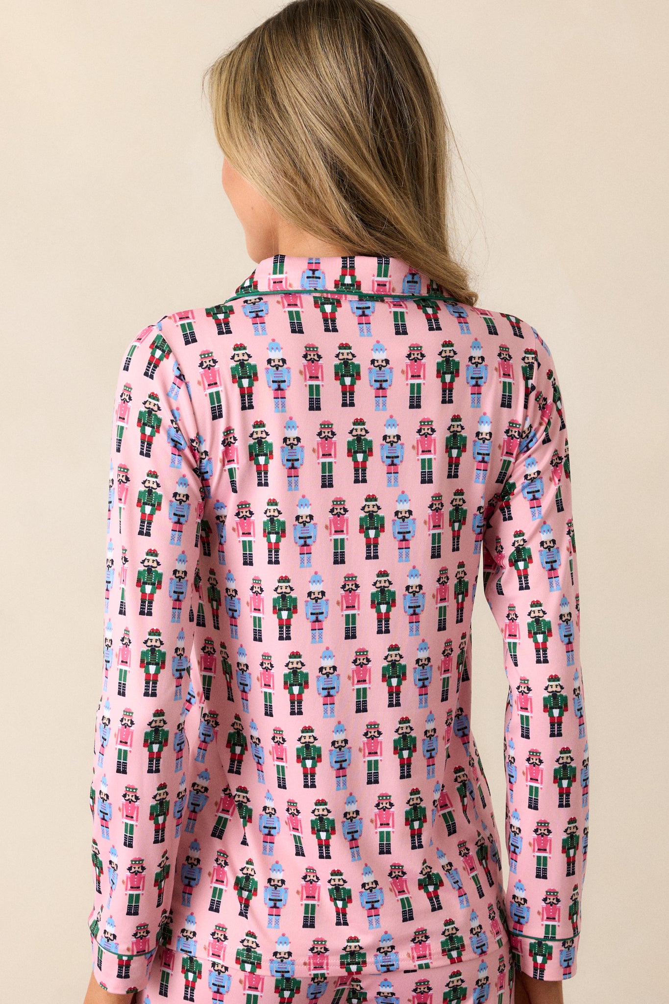 Get ready for a cozy and magical winter with our Tales Of The Nutcracker Pink Pajama Top. Made with soft, breathable fabric, it will keep you cozy and comfortable all night long. Perfect for snuggling up by the fire and dreaming of sugar plum fairies. This pink pajama top features a collared neckline, functional button front, a fun nutcracker pattern, green trim and long sleeves.