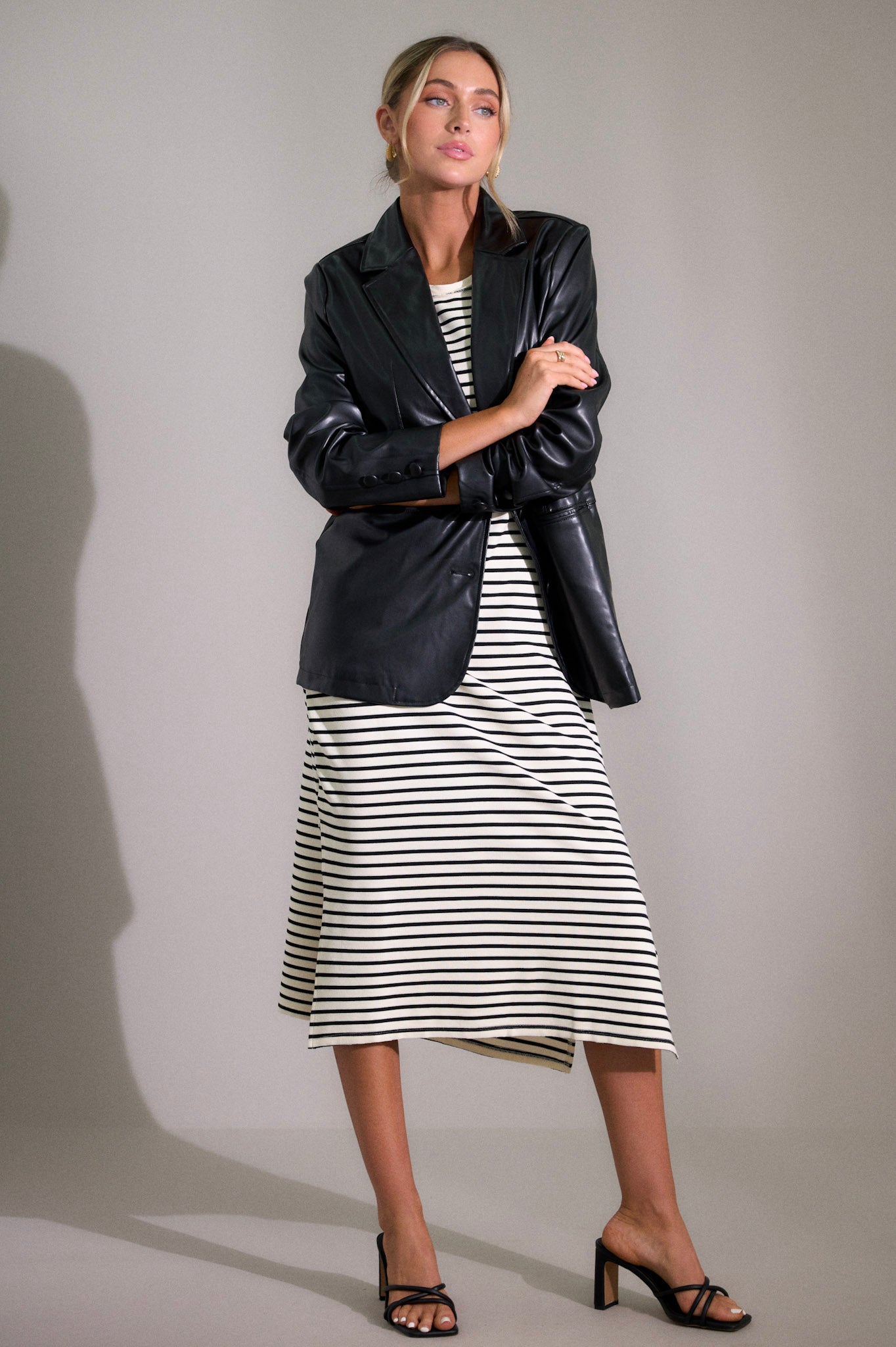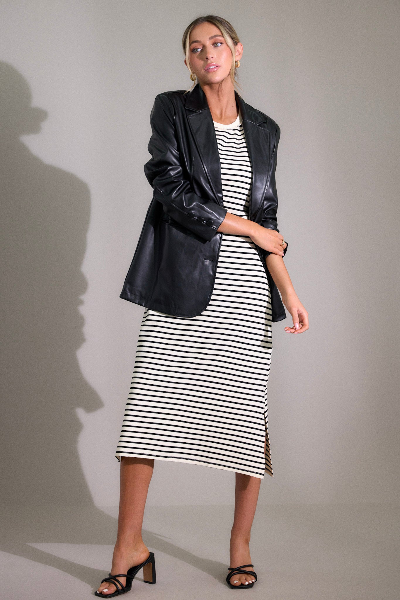 Talk This Way blazer knows how to make a statement! Boasting a sleek black faux leather sharp enough to cut through any crowd, you'll never go unnoticed in this standout piece. Put it on and show the world you mean business! This Black blazer features a collared neckline, long sleeves with non-functional buttons on the cuffs, two functional front pockets, and two functional button closures. Model is wearing a small.