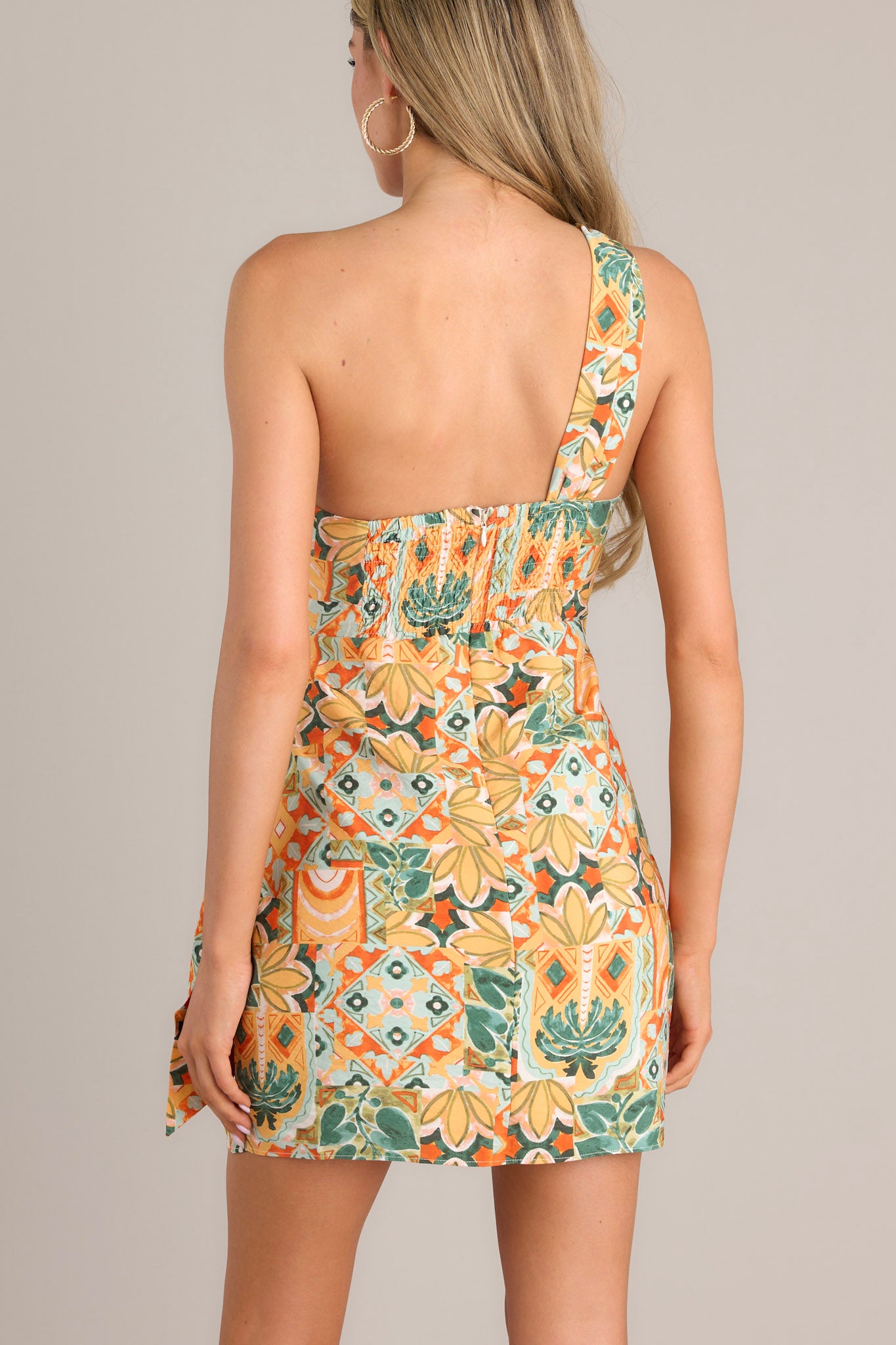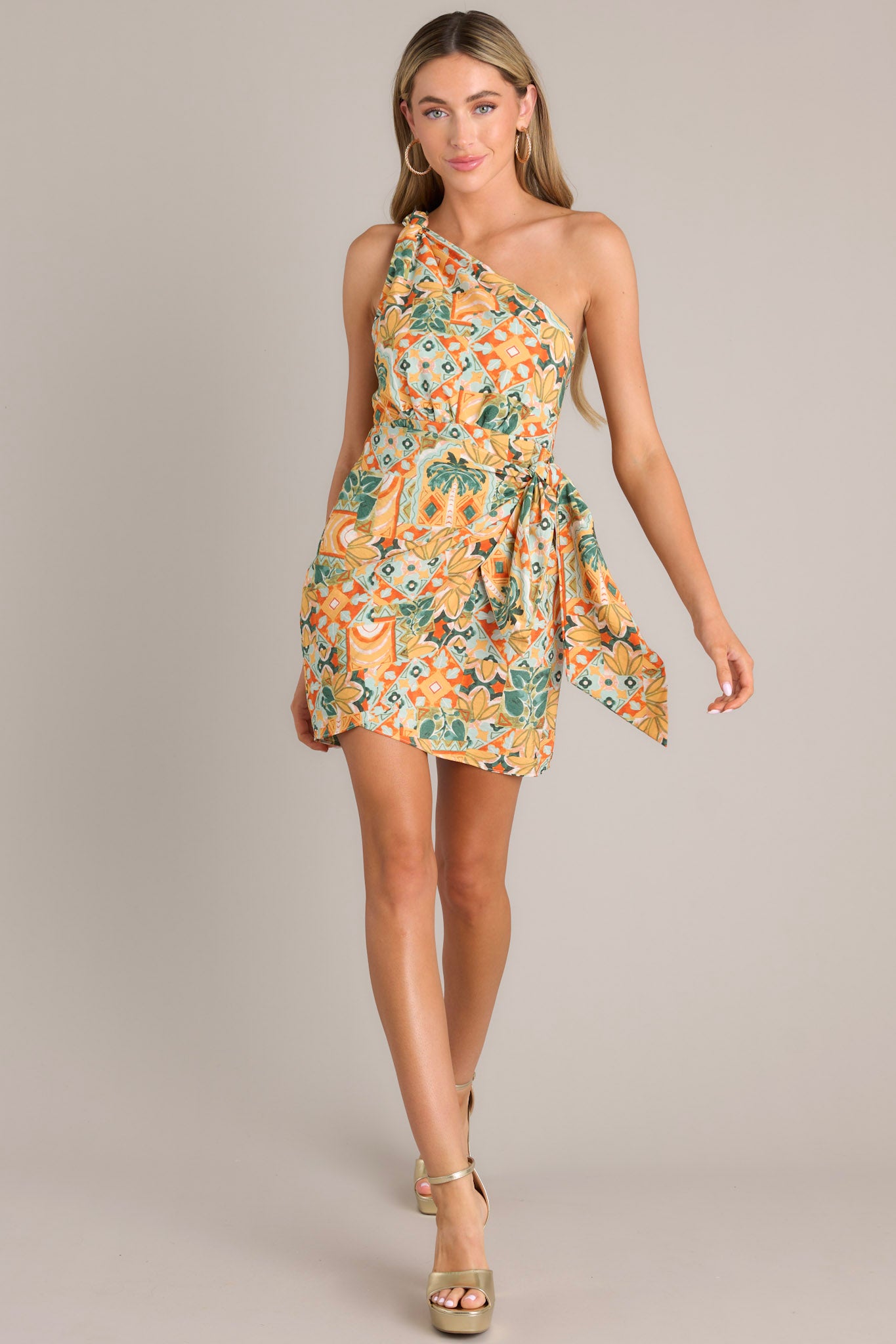 Step into the sunshine with our Tangerine Tango Mini Dress! This light orange floral number is perfect for any summer occasion. Its fun and flirty design will have you feeling confident and stylish. Don't miss out on this must-have piece! This dress features an asymmetrical neckline, a knot detail, a smocked back insert, a discrete zipper, a self-tie wrap feature, and a unique eye-catching print.