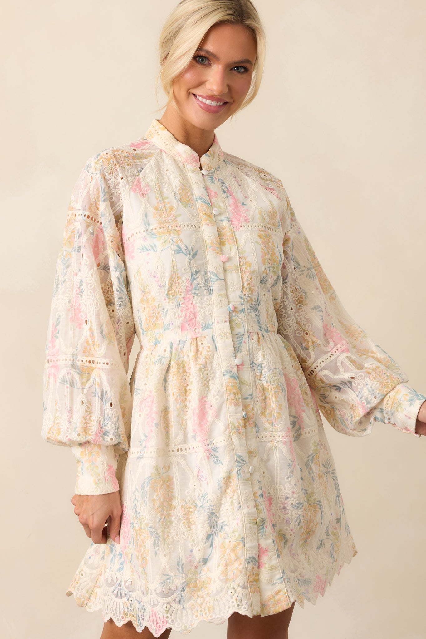 The Art Of Being Ivory Floral Embroidered Eyelet Mini Dress is a charming choice for embracing the beauty of simplicity. It's perfect for those moments when you want to feel elegant and carefree, with a sense of artistry that makes every moment special. This ivory dress features a multicolor floral print, embroidered eyelet detailing throughout, a high neckline, functional button front, button cuff long sleeves, and a scalloped bottom hem.