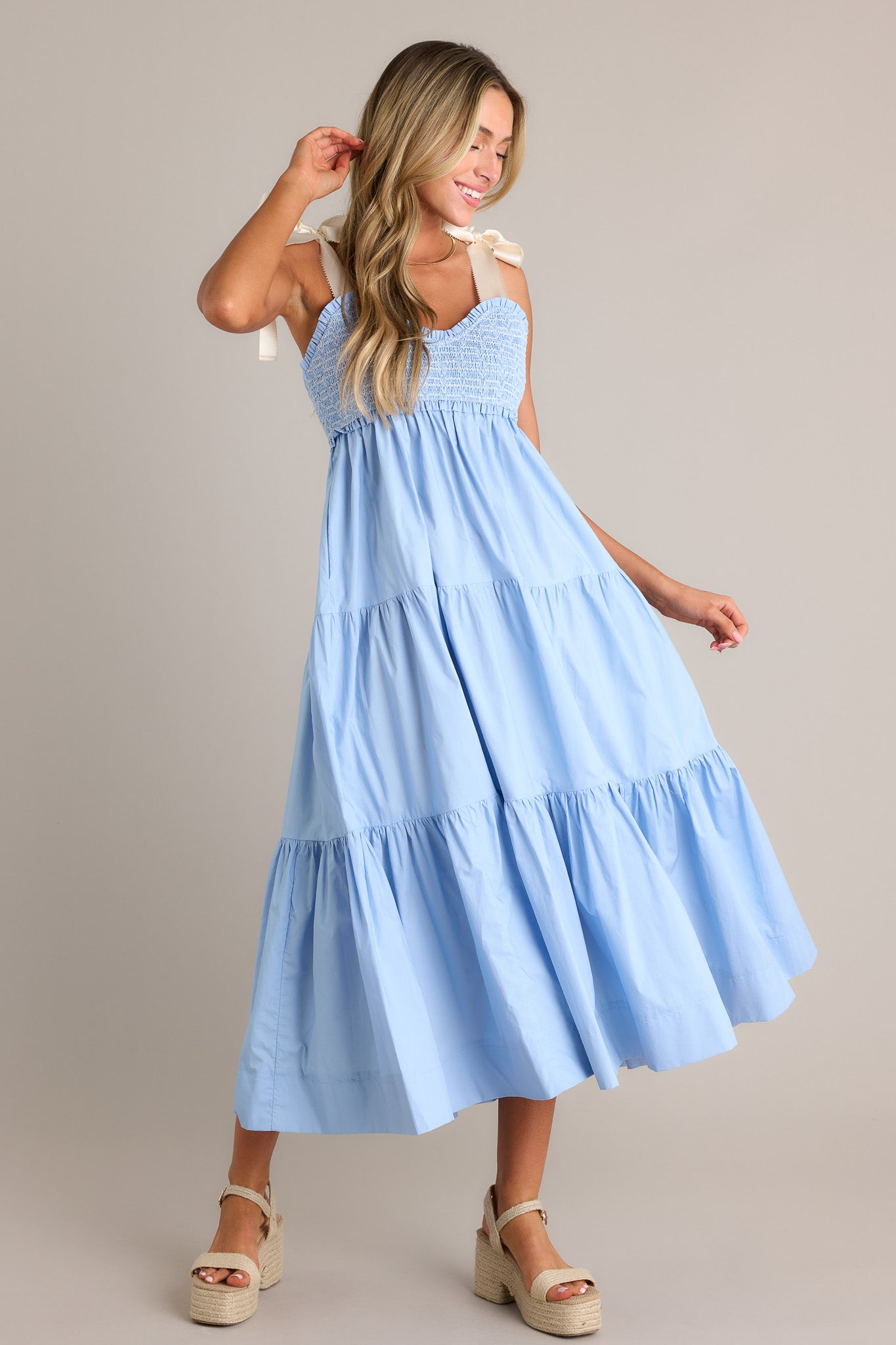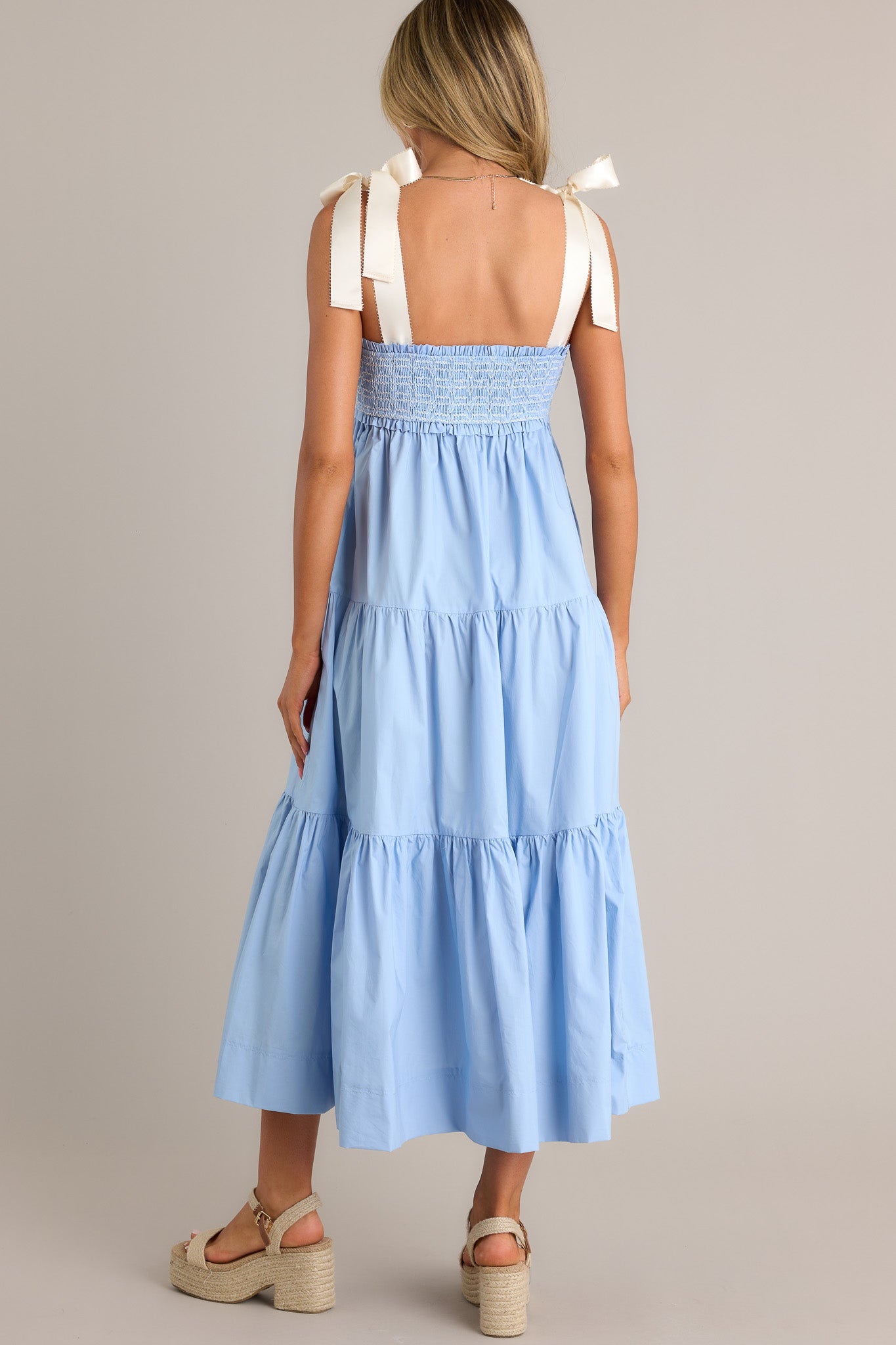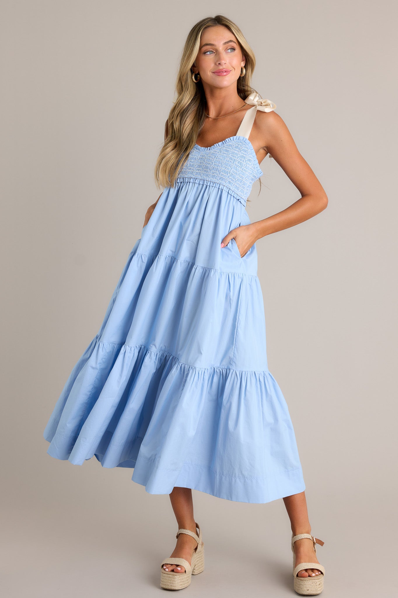 Indulge in the enchanting elegance of The Felicity Light Blue Cotton Midi Dress. With its flowing silhouette and vibrant color, this dress will transport you into a peaceful state of mind. Perfect for any special occasion, embrace the serenity of this stunning dress. This light blue maxi dress features a v-neckline, thick self-tie straps, a fully smocked bodice, functional hip pockets, and a tiered design.
