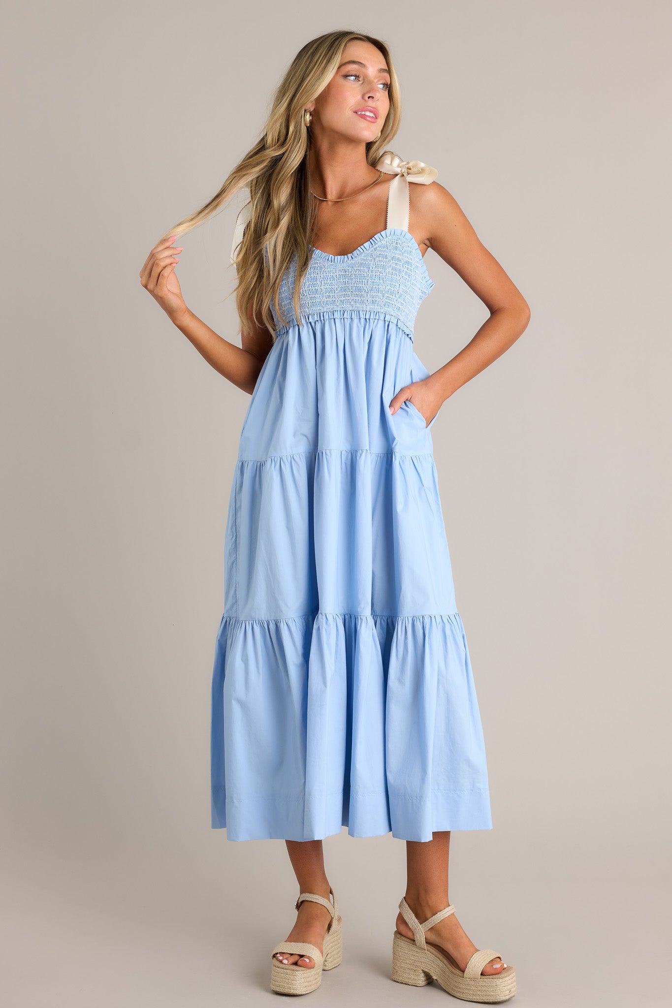 Click to zoomFront angled view of a light blue maxi dress featuring a v-neckline, thick self-tie straps, a fully smocked bodice, functional hip pockets, and a tiered design, w
