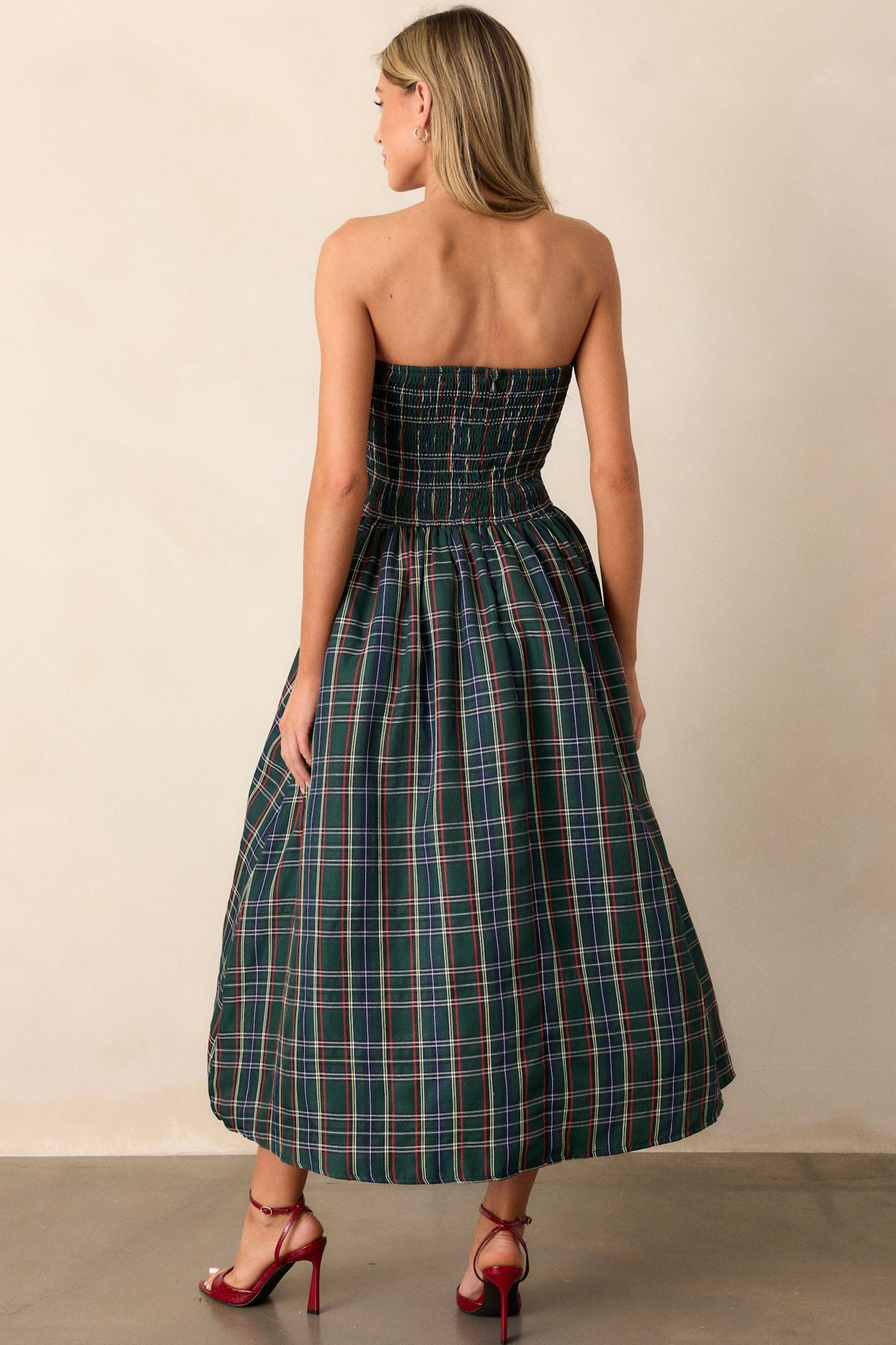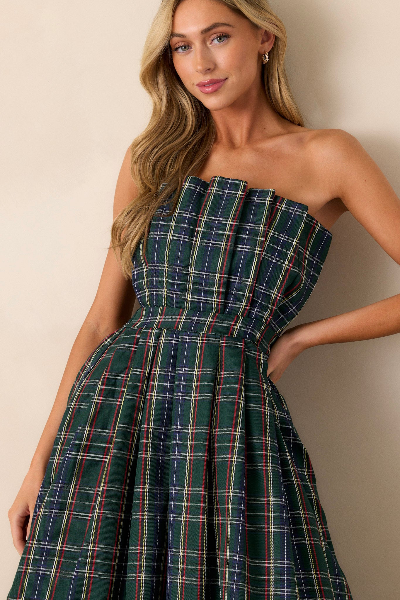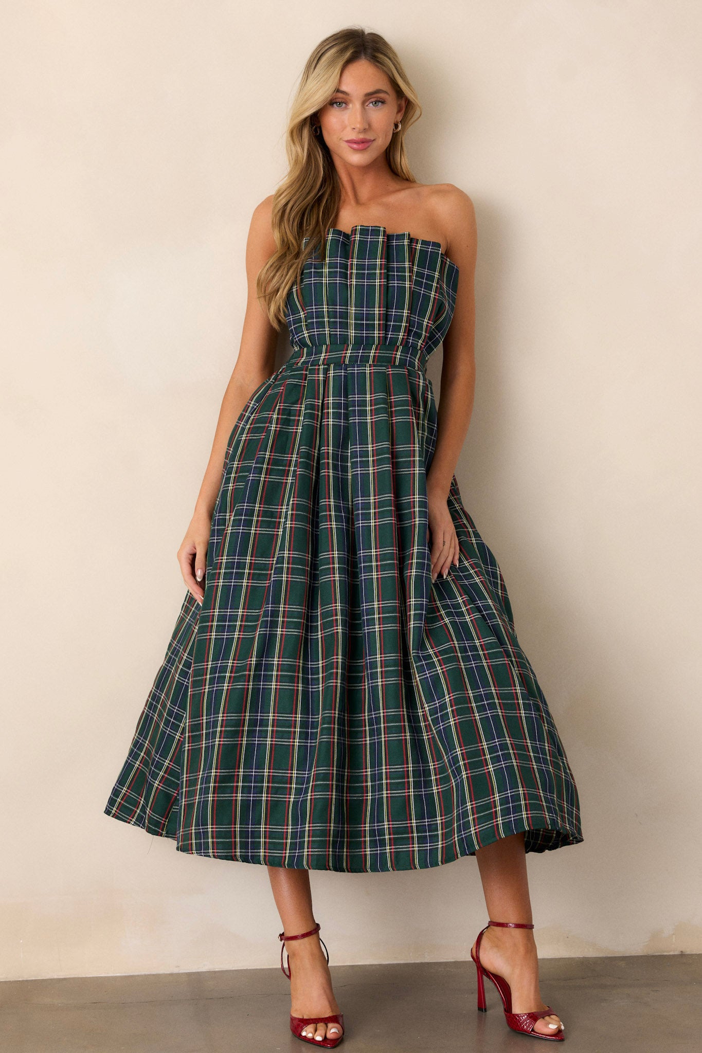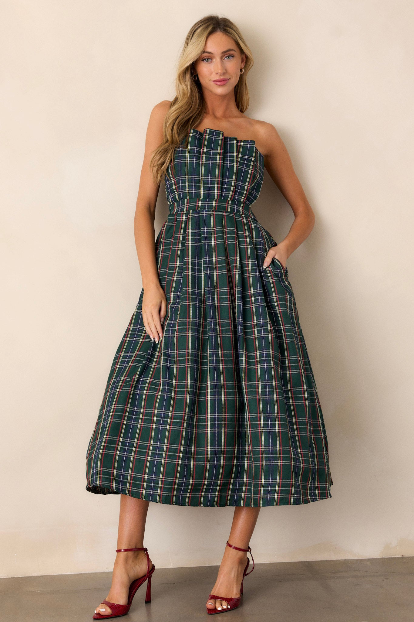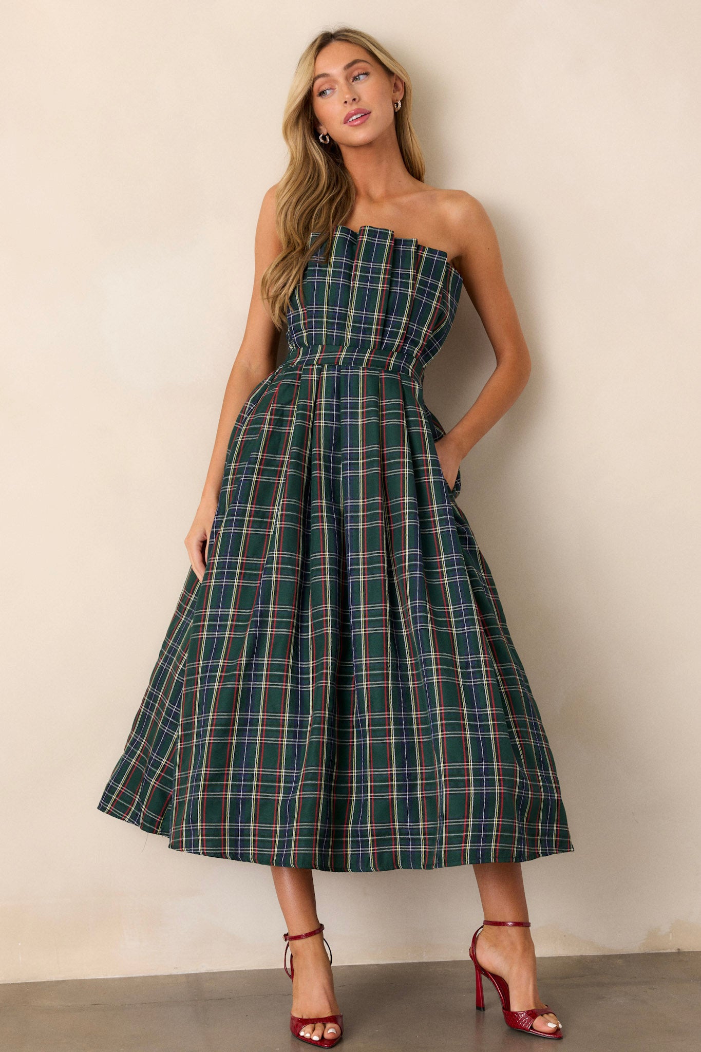The Genevieve Green Plaid Strapless Midi Dress features a stunning plaid design and a comfortable strapless neckline. Let our best selling silhouette embrace you as you dance the night away, feeling confident and stylish. This elegant hunter green dress features a pleated bodice, a slightly pleated skirt, functional hip pockets, a smocked back, a discrete back zipper and a strapless design.