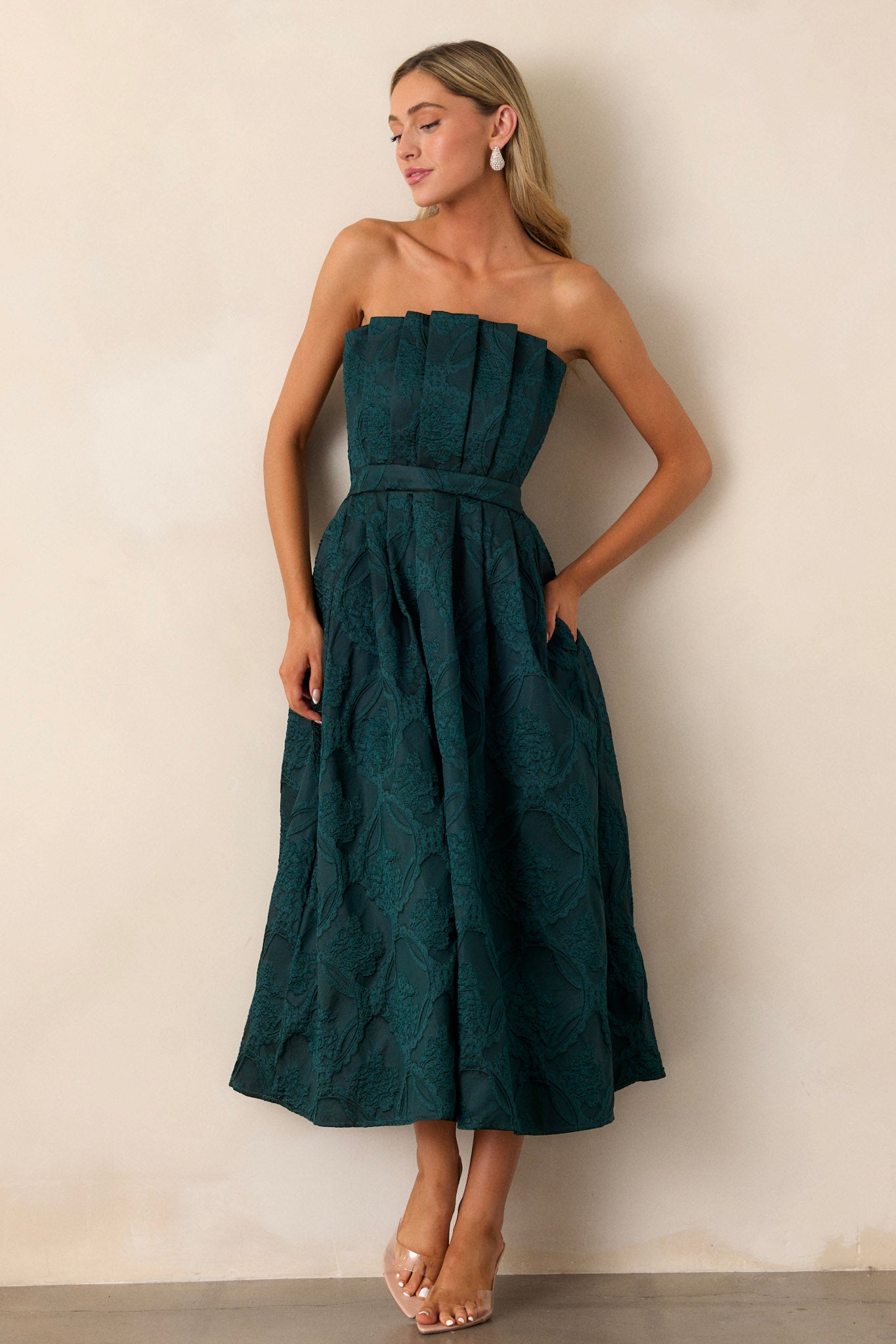 The Genevieve Hunter Green Floral Jacquard Midi Dress features a stunning floral design and a comfortable strapless neckline. Let our best selling silhouette embrace you as you dance the night away, feeling confident and stylish. This elegant hunter green dress features a pleated bodice, a slightly pleated skirt, functional hip pockets, a smocked back, a discrete back zipper and a strapless design.