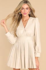 Look absolutely stunning in this Hope of It All Beige Faux Leather Dress! This fashion-forward piece is sure to be a show-stopper with its polished style and classic design. Put yourself in the spotlight and take 'em all by surprise! This dress features a v-neckline with a metal button clasp at the bust, slight puff sleeves with cuffs, a back zipper closure, and a pleated skirt. Model is wearing a size small. • 50% Polyurethane, 47% Polyester, 3% Spandex • Hand Wash Cold • Unlined • Imported