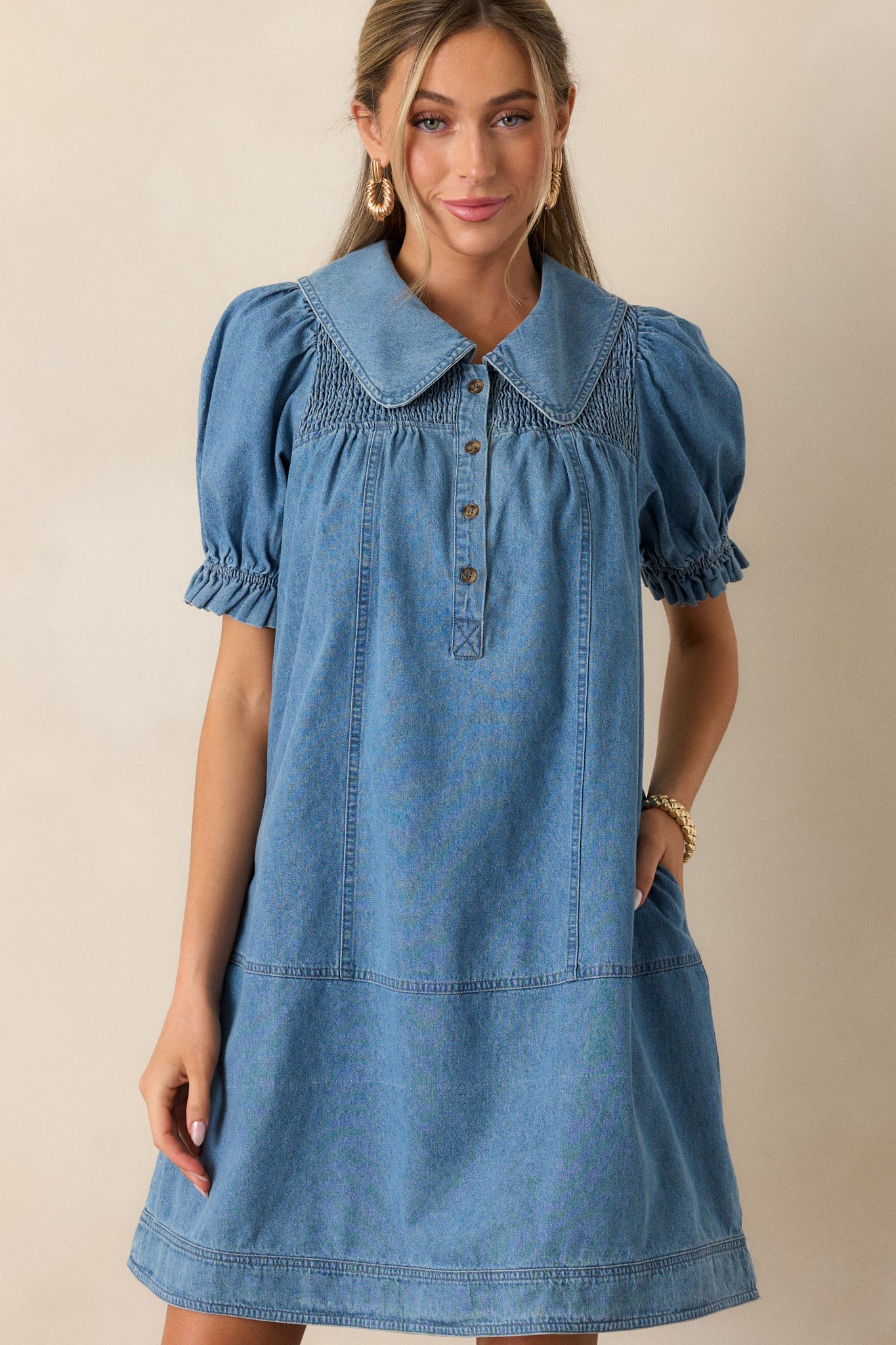Introducing The Tide Calls 100% Cotton Medium Wash Denim Mini Dress. Made with durable and breathable cotton, this dress offers both style and comfort. Perfect for any casual setting, it's a versatile addition to your wardrobe. Embrace the relaxed, coastal vibes and effortlessly elevate your look with this timeless piece. This medium wash denim dress features a peter pan collared neckline with functional buttons, smocked yoke detailing, a shift style, and puff sleeves with elastic ruffle cuffs.