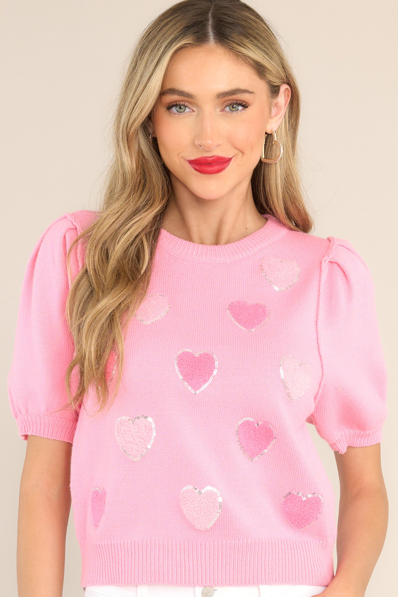 Get ready to embrace your emotions with our These Feelings Pink Sweater Top! Made with a soft, cozy material that will keep you warm and stylish. Perfect for expressing your unique personality, this top will be your new go-to. Don't hold back, let your feelings shine through! This top features a crew neckline, textured hearts with sequin detailing, puffed sleeves, and a ribbed hemline.
