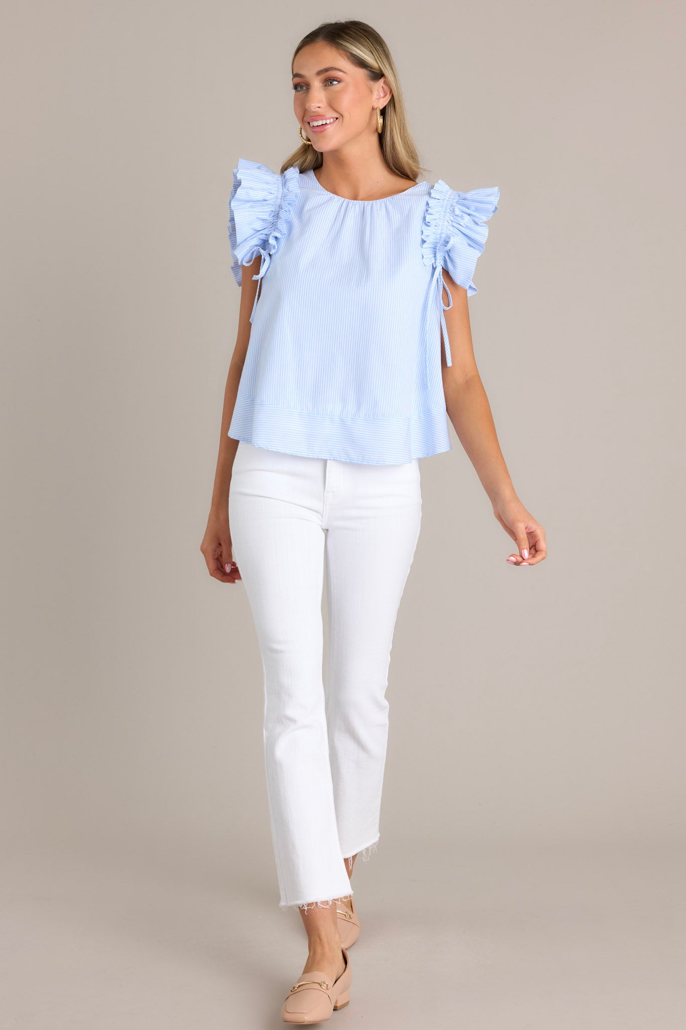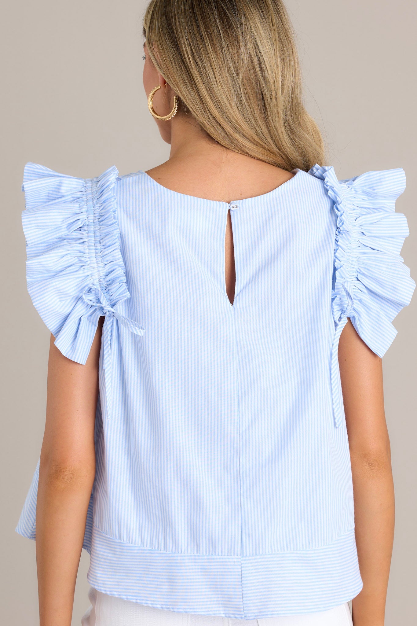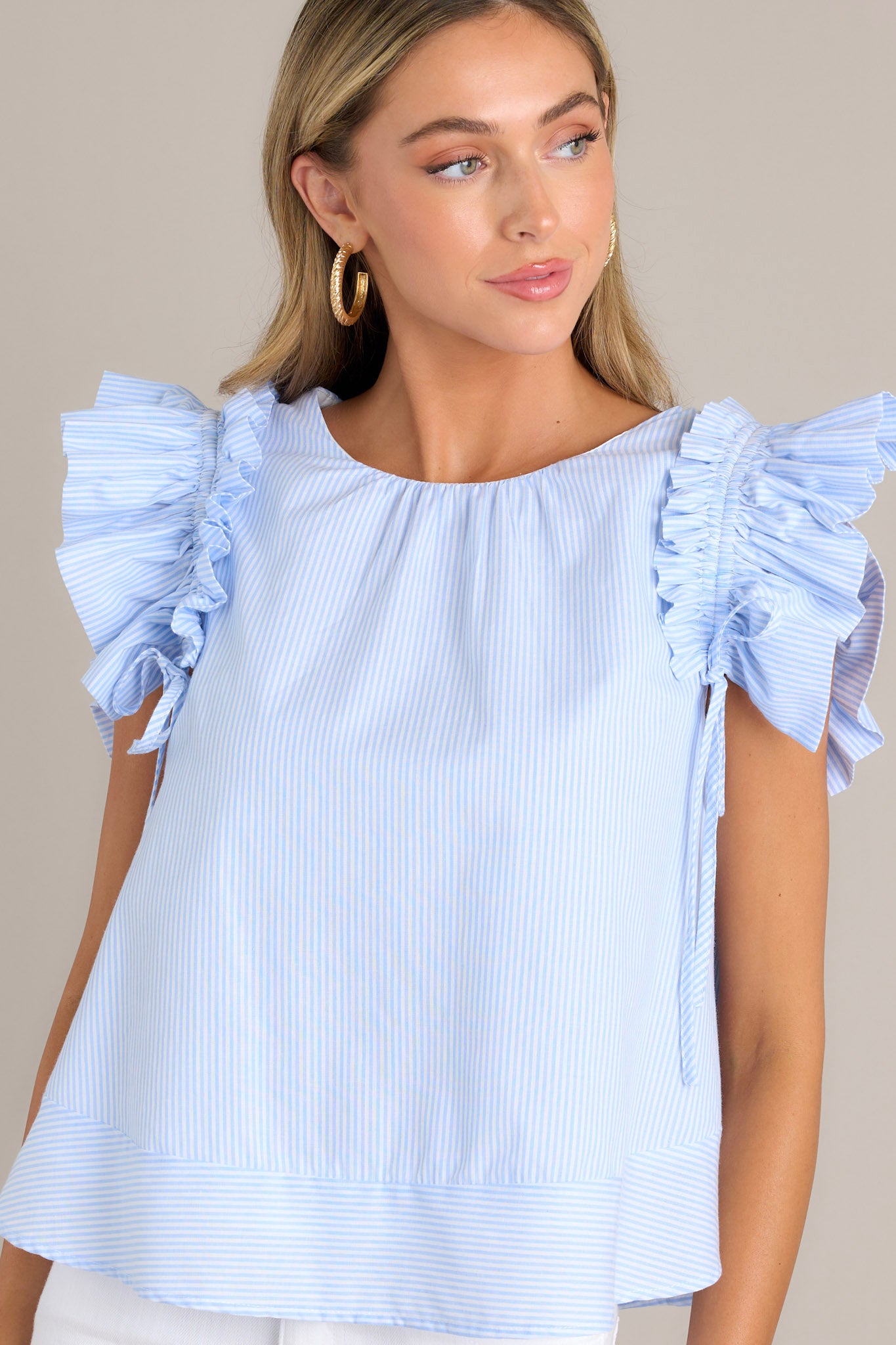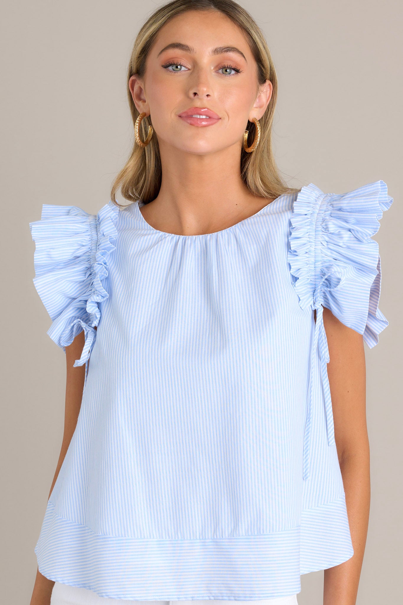 Introducing the Tidal Grace Light Blue Stripe Top! Made with 100% cotton, this top provides all day comfort. Perfect for adding a touch of whimsy to any outfit. This blue stripe top features a relaxed loose fit, a crew neckline, vertical stripes, and layered ruffle sleeves with adjustable bows that can be tied tighter or looser for a customizable fit.