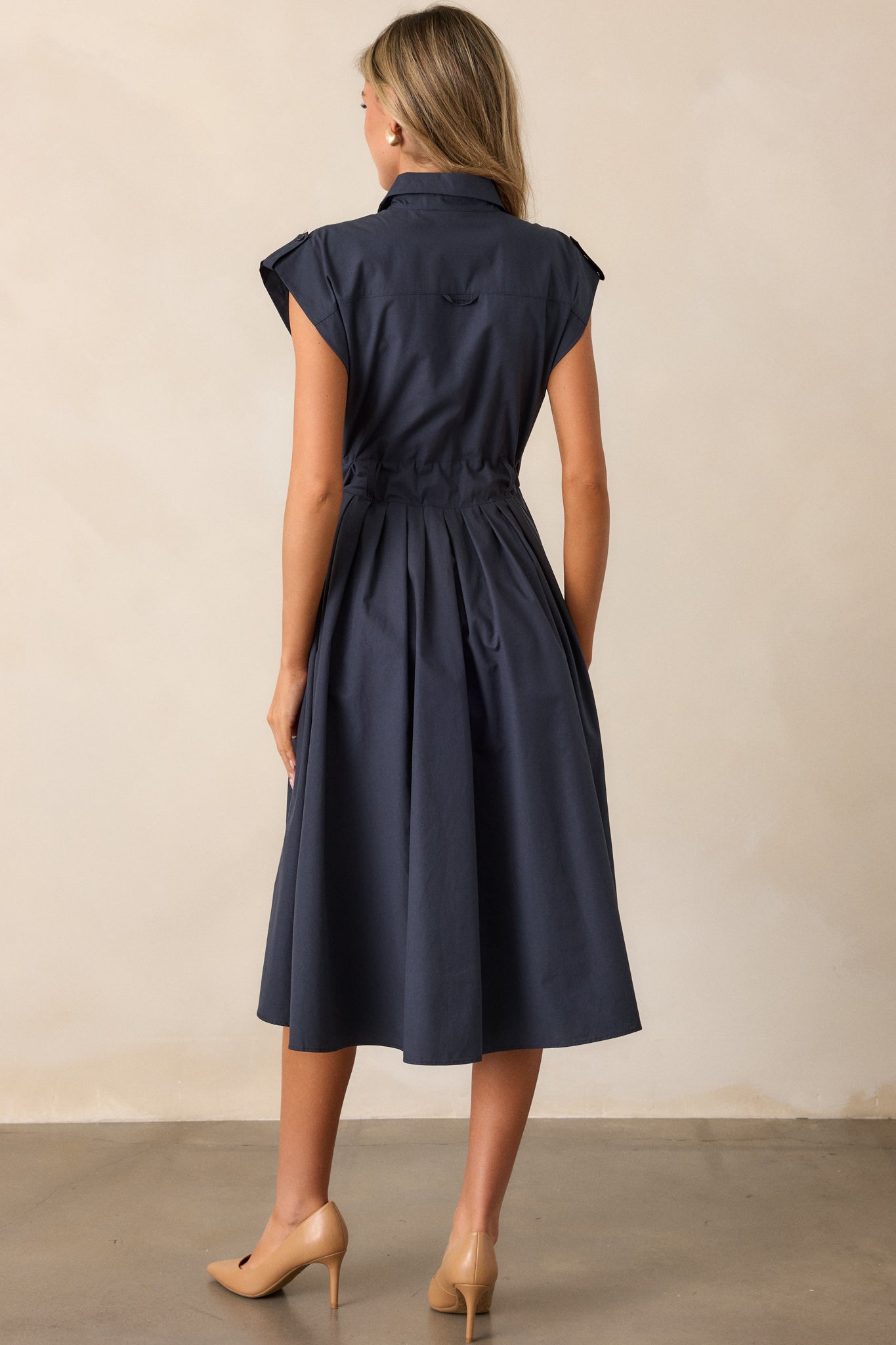 This versatile navy cap sleeve midi dress is perfect for any occasion. With a flattering silhouette and comfortable fit, it will tie seamlessly into your wardrobe. Dress it up with heels or keep it casual with sandals. Effortlessly stylish, this dress is a must-have for any fashion-forward individual. This navy dress features a functional button front, a functional breast pocket, a collared neckline, a self-tie belted waist, and cap sleeves.