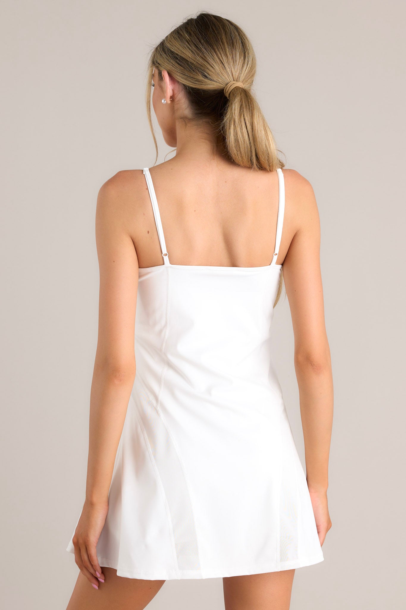 Looking for a dress that's comfortable, versatile, and stylish? Look no further than our Timeless Journey White Athleisure Mini Dress! With its unique combination of athletic and leisure wear, this dress is perfect for any occasion. Made with high-quality materials, it's durable and long-lasting. Upgrade your wardrobe with this one-of-a-kind dress today! This dress features a rounded neckline, thin adjustable straps, a built-in shelf bra, built-in shorts with functional pockets, and semi transparent detailing.