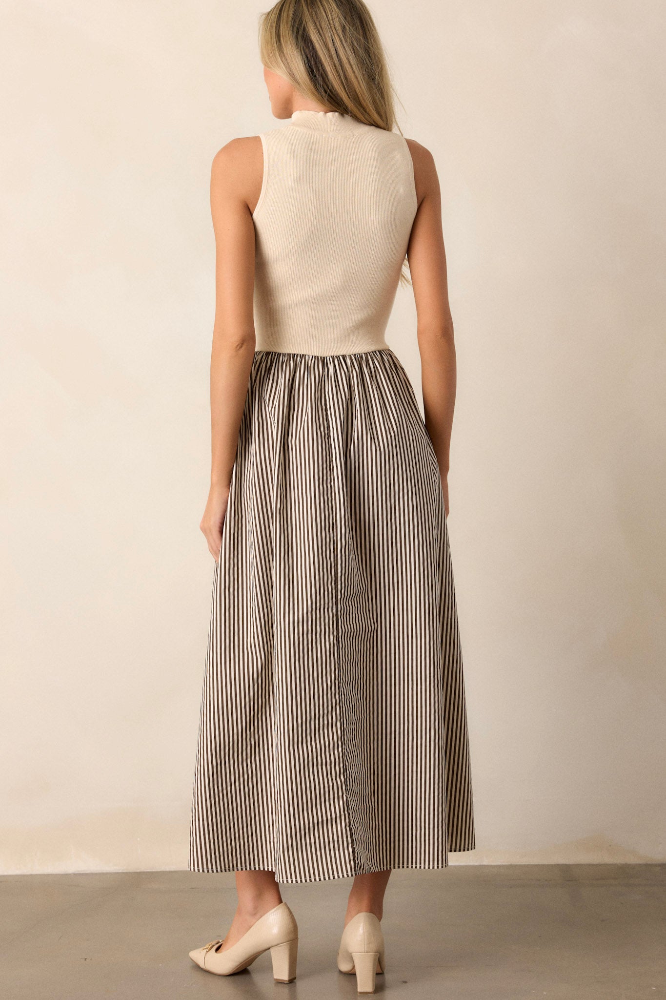 Toffee Dreams Beige Stripe Mock Neck Midi Dress