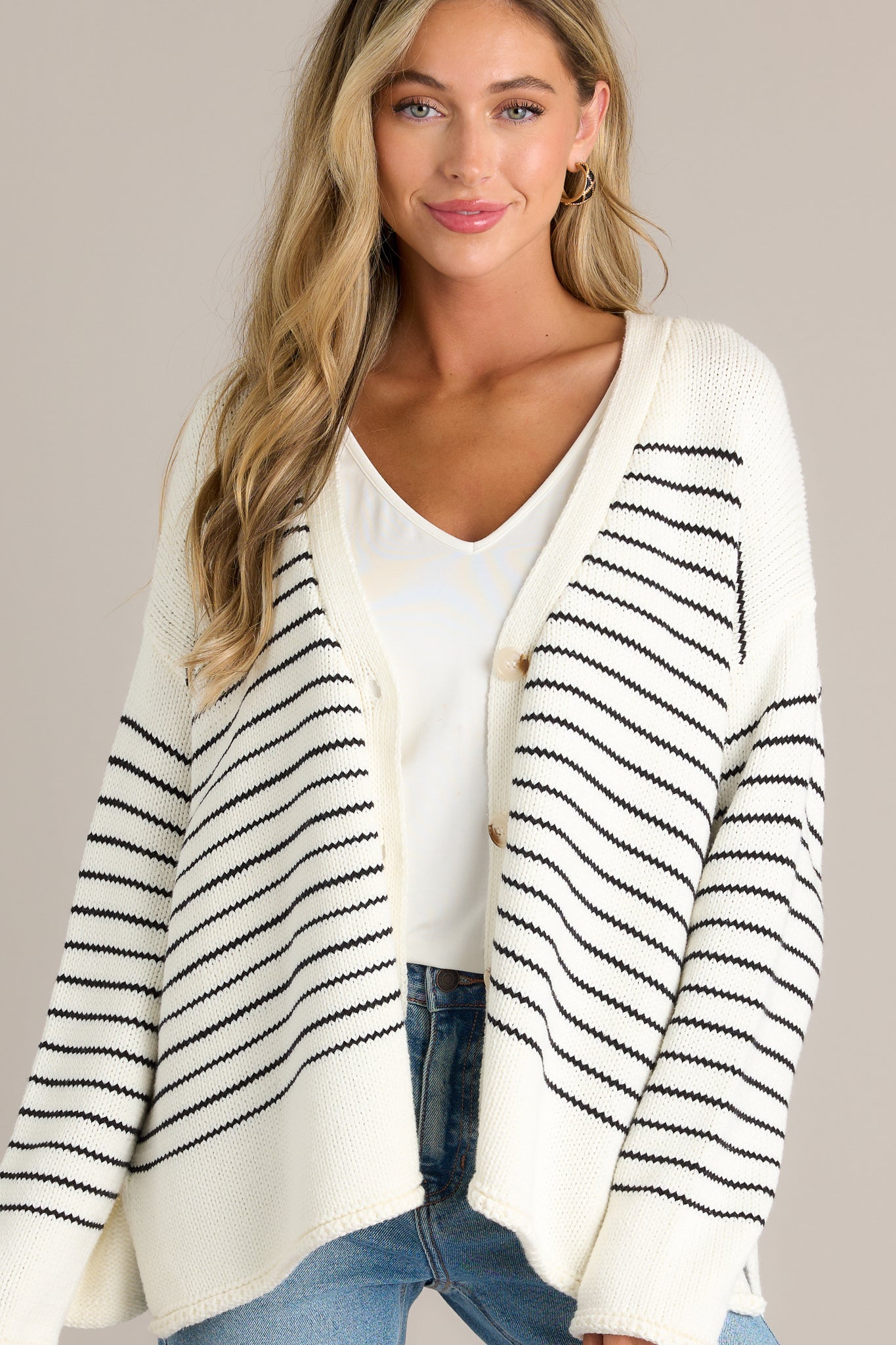 Stay cozy and stylish in our Twilight Solstice ivory knit cardigan! This long sleeve cardigan is perfect for chilly weather and adds a touch of warmth to any outfit. The lightweight knit material is perfect for layering, while the ivory color gives a timeless and trendy look. Perfect for any fashion-forward and playful individual! This ivory knit cardigan features a v-neckline, a functional button front, a black stripe design, small side slits in the hemline, and a knit texture throughout.