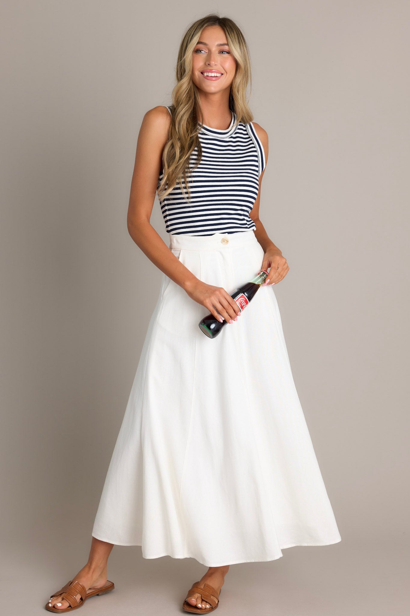 Unleash your Unfiltered Joy with this navy and white stripe tank! Made with high-quality fabric and a comfortable fit, this tank is perfect for any casual occasion. Let your carefree and playful side shine through with this fun and quirky tank. This tank features a ribbed scoop neckline, a classic stripe pattern, a ribbed texture, and a scoop hemline.