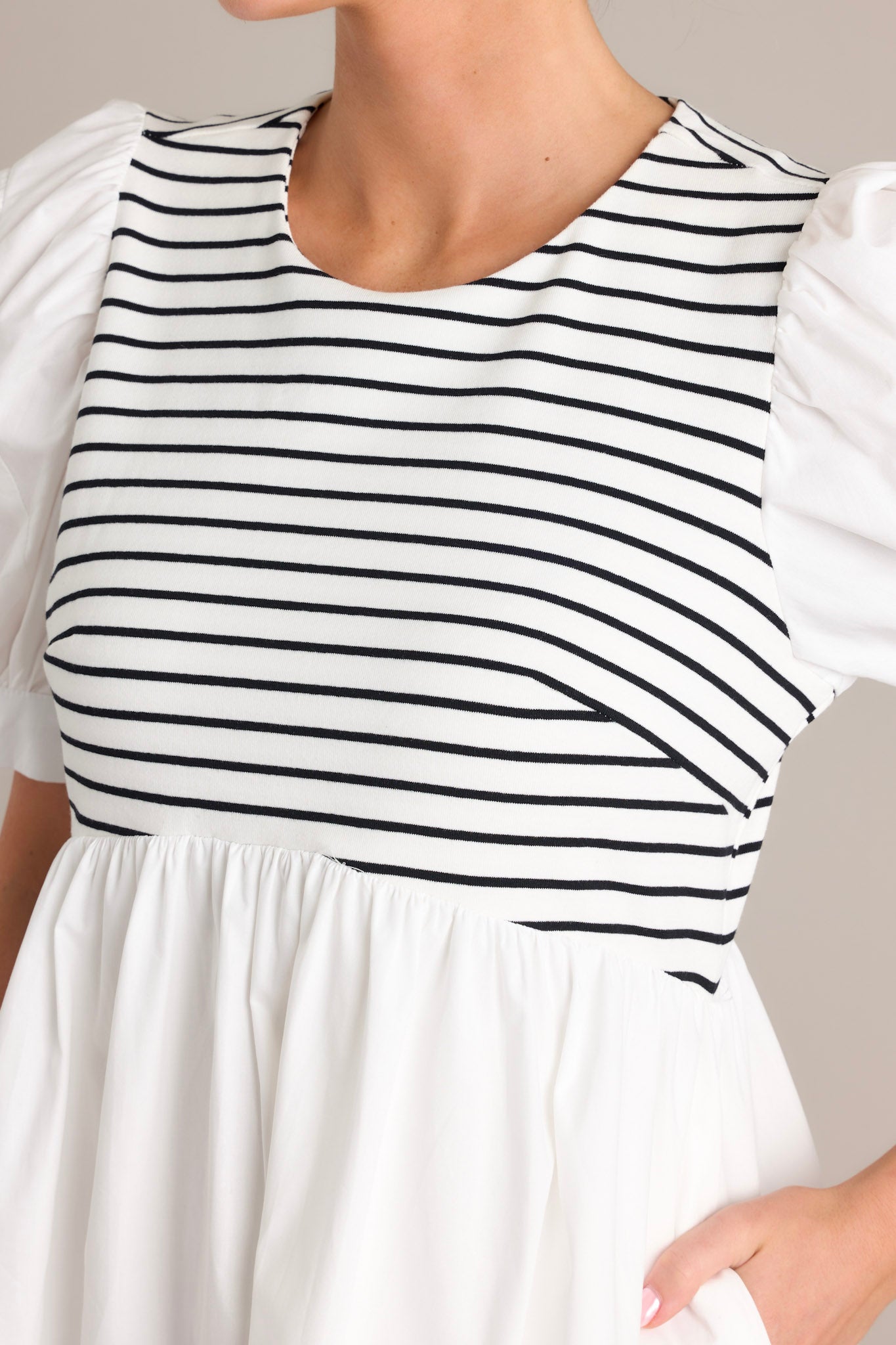 Get playful in the Urban Streak Black Stripe Mini Dress. This quirky dress features slimming black stripes and a mini length for a fun and flirty look. Perfect for a night out on the town or a casual day out. Don't miss out on this must-have piece for your wardrobe! This stripe mini dress features a round neckline, a keyhole with a functional button, a striped bodice, functional hip pockets, and short cuffed puff sleeves.