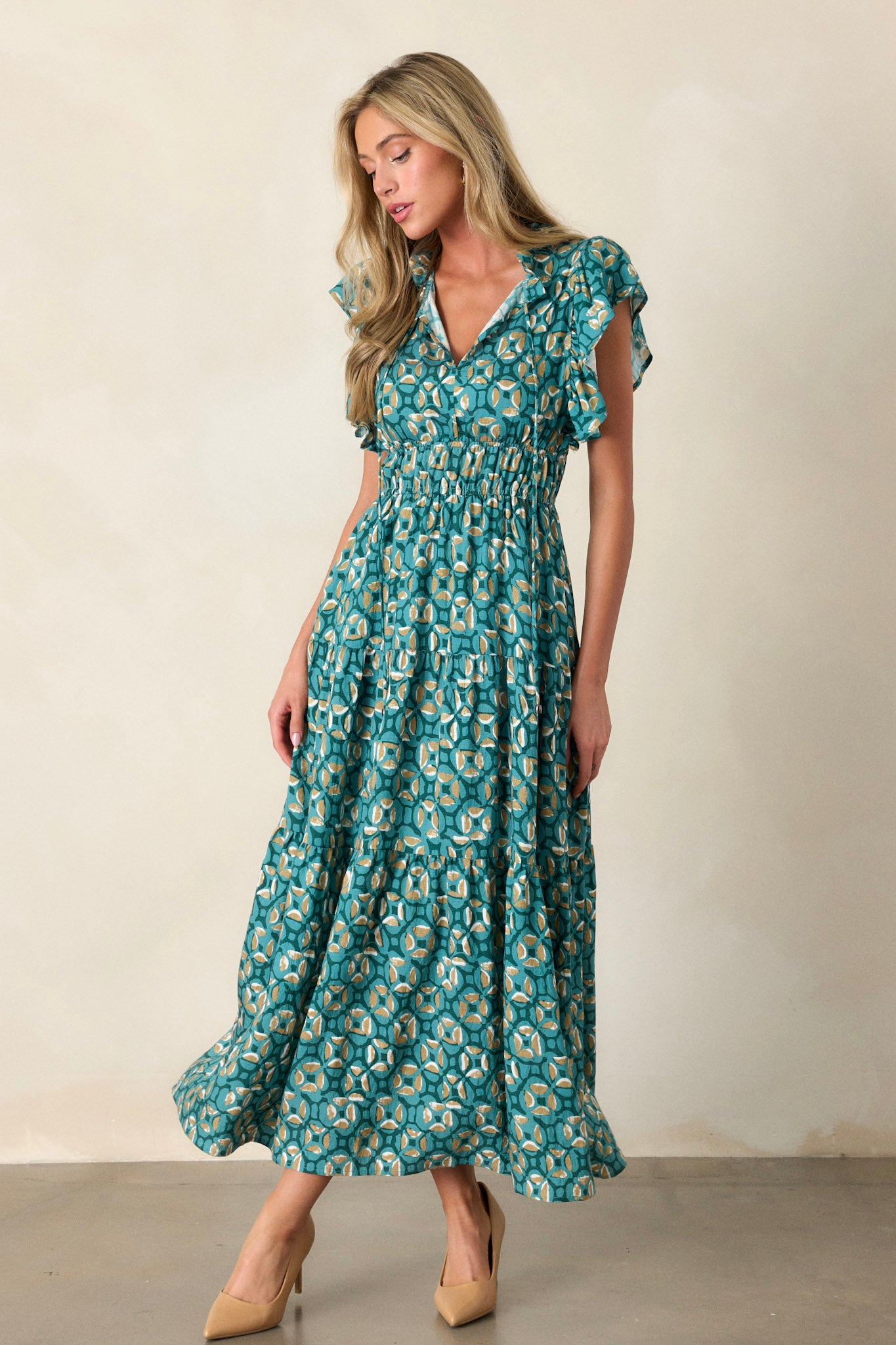 Capture vintage vibes in our Vintage Vow Green Ruffle Sleeve Maxi Dress! The dreamy ruffled sleeves add a playful touch to this flowy dress that will transport you back in time. With its feminine silhouette and green color, this dress is perfect for any occasion. This green maxi dress features a ruffled v-neckline, a self-tie drawstring neckline, elastic waist bands, functional hip pockets, a tiered design and short ruffle sleeves.