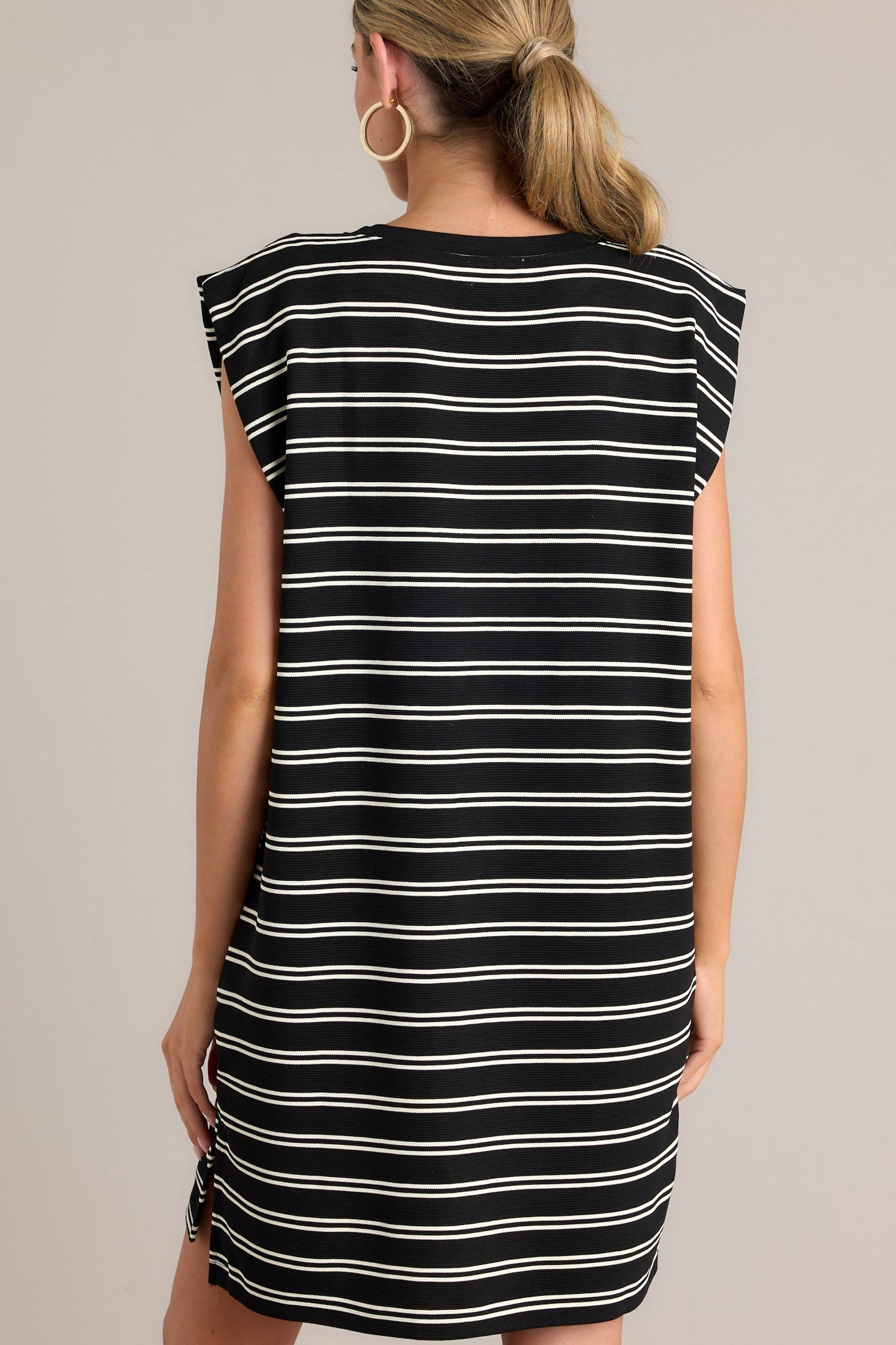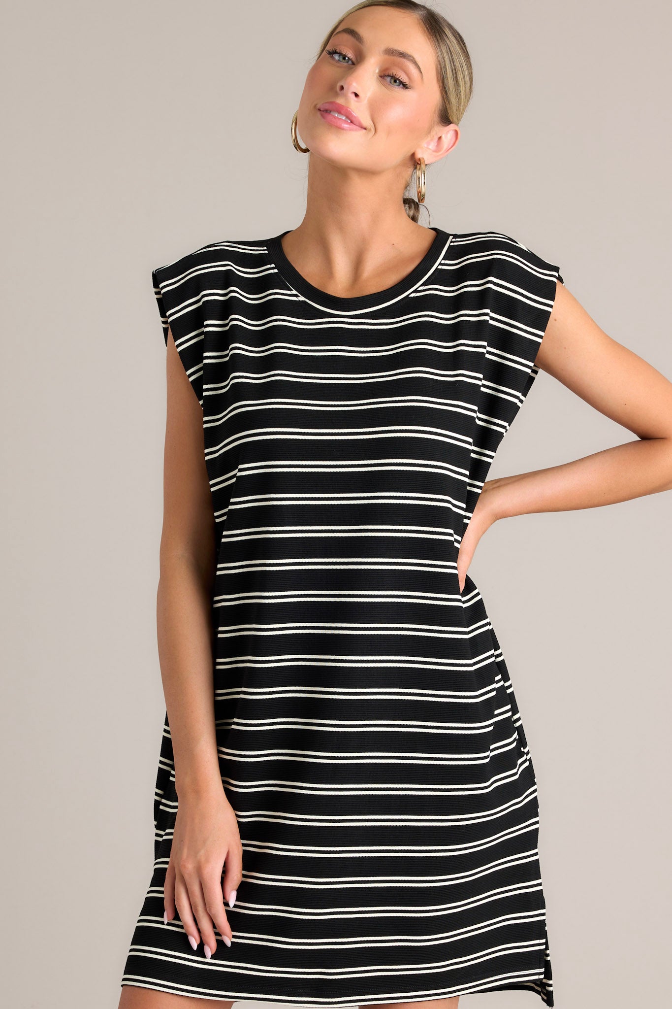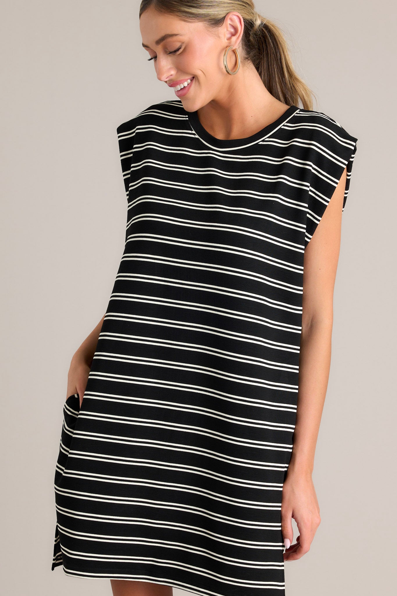 Sail away in style with the Vintage Voyage Black Stripe Cap Sleeve Mini Dress! This unique dress features a playful cap sleeve design and a trendy stripe pattern. Perfect for taking a trip to the beach or a day of shopping, this dress will have you looking chic and feeling comfortable. This black stripe mini dress features a crew neckline, short cap sleeves, a double stripe pattern, functional hip pockets, and a split hemline.